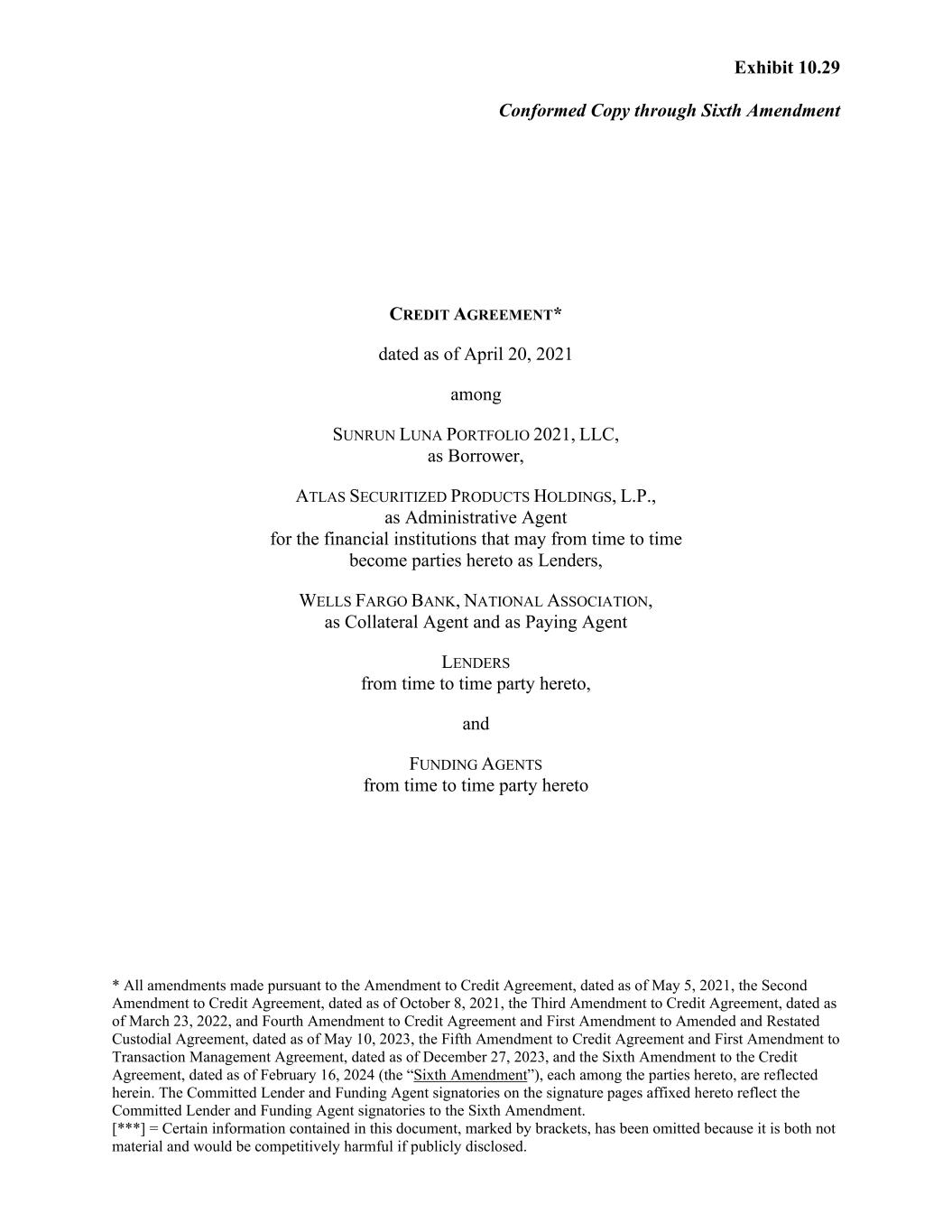 Exhibit 10.29 Conformed Copy through Sixth Amendment * All amendments made pursuant to the Amendment to Credit Agreement, dated as of May 5, 2021, the Second Amendment to Credit Agreement, dated as of October 8, 2021, the Third Amendment to Credit Agreement, dated as of March 23, 2022, and Fourth Amendment to Credit Agreement and First Amendment to Amended and Restated Custodial Agreement, dated as of May 10, 2023, the Fifth Amendment to Credit Agreement and First Amendment to Transaction Management Agreement, dated as of December 27, 2023, and the Sixth Amendment to the Credit Agreement, dated as of February 16, 2024 (the “Sixth Amendment”), each among the parties hereto, are reflected herein. The Committed Lender and Funding Agent signatories on the signature pages affixed hereto reflect the Committed Lender and Funding Agent signatories to the Sixth Amendment. [***] = Certain information contained in this document, marked by brackets, has been omitted because it is both not material and would be competitively harmful if publicly disclosed. CREDIT AGREEMENT* dated as of April 20, 2021 among SUNRUN LUNA PORTFOLIO 2021, LLC, as Borrower, ATLAS SECURITIZED PRODUCTS HOLDINGS, L.P., as Administrative Agent for the financial institutions that may from time to time become parties hereto as Lenders, WELLS FARGO BANK, NATIONAL ASSOCIATION, as Collateral Agent and as Paying Agent LENDERS from time to time party hereto, and FUNDING AGENTS from time to time party hereto