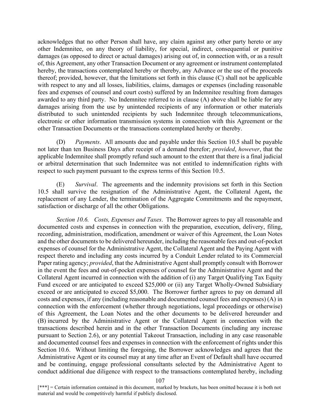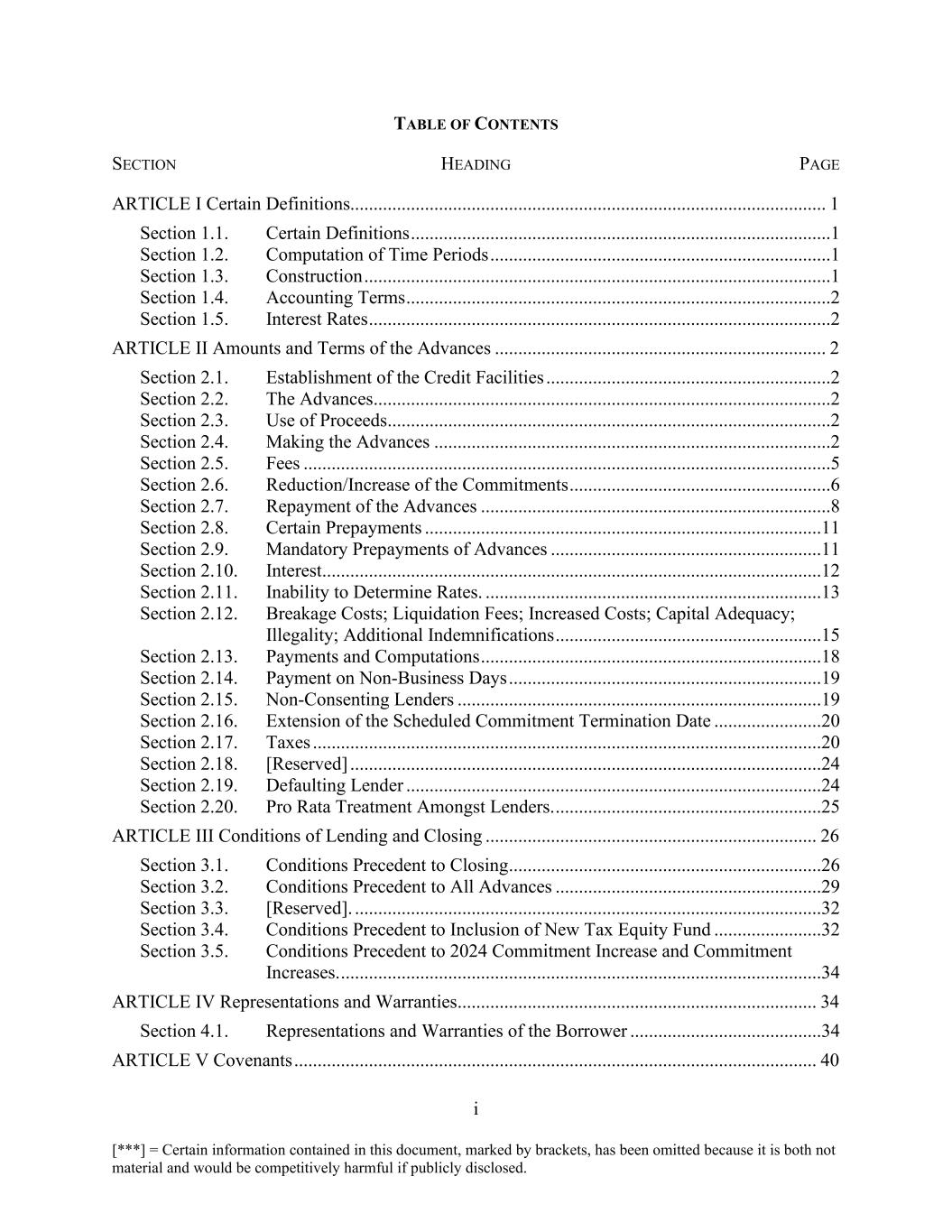 i [***] = Certain information contained in this document, marked by brackets, has been omitted because it is both not material and would be competitively harmful if publicly disclosed. TABLE OF CONTENTS SECTION HEADING PAGE ARTICLE I Certain Definitions...................................................................................................... 1 Section 1.1. Certain Definitions ..........................................................................................1 Section 1.2. Computation of Time Periods .........................................................................1 Section 1.3. Construction ....................................................................................................1 Section 1.4. Accounting Terms ...........................................................................................2 Section 1.5. Interest Rates ...................................................................................................2 ARTICLE II Amounts and Terms of the Advances ....................................................................... 2 Section 2.1. Establishment of the Credit Facilities .............................................................2 Section 2.2. The Advances..................................................................................................2 Section 2.3. Use of Proceeds...............................................................................................2 Section 2.4. Making the Advances .....................................................................................2 Section 2.5. Fees .................................................................................................................5 Section 2.6. Reduction/Increase of the Commitments ........................................................6 Section 2.7. Repayment of the Advances ...........................................................................8 Section 2.8. Certain Prepayments .....................................................................................11 Section 2.9. Mandatory Prepayments of Advances ..........................................................11 Section 2.10. Interest...........................................................................................................12 Section 2.11. Inability to Determine Rates. ........................................................................13 Section 2.12. Breakage Costs; Liquidation Fees; Increased Costs; Capital Adequacy; Illegality; Additional Indemnifications .........................................................15 Section 2.13. Payments and Computations .........................................................................18 Section 2.14. Payment on Non-Business Days ...................................................................19 Section 2.15. Non-Consenting Lenders ..............................................................................19 Section 2.16. Extension of the Scheduled Commitment Termination Date .......................20 Section 2.17. Taxes .............................................................................................................20 Section 2.18. [Reserved] .....................................................................................................24 Section 2.19. Defaulting Lender .........................................................................................24 Section 2.20. Pro Rata Treatment Amongst Lenders. .........................................................25 ARTICLE III Conditions of Lending and Closing ....................................................................... 26 Section 3.1. Conditions Precedent to Closing ...................................................................26 Section 3.2. Conditions Precedent to All Advances .........................................................29 Section 3.3. [Reserved]. ....................................................................................................32 Section 3.4. Conditions Precedent to Inclusion of New Tax Equity Fund .......................32 Section 3.5. Conditions Precedent to 2024 Commitment Increase and Commitment Increases. .......................................................................................................34 ARTICLE IV Representations and Warranties............................................................................. 34 Section 4.1. Representations and Warranties of the Borrower .........................................34 ARTICLE V Covenants ................................................................................................................ 40