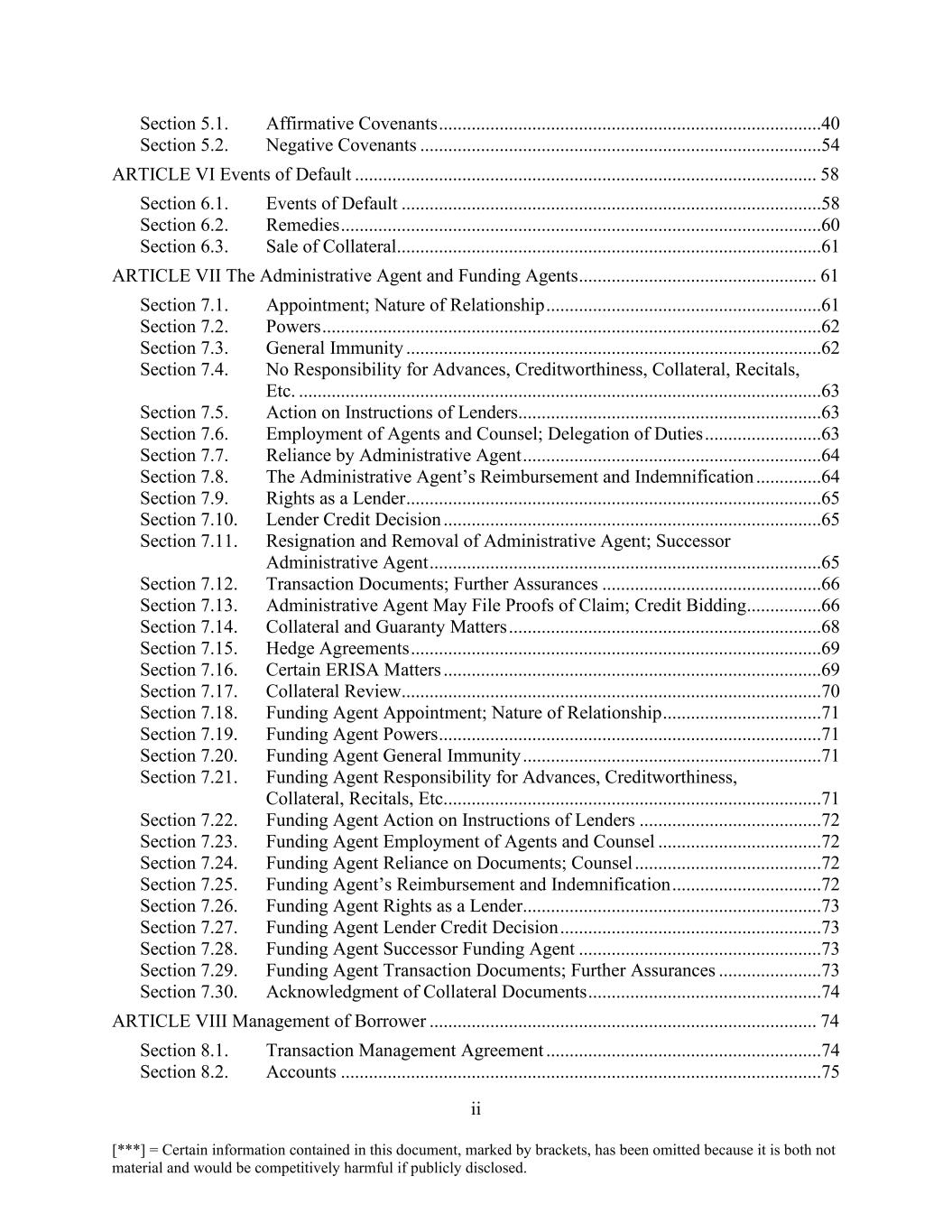 ii [***] = Certain information contained in this document, marked by brackets, has been omitted because it is both not material and would be competitively harmful if publicly disclosed. Section 5.1. Affirmative Covenants ..................................................................................40 Section 5.2. Negative Covenants ......................................................................................54 ARTICLE VI Events of Default ................................................................................................... 58 Section 6.1. Events of Default ..........................................................................................58 Section 6.2. Remedies .......................................................................................................60 Section 6.3. Sale of Collateral...........................................................................................61 ARTICLE VII The Administrative Agent and Funding Agents ................................................... 61 Section 7.1. Appointment; Nature of Relationship ...........................................................61 Section 7.2. Powers ...........................................................................................................62 Section 7.3. General Immunity .........................................................................................62 Section 7.4. No Responsibility for Advances, Creditworthiness, Collateral, Recitals, Etc. ................................................................................................................63 Section 7.5. Action on Instructions of Lenders.................................................................63 Section 7.6. Employment of Agents and Counsel; Delegation of Duties .........................63 Section 7.7. Reliance by Administrative Agent ................................................................64 Section 7.8. The Administrative Agent’s Reimbursement and Indemnification ..............64 Section 7.9. Rights as a Lender .........................................................................................65 Section 7.10. Lender Credit Decision .................................................................................65 Section 7.11. Resignation and Removal of Administrative Agent; Successor Administrative Agent ....................................................................................65 Section 7.12. Transaction Documents; Further Assurances ...............................................66 Section 7.13. Administrative Agent May File Proofs of Claim; Credit Bidding ................66 Section 7.14. Collateral and Guaranty Matters ...................................................................68 Section 7.15. Hedge Agreements ........................................................................................69 Section 7.16. Certain ERISA Matters .................................................................................69 Section 7.17. Collateral Review..........................................................................................70 Section 7.18. Funding Agent Appointment; Nature of Relationship ..................................71 Section 7.19. Funding Agent Powers ..................................................................................71 Section 7.20. Funding Agent General Immunity ................................................................71 Section 7.21. Funding Agent Responsibility for Advances, Creditworthiness, Collateral, Recitals, Etc.................................................................................71 Section 7.22. Funding Agent Action on Instructions of Lenders .......................................72 Section 7.23. Funding Agent Employment of Agents and Counsel ...................................72 Section 7.24. Funding Agent Reliance on Documents; Counsel ........................................72 Section 7.25. Funding Agent’s Reimbursement and Indemnification ................................72 Section 7.26. Funding Agent Rights as a Lender................................................................73 Section 7.27. Funding Agent Lender Credit Decision ........................................................73 Section 7.28. Funding Agent Successor Funding Agent ....................................................73 Section 7.29. Funding Agent Transaction Documents; Further Assurances ......................73 Section 7.30. Acknowledgment of Collateral Documents ..................................................74 ARTICLE VIII Management of Borrower ................................................................................... 74 Section 8.1. Transaction Management Agreement ...........................................................74 Section 8.2. Accounts .......................................................................................................75