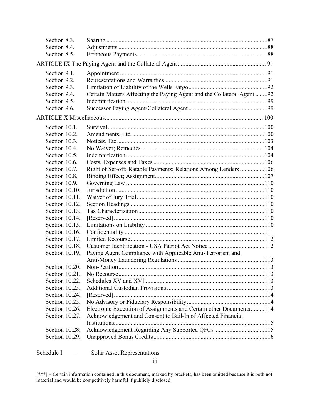 iii [***] = Certain information contained in this document, marked by brackets, has been omitted because it is both not material and would be competitively harmful if publicly disclosed. Section 8.3. Sharing ..........................................................................................................87 Section 8.4. Adjustments ..................................................................................................88 Section 8.5. Erroneous Payments......................................................................................88 ARTICLE IX The Paying Agent and the Collateral Agent .......................................................... 91 Section 9.1. Appointment .................................................................................................91 Section 9.2. Representations and Warranties ....................................................................91 Section 9.3. Limitation of Liability of the Wells Fargo ....................................................92 Section 9.4. Certain Matters Affecting the Paying Agent and the Collateral Agent ........92 Section 9.5. Indemnification .............................................................................................99 Section 9.6. Successor Paying Agent/Collateral Agent ....................................................99 ARTICLE X Miscellaneous ........................................................................................................ 100 Section 10.1. Survival .......................................................................................................100 Section 10.2. Amendments, Etc. .......................................................................................100 Section 10.3. Notices, Etc. ................................................................................................103 Section 10.4. No Waiver; Remedies .................................................................................104 Section 10.5. Indemnification ...........................................................................................104 Section 10.6. Costs, Expenses and Taxes .........................................................................106 Section 10.7. Right of Set-off; Ratable Payments; Relations Among Lenders ................106 Section 10.8. Binding Effect; Assignment ........................................................................107 Section 10.9. Governing Law ...........................................................................................110 Section 10.10. Jurisdiction ..................................................................................................110 Section 10.11. Waiver of Jury Trial ....................................................................................110 Section 10.12. Section Headings ........................................................................................110 Section 10.13. Tax Characterization ...................................................................................110 Section 10.14. [Reserved] ...................................................................................................110 Section 10.15. Limitations on Liability ..............................................................................110 Section 10.16. Confidentiality ............................................................................................111 Section 10.17. Limited Recourse ........................................................................................112 Section 10.18. Customer Identification - USA Patriot Act Notice .....................................112 Section 10.19. Paying Agent Compliance with Applicable Anti-Terrorism and Anti-Money Laundering Regulations .........................................................113 Section 10.20. Non-Petition ................................................................................................113 Section 10.21. No Recourse ................................................................................................113 Section 10.22. Schedules XV and XVI ...............................................................................113 Section 10.23. Additional Custodian Provisions ................................................................113 Section 10.24. [Reserved] ...................................................................................................114 Section 10.25. No Advisory or Fiduciary Responsibility ...................................................114 Section 10.26. Electronic Execution of Assignments and Certain other Documents .........114 Section 10.27. Acknowledgement and Consent to Bail-In of Affected Financial Institutions...................................................................................................115 Section 10.28. Acknowledgement Regarding Any Supported QFCs .................................115 Section 10.29. Unapproved Bonus Credits .........................................................................116 Schedule I – Solar Asset Representations