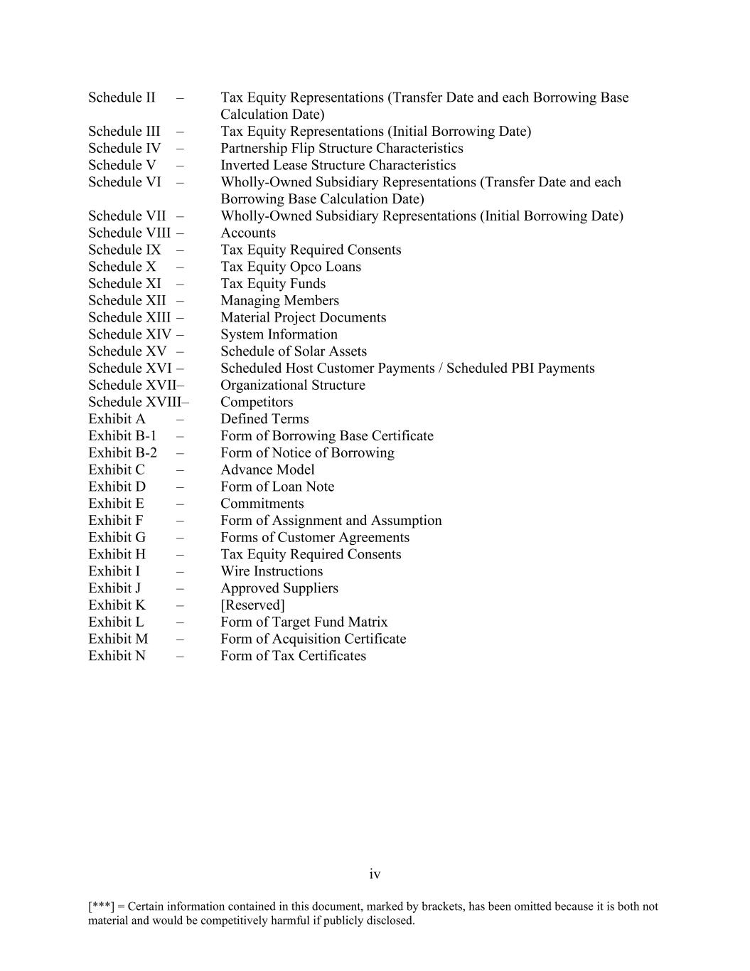 iv [***] = Certain information contained in this document, marked by brackets, has been omitted because it is both not material and would be competitively harmful if publicly disclosed. Schedule II – Tax Equity Representations (Transfer Date and each Borrowing Base Calculation Date) Schedule III – Tax Equity Representations (Initial Borrowing Date) Schedule IV – Partnership Flip Structure Characteristics Schedule V – Inverted Lease Structure Characteristics Schedule VI – Wholly-Owned Subsidiary Representations (Transfer Date and each Borrowing Base Calculation Date) Schedule VII – Wholly-Owned Subsidiary Representations (Initial Borrowing Date) Schedule VIII – Accounts Schedule IX – Tax Equity Required Consents Schedule X – Tax Equity Opco Loans Schedule XI – Tax Equity Funds Schedule XII – Managing Members Schedule XIII – Material Project Documents Schedule XIV – System Information Schedule XV – Schedule of Solar Assets Schedule XVI – Scheduled Host Customer Payments / Scheduled PBI Payments Schedule XVII– Organizational Structure Schedule XVIII– Competitors Exhibit A – Defined Terms Exhibit B-1 – Form of Borrowing Base Certificate Exhibit B-2 – Form of Notice of Borrowing Exhibit C – Advance Model Exhibit D – Form of Loan Note Exhibit E – Commitments Exhibit F – Form of Assignment and Assumption Exhibit G – Forms of Customer Agreements Exhibit H – Tax Equity Required Consents Exhibit I – Wire Instructions Exhibit J – Approved Suppliers Exhibit K – [Reserved] Exhibit L – Form of Target Fund Matrix Exhibit M – Form of Acquisition Certificate Exhibit N – Form of Tax Certificates