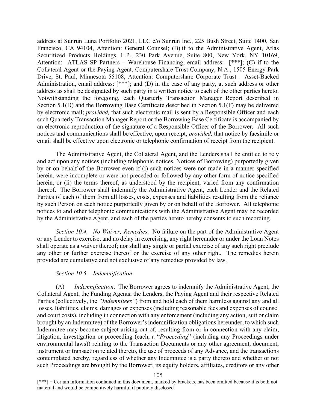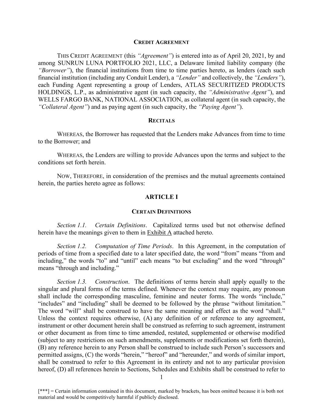 1 [***] = Certain information contained in this document, marked by brackets, has been omitted because it is both not material and would be competitively harmful if publicly disclosed. CREDIT AGREEMENT THIS CREDIT AGREEMENT (this “Agreement”) is entered into as of April 20, 2021, by and among SUNRUN LUNA PORTFOLIO 2021, LLC, a Delaware limited liability company (the “Borrower”), the financial institutions from time to time parties hereto, as lenders (each such financial institution (including any Conduit Lender), a “Lender” and collectively, the “Lenders”), each Funding Agent representing a group of Lenders, ATLAS SECURITIZED PRODUCTS HOLDINGS, L.P., as administrative agent (in such capacity, the “Administrative Agent”), and WELLS FARGO BANK, NATIONAL ASSOCIATION, as collateral agent (in such capacity, the “Collateral Agent”) and as paying agent (in such capacity, the “Paying Agent”). RECITALS WHEREAS, the Borrower has requested that the Lenders make Advances from time to time to the Borrower; and WHEREAS, the Lenders are willing to provide Advances upon the terms and subject to the conditions set forth herein. NOW, THEREFORE, in consideration of the premises and the mutual agreements contained herein, the parties hereto agree as follows: ARTICLE I CERTAIN DEFINITIONS Section 1.1. Certain Definitions. Capitalized terms used but not otherwise defined herein have the meanings given to them in Exhibit A attached hereto. Section 1.2. Computation of Time Periods. In this Agreement, in the computation of periods of time from a specified date to a later specified date, the word “from” means “from and including,” the words “to” and “until” each means “to but excluding” and the word “through” means “through and including.” Section 1.3. Construction. The definitions of terms herein shall apply equally to the singular and plural forms of the terms defined. Whenever the context may require, any pronoun shall include the corresponding masculine, feminine and neuter forms. The words “include,” “includes” and “including” shall be deemed to be followed by the phrase “without limitation.” The word “will” shall be construed to have the same meaning and effect as the word “shall.” Unless the context requires otherwise, (A) any definition of or reference to any agreement, instrument or other document herein shall be construed as referring to such agreement, instrument or other document as from time to time amended, restated, supplemented or otherwise modified (subject to any restrictions on such amendments, supplements or modifications set forth therein), (B) any reference herein to any Person shall be construed to include such Person’s successors and permitted assigns, (C) the words “herein,” “hereof” and “hereunder,” and words of similar import, shall be construed to refer to this Agreement in its entirety and not to any particular provision hereof, (D) all references herein to Sections, Schedules and Exhibits shall be construed to refer to