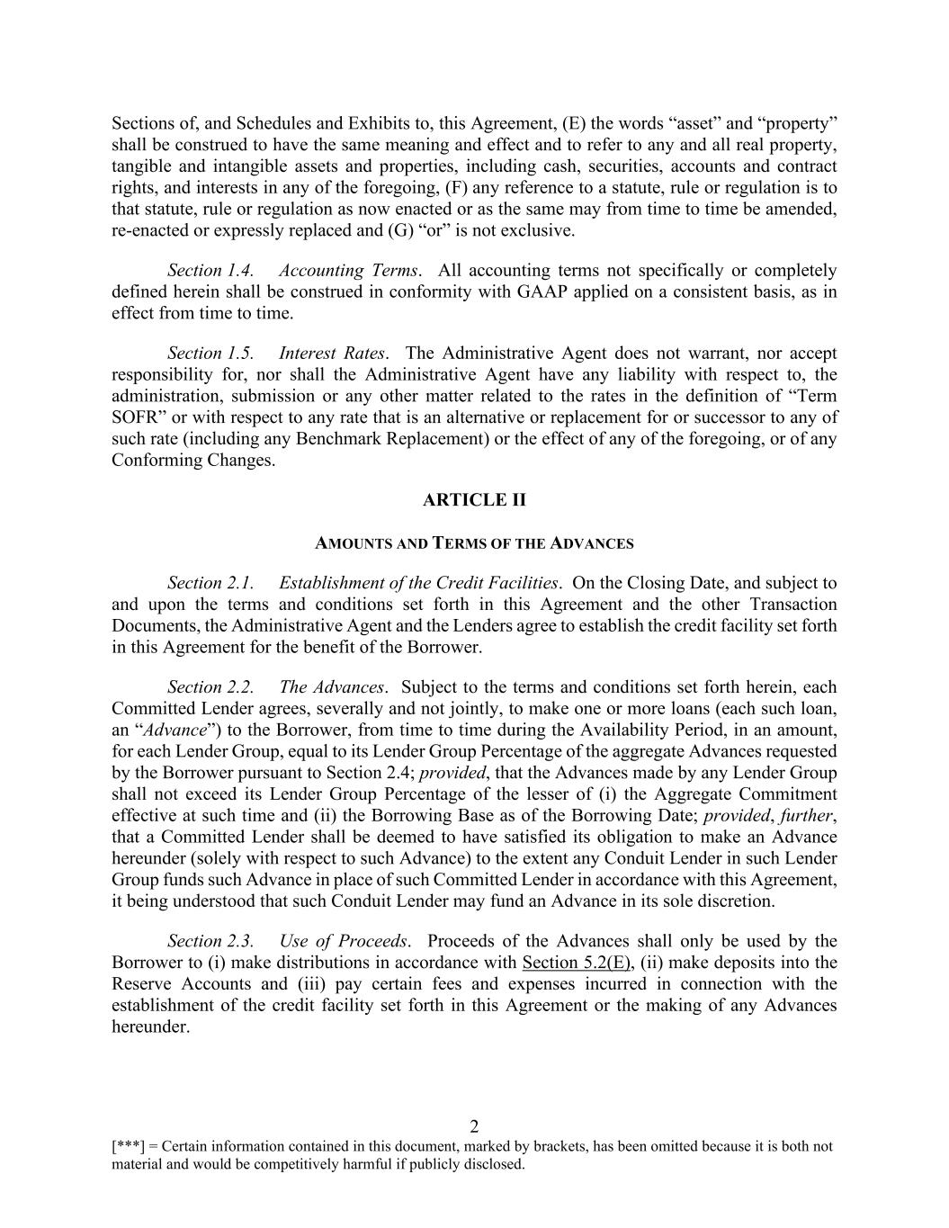 2 [***] = Certain information contained in this document, marked by brackets, has been omitted because it is both not material and would be competitively harmful if publicly disclosed. Sections of, and Schedules and Exhibits to, this Agreement, (E) the words “asset” and “property” shall be construed to have the same meaning and effect and to refer to any and all real property, tangible and intangible assets and properties, including cash, securities, accounts and contract rights, and interests in any of the foregoing, (F) any reference to a statute, rule or regulation is to that statute, rule or regulation as now enacted or as the same may from time to time be amended, re-enacted or expressly replaced and (G) “or” is not exclusive. Section 1.4. Accounting Terms. All accounting terms not specifically or completely defined herein shall be construed in conformity with GAAP applied on a consistent basis, as in effect from time to time. Section 1.5. Interest Rates. The Administrative Agent does not warrant, nor accept responsibility for, nor shall the Administrative Agent have any liability with respect to, the administration, submission or any other matter related to the rates in the definition of “Term SOFR” or with respect to any rate that is an alternative or replacement for or successor to any of such rate (including any Benchmark Replacement) or the effect of any of the foregoing, or of any Conforming Changes. ARTICLE II AMOUNTS AND TERMS OF THE ADVANCES Section 2.1. Establishment of the Credit Facilities. On the Closing Date, and subject to and upon the terms and conditions set forth in this Agreement and the other Transaction Documents, the Administrative Agent and the Lenders agree to establish the credit facility set forth in this Agreement for the benefit of the Borrower. Section 2.2. The Advances. Subject to the terms and conditions set forth herein, each Committed Lender agrees, severally and not jointly, to make one or more loans (each such loan, an “Advance”) to the Borrower, from time to time during the Availability Period, in an amount, for each Lender Group, equal to its Lender Group Percentage of the aggregate Advances requested by the Borrower pursuant to Section 2.4; provided, that the Advances made by any Lender Group shall not exceed its Lender Group Percentage of the lesser of (i) the Aggregate Commitment effective at such time and (ii) the Borrowing Base as of the Borrowing Date; provided, further, that a Committed Lender shall be deemed to have satisfied its obligation to make an Advance hereunder (solely with respect to such Advance) to the extent any Conduit Lender in such Lender Group funds such Advance in place of such Committed Lender in accordance with this Agreement, it being understood that such Conduit Lender may fund an Advance in its sole discretion. Section 2.3. Use of Proceeds. Proceeds of the Advances shall only be used by the Borrower to (i) make distributions in accordance with Section 5.2(E), (ii) make deposits into the Reserve Accounts and (iii) pay certain fees and expenses incurred in connection with the establishment of the credit facility set forth in this Agreement or the making of any Advances hereunder.