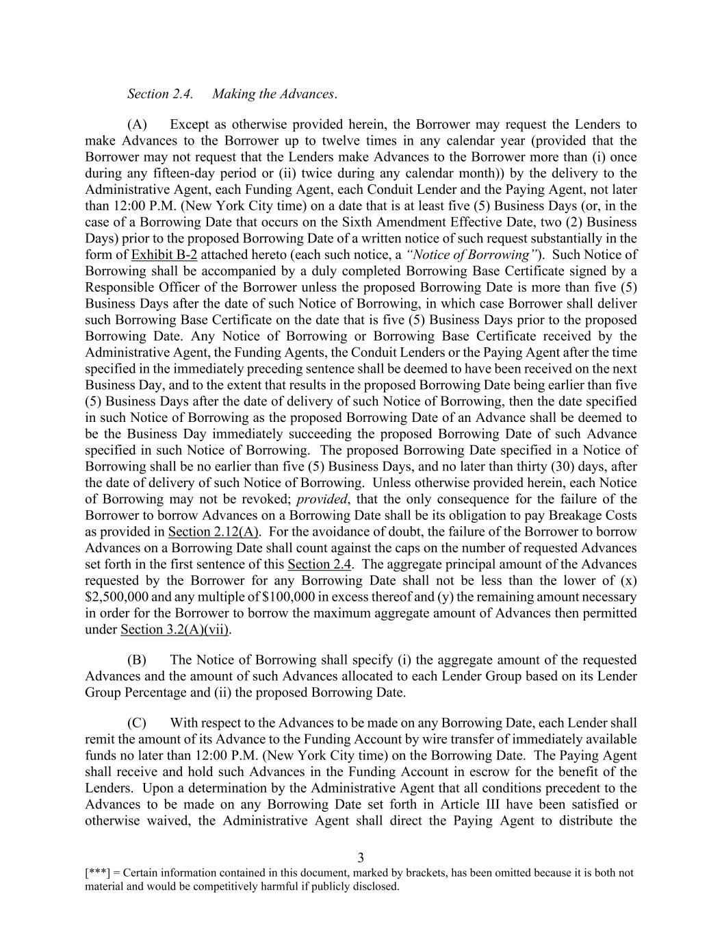 3 [***] = Certain information contained in this document, marked by brackets, has been omitted because it is both not material and would be competitively harmful if publicly disclosed. Section 2.4. Making the Advances. (A) Except as otherwise provided herein, the Borrower may request the Lenders to make Advances to the Borrower up to twelve times in any calendar year (provided that the Borrower may not request that the Lenders make Advances to the Borrower more than (i) once during any fifteen-day period or (ii) twice during any calendar month)) by the delivery to the Administrative Agent, each Funding Agent, each Conduit Lender and the Paying Agent, not later than 12:00 P.M. (New York City time) on a date that is at least five (5) Business Days (or, in the case of a Borrowing Date that occurs on the Sixth Amendment Effective Date, two (2) Business Days) prior to the proposed Borrowing Date of a written notice of such request substantially in the form of Exhibit B-2 attached hereto (each such notice, a “Notice of Borrowing”). Such Notice of Borrowing shall be accompanied by a duly completed Borrowing Base Certificate signed by a Responsible Officer of the Borrower unless the proposed Borrowing Date is more than five (5) Business Days after the date of such Notice of Borrowing, in which case Borrower shall deliver such Borrowing Base Certificate on the date that is five (5) Business Days prior to the proposed Borrowing Date. Any Notice of Borrowing or Borrowing Base Certificate received by the Administrative Agent, the Funding Agents, the Conduit Lenders or the Paying Agent after the time specified in the immediately preceding sentence shall be deemed to have been received on the next Business Day, and to the extent that results in the proposed Borrowing Date being earlier than five (5) Business Days after the date of delivery of such Notice of Borrowing, then the date specified in such Notice of Borrowing as the proposed Borrowing Date of an Advance shall be deemed to be the Business Day immediately succeeding the proposed Borrowing Date of such Advance specified in such Notice of Borrowing. The proposed Borrowing Date specified in a Notice of Borrowing shall be no earlier than five (5) Business Days, and no later than thirty (30) days, after the date of delivery of such Notice of Borrowing. Unless otherwise provided herein, each Notice of Borrowing may not be revoked; provided, that the only consequence for the failure of the Borrower to borrow Advances on a Borrowing Date shall be its obligation to pay Breakage Costs as provided in Section 2.12(A). For the avoidance of doubt, the failure of the Borrower to borrow Advances on a Borrowing Date shall count against the caps on the number of requested Advances set forth in the first sentence of this Section 2.4. The aggregate principal amount of the Advances requested by the Borrower for any Borrowing Date shall not be less than the lower of (x) $2,500,000 and any multiple of $100,000 in excess thereof and (y) the remaining amount necessary in order for the Borrower to borrow the maximum aggregate amount of Advances then permitted under Section 3.2(A)(vii). (B) The Notice of Borrowing shall specify (i) the aggregate amount of the requested Advances and the amount of such Advances allocated to each Lender Group based on its Lender Group Percentage and (ii) the proposed Borrowing Date. (C) With respect to the Advances to be made on any Borrowing Date, each Lender shall remit the amount of its Advance to the Funding Account by wire transfer of immediately available funds no later than 12:00 P.M. (New York City time) on the Borrowing Date. The Paying Agent shall receive and hold such Advances in the Funding Account in escrow for the benefit of the Lenders. Upon a determination by the Administrative Agent that all conditions precedent to the Advances to be made on any Borrowing Date set forth in Article III have been satisfied or otherwise waived, the Administrative Agent shall direct the Paying Agent to distribute the