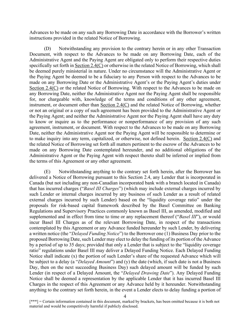 4 [***] = Certain information contained in this document, marked by brackets, has been omitted because it is both not material and would be competitively harmful if publicly disclosed. Advances to be made on any such any Borrowing Date in accordance with the Borrower’s written instructions provided in the related Notice of Borrowing. (D) Notwithstanding any provision to the contrary herein or in any other Transaction Document, with respect to the Advances to be made on any Borrowing Date, each of the Administrative Agent and the Paying Agent are obligated only to perform their respective duties specifically set forth in Section 2.4(C) or otherwise in the related Notice of Borrowing, which shall be deemed purely ministerial in nature. Under no circumstance will the Administrative Agent or the Paying Agent be deemed to be a fiduciary to any Person with respect to the Advances to be made on any Borrowing Date or the Administrative Agent’s or the Paying Agent’s duties under Section 2.4(C) or the related Notice of Borrowing. With respect to the Advances to be made on any Borrowing Date, neither the Administrative Agent nor the Paying Agent shall be responsible for, nor chargeable with, knowledge of the terms and conditions of any other agreement, instrument, or document other than Section 2.4(C) and the related Notice of Borrowing, whether or not an original or a copy of such agreement has been provided to the Administrative Agent or the Paying Agent; and neither the Administrative Agent nor the Paying Agent shall have any duty to know or inquire as to the performance or nonperformance of any provision of any such agreement, instrument, or document. With respect to the Advances to be made on any Borrowing Date, neither the Administrative Agent nor the Paying Agent will be responsible to determine or to make inquiry into any term, capitalized, or otherwise, not defined herein. Section 2.4(C) and the related Notice of Borrowing set forth all matters pertinent to the escrow of the Advances to be made on any Borrowing Date contemplated hereunder, and no additional obligations of the Administrative Agent or the Paying Agent with respect thereto shall be inferred or implied from the terms of this Agreement or any other agreement. (E) Notwithstanding anything to the contrary set forth herein, after the Borrower has delivered a Notice of Borrowing pursuant to this Section 2.4, any Lender that is incorporated in Canada (but not including any non-Canadian incorporated bank with a branch located in Canada) that has incurred charges (“Basel III Charges”) (which may include external charges incurred by such Lender or internal charges incurred by any business of such Lender as a result of related external charges incurred by such Lender) based on the “liquidity coverage ratio” under the proposals for risk-based capital framework described by the Basel Committee on Banking Regulations and Supervisory Practices commonly known as Basel III, as amended, modified and supplemented and in effect from time to time or any replacement thereof (“Basel III”), or would incur Basel III Charges as of the relevant Borrowing Date, in respect of the transactions contemplated by this Agreement or any Advance funded hereunder by such Lender, by delivering a written notice (the “Delayed Funding Notice”) to the Borrower one (1) Business Day prior to the proposed Borrowing Date, such Lender may elect to delay the funding of its portion of the Advance by a period of up to 35 days; provided that only a Lender that is subject to the “liquidity coverage ratio” regulations under Basel III may deliver a Delayed Funding Notice. Each Delayed Funding Notice shall indicate (x) the portion of such Lender’s share of the requested Advance which will be subject to a delay (a “Delayed Amount”) and (y) the date (which, if such date is not a Business Day, then on the next succeeding Business Day) such delayed amount will be funded by such Lender (in respect of a Delayed Amount, the “Delayed Drawing Date”). Any Delayed Funding Notice shall be deemed a representation by the applicable Lender that it has incurred Basel III Charges in the respect of this Agreement or any Advance held by it hereunder. Notwithstanding anything to the contrary set forth herein, in the event a Lender elects to delay funding a portion of