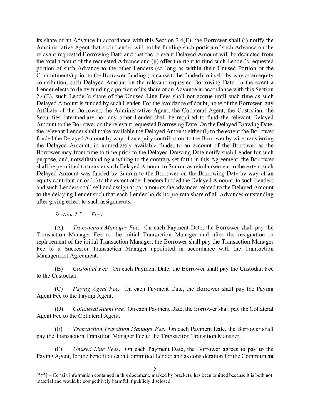 5 [***] = Certain information contained in this document, marked by brackets, has been omitted because it is both not material and would be competitively harmful if publicly disclosed. its share of an Advance in accordance with this Section 2.4(E), the Borrower shall (i) notify the Administrative Agent that such Lender will not be funding such portion of such Advance on the relevant requested Borrowing Date and that the relevant Delayed Amount will be deducted from the total amount of the requested Advance and (ii) offer the right to fund such Lender’s requested portion of such Advance to the other Lenders (so long as within their Unused Portion of the Commitments) prior to the Borrower funding (or cause to be funded) to itself, by way of an equity contribution, such Delayed Amount on the relevant requested Borrowing Date. In the event a Lender elects to delay funding a portion of its share of an Advance in accordance with this Section 2.4(E), such Lender’s share of the Unused Line Fees shall not accrue until such time as such Delayed Amount is funded by such Lender. For the avoidance of doubt, none of the Borrower, any Affiliate of the Borrower, the Administrative Agent, the Collateral Agent, the Custodian, the Securities Intermediary nor any other Lender shall be required to fund the relevant Delayed Amount to the Borrower on the relevant requested Borrowing Date. On the Delayed Drawing Date, the relevant Lender shall make available the Delayed Amount either (i) to the extent the Borrower funded the Delayed Amount by way of an equity contribution, to the Borrower by wire transferring the Delayed Amount, in immediately available funds, to an account of the Borrower as the Borrower may from time to time prior to the Delayed Drawing Date notify such Lender for such purpose, and, notwithstanding anything to the contrary set forth in this Agreement, the Borrower shall be permitted to transfer such Delayed Amount to Sunrun as reimbursement to the extent such Delayed Amount was funded by Sunrun to the Borrower on the Borrowing Date by way of an equity contribution or (ii) to the extent other Lenders funded the Delayed Amount, to such Lenders and such Lenders shall sell and assign at par amounts the advances related to the Delayed Amount to the delaying Lender such that each Lender holds its pro rata share of all Advances outstanding after giving effect to such assignments. Section 2.5. Fees. (A) Transaction Manager Fee. On each Payment Date, the Borrower shall pay the Transaction Manager Fee to the initial Transaction Manager and after the resignation or replacement of the initial Transaction Manager, the Borrower shall pay the Transaction Manager Fee to a Successor Transaction Manager appointed in accordance with the Transaction Management Agreement. (B) Custodial Fee. On each Payment Date, the Borrower shall pay the Custodial Fee to the Custodian. (C) Paying Agent Fee. On each Payment Date, the Borrower shall pay the Paying Agent Fee to the Paying Agent. (D) Collateral Agent Fee. On each Payment Date, the Borrower shall pay the Collateral Agent Fee to the Collateral Agent. (E) Transaction Transition Manager Fee. On each Payment Date, the Borrower shall pay the Transaction Transition Manager Fee to the Transaction Transition Manager. (F) Unused Line Fees. On each Payment Date, the Borrower agrees to pay to the Paying Agent, for the benefit of each Committed Lender and as consideration for the Commitment
