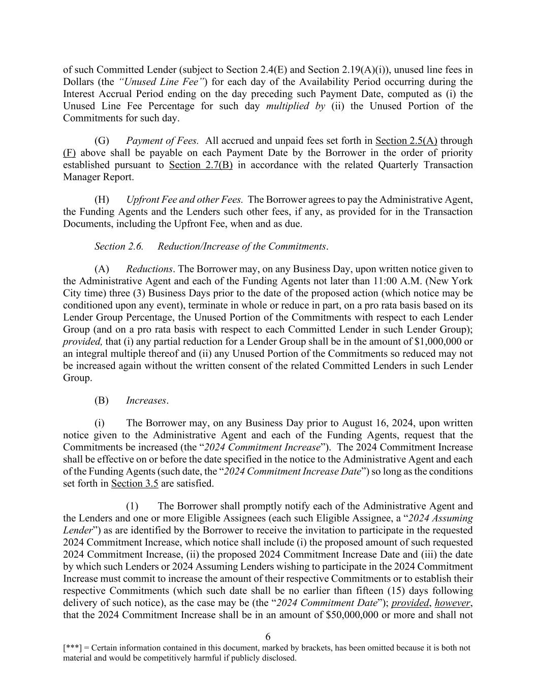 6 [***] = Certain information contained in this document, marked by brackets, has been omitted because it is both not material and would be competitively harmful if publicly disclosed. of such Committed Lender (subject to Section 2.4(E) and Section 2.19(A)(i)), unused line fees in Dollars (the “Unused Line Fee”) for each day of the Availability Period occurring during the Interest Accrual Period ending on the day preceding such Payment Date, computed as (i) the Unused Line Fee Percentage for such day multiplied by (ii) the Unused Portion of the Commitments for such day. (G) Payment of Fees. All accrued and unpaid fees set forth in Section 2.5(A) through (F) above shall be payable on each Payment Date by the Borrower in the order of priority established pursuant to Section 2.7(B) in accordance with the related Quarterly Transaction Manager Report. (H) Upfront Fee and other Fees. The Borrower agrees to pay the Administrative Agent, the Funding Agents and the Lenders such other fees, if any, as provided for in the Transaction Documents, including the Upfront Fee, when and as due. Section 2.6. Reduction/Increase of the Commitments. (A) Reductions. The Borrower may, on any Business Day, upon written notice given to the Administrative Agent and each of the Funding Agents not later than 11:00 A.M. (New York City time) three (3) Business Days prior to the date of the proposed action (which notice may be conditioned upon any event), terminate in whole or reduce in part, on a pro rata basis based on its Lender Group Percentage, the Unused Portion of the Commitments with respect to each Lender Group (and on a pro rata basis with respect to each Committed Lender in such Lender Group); provided, that (i) any partial reduction for a Lender Group shall be in the amount of $1,000,000 or an integral multiple thereof and (ii) any Unused Portion of the Commitments so reduced may not be increased again without the written consent of the related Committed Lenders in such Lender Group. (B) Increases. (i) The Borrower may, on any Business Day prior to August 16, 2024, upon written notice given to the Administrative Agent and each of the Funding Agents, request that the Commitments be increased (the “2024 Commitment Increase”). The 2024 Commitment Increase shall be effective on or before the date specified in the notice to the Administrative Agent and each of the Funding Agents (such date, the “2024 Commitment Increase Date”) so long as the conditions set forth in Section 3.5 are satisfied. (1) The Borrower shall promptly notify each of the Administrative Agent and the Lenders and one or more Eligible Assignees (each such Eligible Assignee, a “2024 Assuming Lender”) as are identified by the Borrower to receive the invitation to participate in the requested 2024 Commitment Increase, which notice shall include (i) the proposed amount of such requested 2024 Commitment Increase, (ii) the proposed 2024 Commitment Increase Date and (iii) the date by which such Lenders or 2024 Assuming Lenders wishing to participate in the 2024 Commitment Increase must commit to increase the amount of their respective Commitments or to establish their respective Commitments (which such date shall be no earlier than fifteen (15) days following delivery of such notice), as the case may be (the “2024 Commitment Date”); provided, however, that the 2024 Commitment Increase shall be in an amount of $50,000,000 or more and shall not