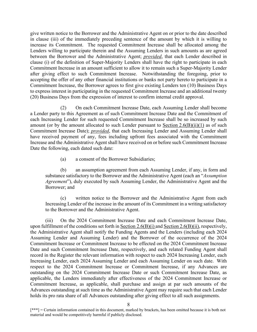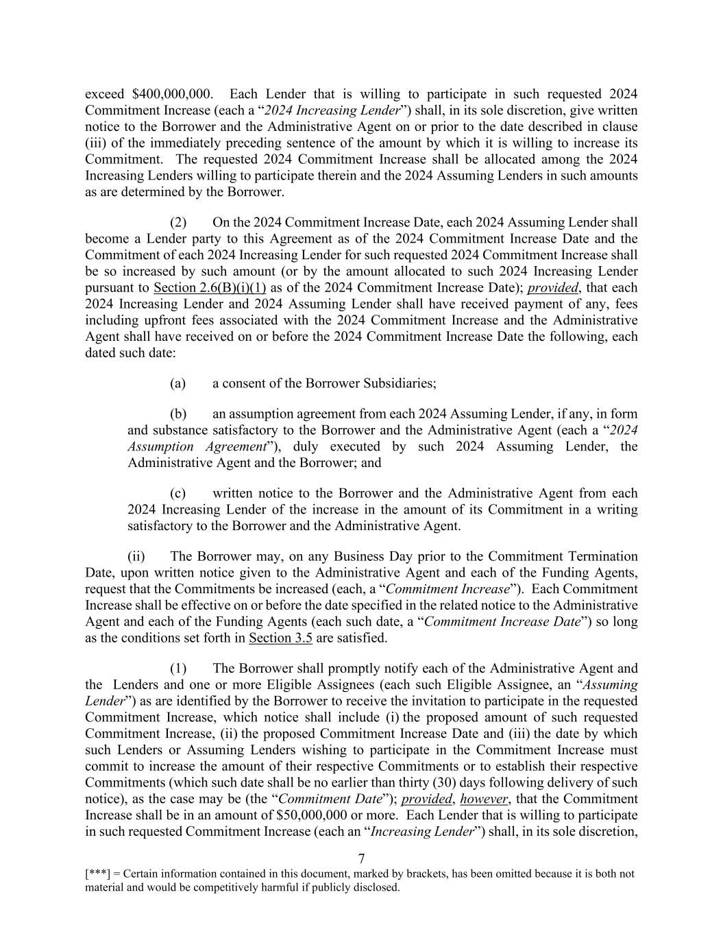 7 [***] = Certain information contained in this document, marked by brackets, has been omitted because it is both not material and would be competitively harmful if publicly disclosed. exceed $400,000,000. Each Lender that is willing to participate in such requested 2024 Commitment Increase (each a “2024 Increasing Lender”) shall, in its sole discretion, give written notice to the Borrower and the Administrative Agent on or prior to the date described in clause (iii) of the immediately preceding sentence of the amount by which it is willing to increase its Commitment. The requested 2024 Commitment Increase shall be allocated among the 2024 Increasing Lenders willing to participate therein and the 2024 Assuming Lenders in such amounts as are determined by the Borrower. (2) On the 2024 Commitment Increase Date, each 2024 Assuming Lender shall become a Lender party to this Agreement as of the 2024 Commitment Increase Date and the Commitment of each 2024 Increasing Lender for such requested 2024 Commitment Increase shall be so increased by such amount (or by the amount allocated to such 2024 Increasing Lender pursuant to Section 2.6(B)(i)(1) as of the 2024 Commitment Increase Date); provided, that each 2024 Increasing Lender and 2024 Assuming Lender shall have received payment of any, fees including upfront fees associated with the 2024 Commitment Increase and the Administrative Agent shall have received on or before the 2024 Commitment Increase Date the following, each dated such date: (a) a consent of the Borrower Subsidiaries; (b) an assumption agreement from each 2024 Assuming Lender, if any, in form and substance satisfactory to the Borrower and the Administrative Agent (each a “2024 Assumption Agreement”), duly executed by such 2024 Assuming Lender, the Administrative Agent and the Borrower; and (c) written notice to the Borrower and the Administrative Agent from each 2024 Increasing Lender of the increase in the amount of its Commitment in a writing satisfactory to the Borrower and the Administrative Agent. (ii) The Borrower may, on any Business Day prior to the Commitment Termination Date, upon written notice given to the Administrative Agent and each of the Funding Agents, request that the Commitments be increased (each, a “Commitment Increase”). Each Commitment Increase shall be effective on or before the date specified in the related notice to the Administrative Agent and each of the Funding Agents (each such date, a “Commitment Increase Date”) so long as the conditions set forth in Section 3.5 are satisfied. (1) The Borrower shall promptly notify each of the Administrative Agent and the Lenders and one or more Eligible Assignees (each such Eligible Assignee, an “Assuming Lender”) as are identified by the Borrower to receive the invitation to participate in the requested Commitment Increase, which notice shall include (i) the proposed amount of such requested Commitment Increase, (ii) the proposed Commitment Increase Date and (iii) the date by which such Lenders or Assuming Lenders wishing to participate in the Commitment Increase must commit to increase the amount of their respective Commitments or to establish their respective Commitments (which such date shall be no earlier than thirty (30) days following delivery of such notice), as the case may be (the “Commitment Date”); provided, however, that the Commitment Increase shall be in an amount of $50,000,000 or more. Each Lender that is willing to participate in such requested Commitment Increase (each an “Increasing Lender”) shall, in its sole discretion,
