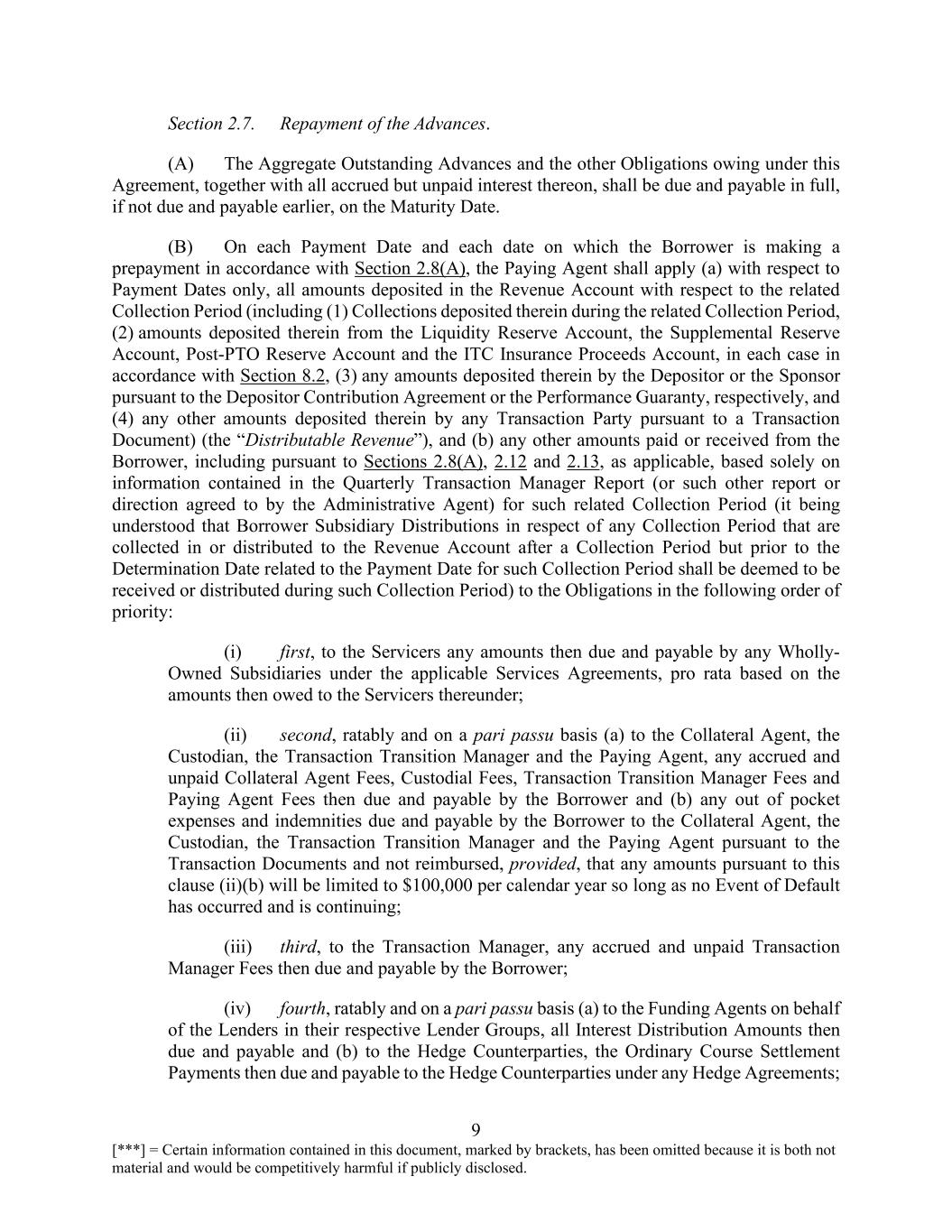 9 [***] = Certain information contained in this document, marked by brackets, has been omitted because it is both not material and would be competitively harmful if publicly disclosed. Section 2.7. Repayment of the Advances. (A) The Aggregate Outstanding Advances and the other Obligations owing under this Agreement, together with all accrued but unpaid interest thereon, shall be due and payable in full, if not due and payable earlier, on the Maturity Date. (B) On each Payment Date and each date on which the Borrower is making a prepayment in accordance with Section 2.8(A), the Paying Agent shall apply (a) with respect to Payment Dates only, all amounts deposited in the Revenue Account with respect to the related Collection Period (including (1) Collections deposited therein during the related Collection Period, (2) amounts deposited therein from the Liquidity Reserve Account, the Supplemental Reserve Account, Post-PTO Reserve Account and the ITC Insurance Proceeds Account, in each case in accordance with Section 8.2, (3) any amounts deposited therein by the Depositor or the Sponsor pursuant to the Depositor Contribution Agreement or the Performance Guaranty, respectively, and (4) any other amounts deposited therein by any Transaction Party pursuant to a Transaction Document) (the “Distributable Revenue”), and (b) any other amounts paid or received from the Borrower, including pursuant to Sections 2.8(A), 2.12 and 2.13, as applicable, based solely on information contained in the Quarterly Transaction Manager Report (or such other report or direction agreed to by the Administrative Agent) for such related Collection Period (it being understood that Borrower Subsidiary Distributions in respect of any Collection Period that are collected in or distributed to the Revenue Account after a Collection Period but prior to the Determination Date related to the Payment Date for such Collection Period shall be deemed to be received or distributed during such Collection Period) to the Obligations in the following order of priority: (i) first, to the Servicers any amounts then due and payable by any Wholly- Owned Subsidiaries under the applicable Services Agreements, pro rata based on the amounts then owed to the Servicers thereunder; (ii) second, ratably and on a pari passu basis (a) to the Collateral Agent, the Custodian, the Transaction Transition Manager and the Paying Agent, any accrued and unpaid Collateral Agent Fees, Custodial Fees, Transaction Transition Manager Fees and Paying Agent Fees then due and payable by the Borrower and (b) any out of pocket expenses and indemnities due and payable by the Borrower to the Collateral Agent, the Custodian, the Transaction Transition Manager and the Paying Agent pursuant to the Transaction Documents and not reimbursed, provided, that any amounts pursuant to this clause (ii)(b) will be limited to $100,000 per calendar year so long as no Event of Default has occurred and is continuing; (iii) third, to the Transaction Manager, any accrued and unpaid Transaction Manager Fees then due and payable by the Borrower; (iv) fourth, ratably and on a pari passu basis (a) to the Funding Agents on behalf of the Lenders in their respective Lender Groups, all Interest Distribution Amounts then due and payable and (b) to the Hedge Counterparties, the Ordinary Course Settlement Payments then due and payable to the Hedge Counterparties under any Hedge Agreements;