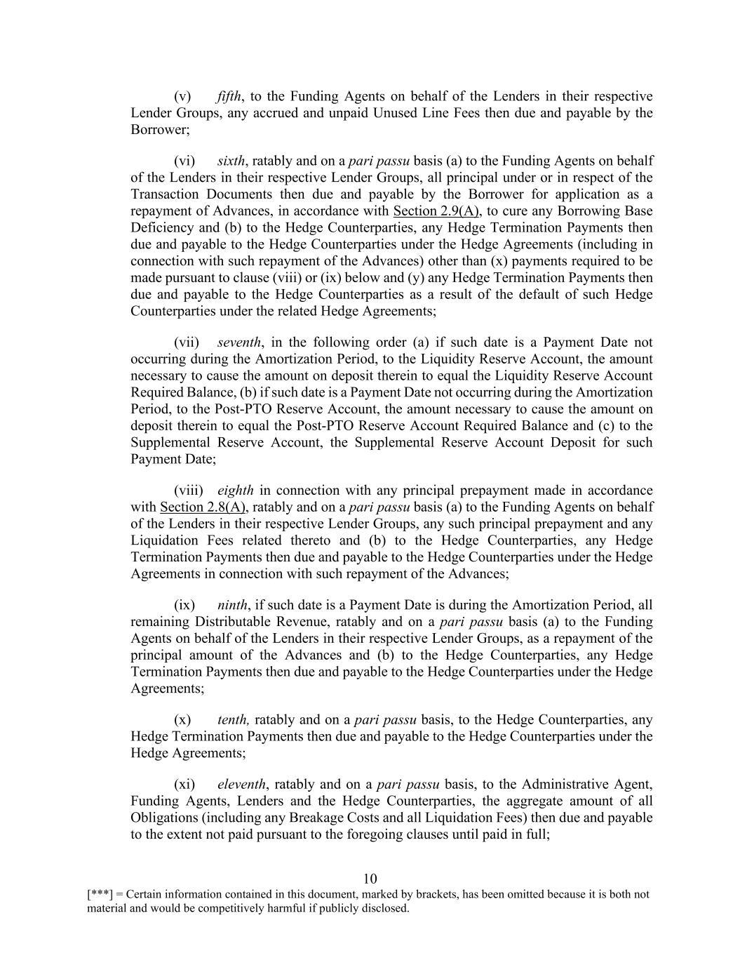 10 [***] = Certain information contained in this document, marked by brackets, has been omitted because it is both not material and would be competitively harmful if publicly disclosed. (v) fifth, to the Funding Agents on behalf of the Lenders in their respective Lender Groups, any accrued and unpaid Unused Line Fees then due and payable by the Borrower; (vi) sixth, ratably and on a pari passu basis (a) to the Funding Agents on behalf of the Lenders in their respective Lender Groups, all principal under or in respect of the Transaction Documents then due and payable by the Borrower for application as a repayment of Advances, in accordance with Section 2.9(A), to cure any Borrowing Base Deficiency and (b) to the Hedge Counterparties, any Hedge Termination Payments then due and payable to the Hedge Counterparties under the Hedge Agreements (including in connection with such repayment of the Advances) other than (x) payments required to be made pursuant to clause (viii) or (ix) below and (y) any Hedge Termination Payments then due and payable to the Hedge Counterparties as a result of the default of such Hedge Counterparties under the related Hedge Agreements; (vii) seventh, in the following order (a) if such date is a Payment Date not occurring during the Amortization Period, to the Liquidity Reserve Account, the amount necessary to cause the amount on deposit therein to equal the Liquidity Reserve Account Required Balance, (b) if such date is a Payment Date not occurring during the Amortization Period, to the Post-PTO Reserve Account, the amount necessary to cause the amount on deposit therein to equal the Post-PTO Reserve Account Required Balance and (c) to the Supplemental Reserve Account, the Supplemental Reserve Account Deposit for such Payment Date; (viii) eighth in connection with any principal prepayment made in accordance with Section 2.8(A), ratably and on a pari passu basis (a) to the Funding Agents on behalf of the Lenders in their respective Lender Groups, any such principal prepayment and any Liquidation Fees related thereto and (b) to the Hedge Counterparties, any Hedge Termination Payments then due and payable to the Hedge Counterparties under the Hedge Agreements in connection with such repayment of the Advances; (ix) ninth, if such date is a Payment Date is during the Amortization Period, all remaining Distributable Revenue, ratably and on a pari passu basis (a) to the Funding Agents on behalf of the Lenders in their respective Lender Groups, as a repayment of the principal amount of the Advances and (b) to the Hedge Counterparties, any Hedge Termination Payments then due and payable to the Hedge Counterparties under the Hedge Agreements; (x) tenth, ratably and on a pari passu basis, to the Hedge Counterparties, any Hedge Termination Payments then due and payable to the Hedge Counterparties under the Hedge Agreements; (xi) eleventh, ratably and on a pari passu basis, to the Administrative Agent, Funding Agents, Lenders and the Hedge Counterparties, the aggregate amount of all Obligations (including any Breakage Costs and all Liquidation Fees) then due and payable to the extent not paid pursuant to the foregoing clauses until paid in full;