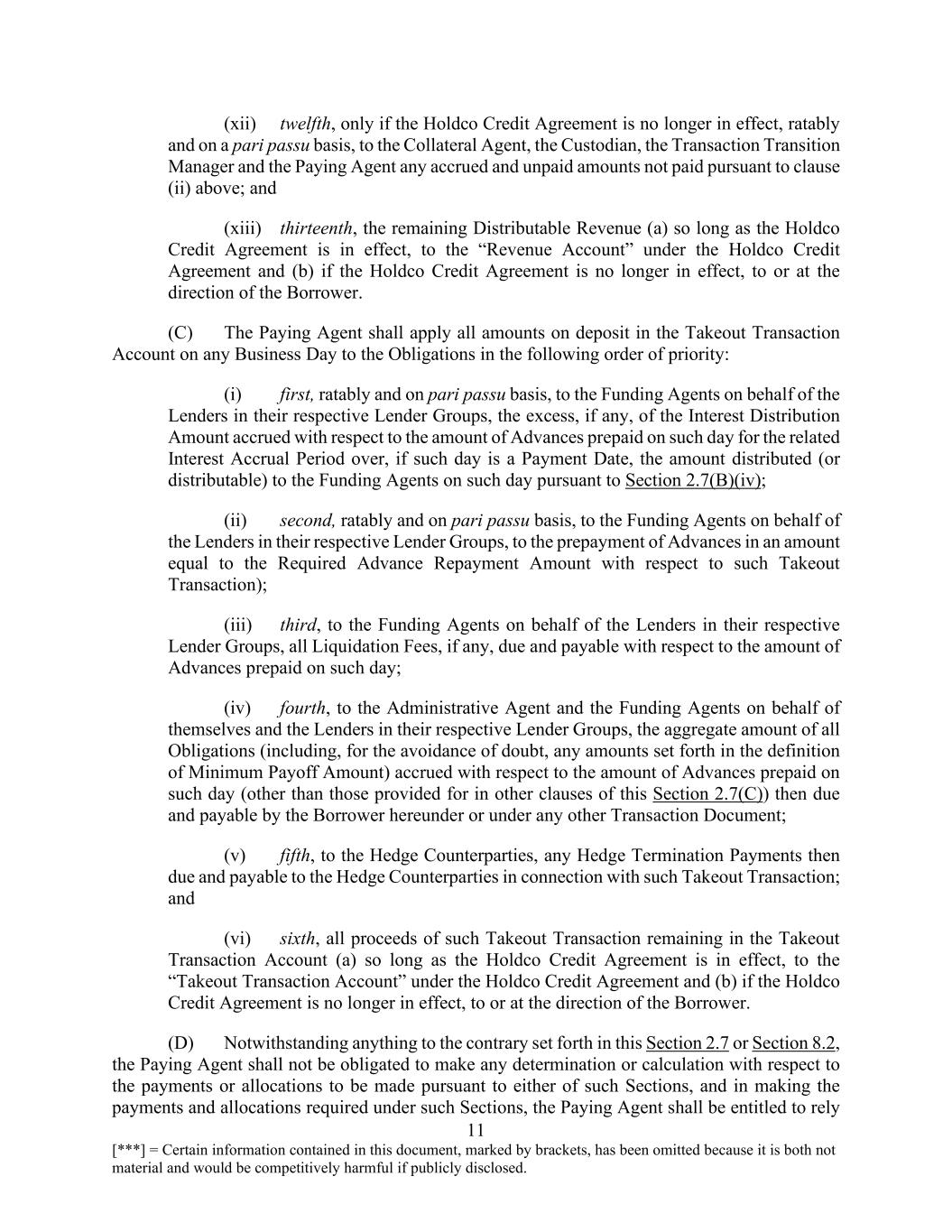 11 [***] = Certain information contained in this document, marked by brackets, has been omitted because it is both not material and would be competitively harmful if publicly disclosed. (xii) twelfth, only if the Holdco Credit Agreement is no longer in effect, ratably and on a pari passu basis, to the Collateral Agent, the Custodian, the Transaction Transition Manager and the Paying Agent any accrued and unpaid amounts not paid pursuant to clause (ii) above; and (xiii) thirteenth, the remaining Distributable Revenue (a) so long as the Holdco Credit Agreement is in effect, to the “Revenue Account” under the Holdco Credit Agreement and (b) if the Holdco Credit Agreement is no longer in effect, to or at the direction of the Borrower. (C) The Paying Agent shall apply all amounts on deposit in the Takeout Transaction Account on any Business Day to the Obligations in the following order of priority: (i) first, ratably and on pari passu basis, to the Funding Agents on behalf of the Lenders in their respective Lender Groups, the excess, if any, of the Interest Distribution Amount accrued with respect to the amount of Advances prepaid on such day for the related Interest Accrual Period over, if such day is a Payment Date, the amount distributed (or distributable) to the Funding Agents on such day pursuant to Section 2.7(B)(iv); (ii) second, ratably and on pari passu basis, to the Funding Agents on behalf of the Lenders in their respective Lender Groups, to the prepayment of Advances in an amount equal to the Required Advance Repayment Amount with respect to such Takeout Transaction); (iii) third, to the Funding Agents on behalf of the Lenders in their respective Lender Groups, all Liquidation Fees, if any, due and payable with respect to the amount of Advances prepaid on such day; (iv) fourth, to the Administrative Agent and the Funding Agents on behalf of themselves and the Lenders in their respective Lender Groups, the aggregate amount of all Obligations (including, for the avoidance of doubt, any amounts set forth in the definition of Minimum Payoff Amount) accrued with respect to the amount of Advances prepaid on such day (other than those provided for in other clauses of this Section 2.7(C)) then due and payable by the Borrower hereunder or under any other Transaction Document; (v) fifth, to the Hedge Counterparties, any Hedge Termination Payments then due and payable to the Hedge Counterparties in connection with such Takeout Transaction; and (vi) sixth, all proceeds of such Takeout Transaction remaining in the Takeout Transaction Account (a) so long as the Holdco Credit Agreement is in effect, to the “Takeout Transaction Account” under the Holdco Credit Agreement and (b) if the Holdco Credit Agreement is no longer in effect, to or at the direction of the Borrower. (D) Notwithstanding anything to the contrary set forth in this Section 2.7 or Section 8.2, the Paying Agent shall not be obligated to make any determination or calculation with respect to the payments or allocations to be made pursuant to either of such Sections, and in making the payments and allocations required under such Sections, the Paying Agent shall be entitled to rely