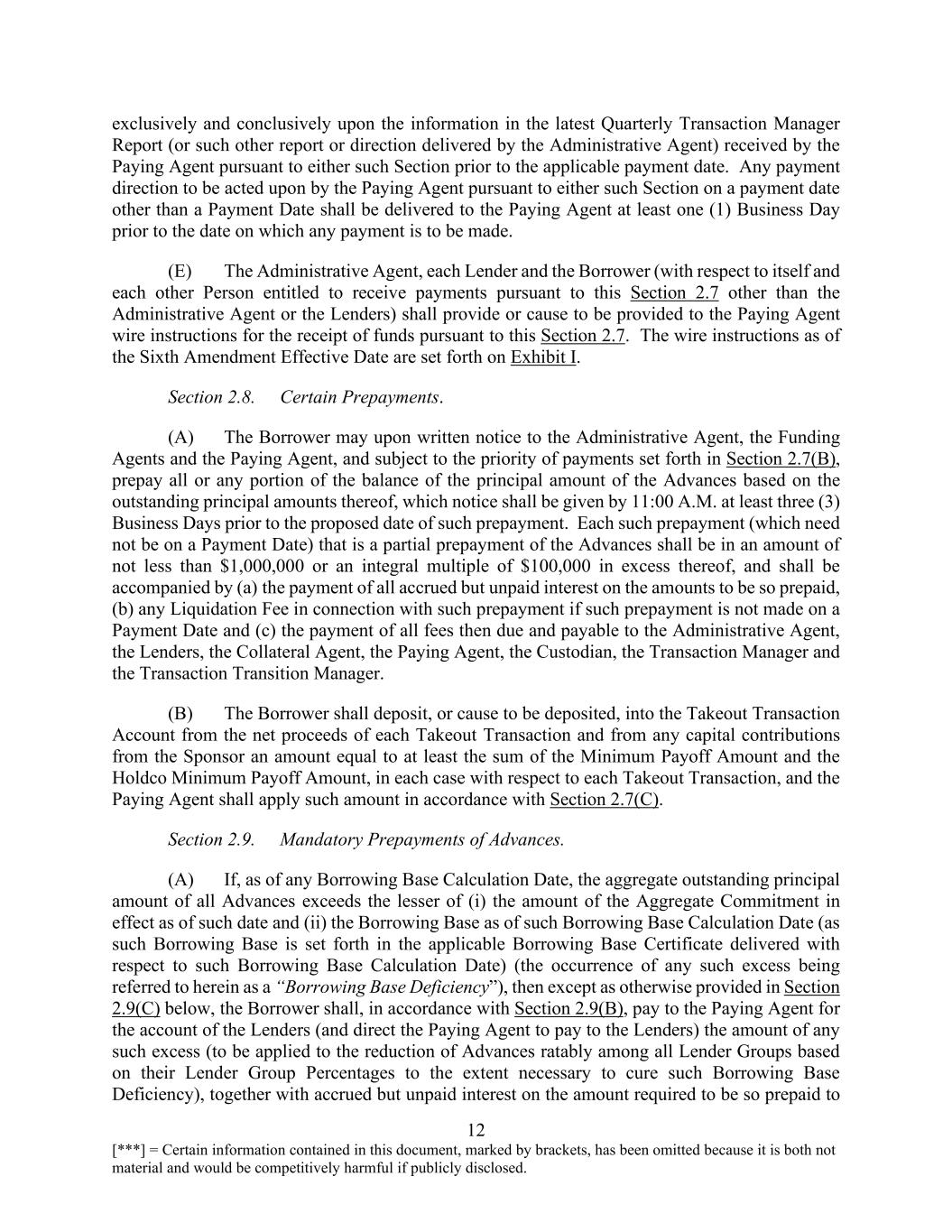 12 [***] = Certain information contained in this document, marked by brackets, has been omitted because it is both not material and would be competitively harmful if publicly disclosed. exclusively and conclusively upon the information in the latest Quarterly Transaction Manager Report (or such other report or direction delivered by the Administrative Agent) received by the Paying Agent pursuant to either such Section prior to the applicable payment date. Any payment direction to be acted upon by the Paying Agent pursuant to either such Section on a payment date other than a Payment Date shall be delivered to the Paying Agent at least one (1) Business Day prior to the date on which any payment is to be made. (E) The Administrative Agent, each Lender and the Borrower (with respect to itself and each other Person entitled to receive payments pursuant to this Section 2.7 other than the Administrative Agent or the Lenders) shall provide or cause to be provided to the Paying Agent wire instructions for the receipt of funds pursuant to this Section 2.7. The wire instructions as of the Sixth Amendment Effective Date are set forth on Exhibit I. Section 2.8. Certain Prepayments. (A) The Borrower may upon written notice to the Administrative Agent, the Funding Agents and the Paying Agent, and subject to the priority of payments set forth in Section 2.7(B), prepay all or any portion of the balance of the principal amount of the Advances based on the outstanding principal amounts thereof, which notice shall be given by 11:00 A.M. at least three (3) Business Days prior to the proposed date of such prepayment. Each such prepayment (which need not be on a Payment Date) that is a partial prepayment of the Advances shall be in an amount of not less than $1,000,000 or an integral multiple of $100,000 in excess thereof, and shall be accompanied by (a) the payment of all accrued but unpaid interest on the amounts to be so prepaid, (b) any Liquidation Fee in connection with such prepayment if such prepayment is not made on a Payment Date and (c) the payment of all fees then due and payable to the Administrative Agent, the Lenders, the Collateral Agent, the Paying Agent, the Custodian, the Transaction Manager and the Transaction Transition Manager. (B) The Borrower shall deposit, or cause to be deposited, into the Takeout Transaction Account from the net proceeds of each Takeout Transaction and from any capital contributions from the Sponsor an amount equal to at least the sum of the Minimum Payoff Amount and the Holdco Minimum Payoff Amount, in each case with respect to each Takeout Transaction, and the Paying Agent shall apply such amount in accordance with Section 2.7(C). Section 2.9. Mandatory Prepayments of Advances. (A) If, as of any Borrowing Base Calculation Date, the aggregate outstanding principal amount of all Advances exceeds the lesser of (i) the amount of the Aggregate Commitment in effect as of such date and (ii) the Borrowing Base as of such Borrowing Base Calculation Date (as such Borrowing Base is set forth in the applicable Borrowing Base Certificate delivered with respect to such Borrowing Base Calculation Date) (the occurrence of any such excess being referred to herein as a “Borrowing Base Deficiency”), then except as otherwise provided in Section 2.9(C) below, the Borrower shall, in accordance with Section 2.9(B), pay to the Paying Agent for the account of the Lenders (and direct the Paying Agent to pay to the Lenders) the amount of any such excess (to be applied to the reduction of Advances ratably among all Lender Groups based on their Lender Group Percentages to the extent necessary to cure such Borrowing Base Deficiency), together with accrued but unpaid interest on the amount required to be so prepaid to