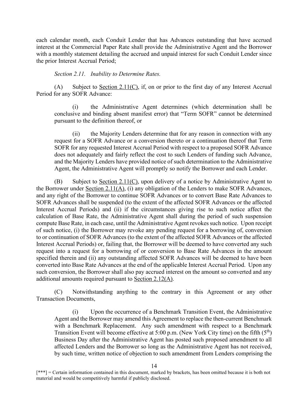 14 [***] = Certain information contained in this document, marked by brackets, has been omitted because it is both not material and would be competitively harmful if publicly disclosed. each calendar month, each Conduit Lender that has Advances outstanding that have accrued interest at the Commercial Paper Rate shall provide the Administrative Agent and the Borrower with a monthly statement detailing the accrued and unpaid interest for such Conduit Lender since the prior Interest Accrual Period; Section 2.11. Inability to Determine Rates. (A) Subject to Section 2.11(C), if, on or prior to the first day of any Interest Accrual Period for any SOFR Advance: (i) the Administrative Agent determines (which determination shall be conclusive and binding absent manifest error) that “Term SOFR” cannot be determined pursuant to the definition thereof, or (ii) the Majority Lenders determine that for any reason in connection with any request for a SOFR Advance or a conversion thereto or a continuation thereof that Term SOFR for any requested Interest Accrual Period with respect to a proposed SOFR Advance does not adequately and fairly reflect the cost to such Lenders of funding such Advance, and the Majority Lenders have provided notice of such determination to the Administrative Agent, the Administrative Agent will promptly so notify the Borrower and each Lender. (B) Subject to Section 2.11(C), upon delivery of a notice by Administrative Agent to the Borrower under Section 2.11(A), (i) any obligation of the Lenders to make SOFR Advances, and any right of the Borrower to continue SOFR Advances or to convert Base Rate Advances to SOFR Advances shall be suspended (to the extent of the affected SOFR Advances or the affected Interest Accrual Periods) and (ii) if the circumstances giving rise to such notice affect the calculation of Base Rate, the Administrative Agent shall during the period of such suspension compute Base Rate, in each case, until the Administrative Agent revokes such notice. Upon receipt of such notice, (i) the Borrower may revoke any pending request for a borrowing of, conversion to or continuation of SOFR Advances (to the extent of the affected SOFR Advances or the affected Interest Accrual Periods) or, failing that, the Borrower will be deemed to have converted any such request into a request for a borrowing of or conversion to Base Rate Advances in the amount specified therein and (ii) any outstanding affected SOFR Advances will be deemed to have been converted into Base Rate Advances at the end of the applicable Interest Accrual Period. Upon any such conversion, the Borrower shall also pay accrued interest on the amount so converted and any additional amounts required pursuant to Section 2.12(A). (C) Notwithstanding anything to the contrary in this Agreement or any other Transaction Documents, (i) Upon the occurrence of a Benchmark Transition Event, the Administrative Agent and the Borrower may amend this Agreement to replace the then-current Benchmark with a Benchmark Replacement. Any such amendment with respect to a Benchmark Transition Event will become effective at 5:00 p.m. (New York City time) on the fifth (5th) Business Day after the Administrative Agent has posted such proposed amendment to all affected Lenders and the Borrower so long as the Administrative Agent has not received, by such time, written notice of objection to such amendment from Lenders comprising the