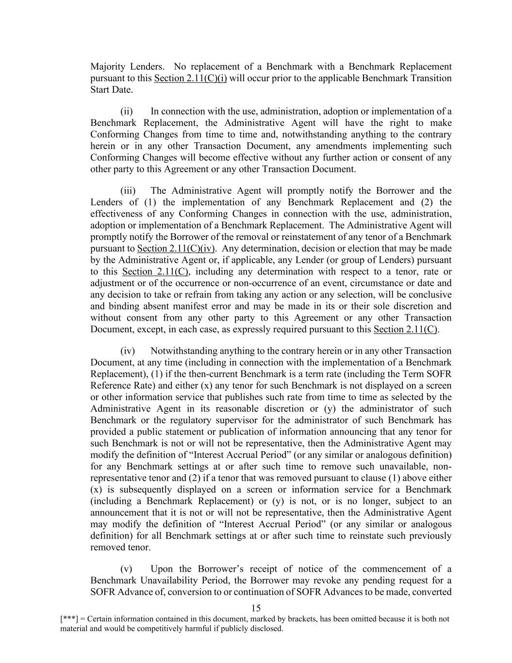 15 [***] = Certain information contained in this document, marked by brackets, has been omitted because it is both not material and would be competitively harmful if publicly disclosed. Majority Lenders. No replacement of a Benchmark with a Benchmark Replacement pursuant to this Section 2.11(C)(i) will occur prior to the applicable Benchmark Transition Start Date. (ii) In connection with the use, administration, adoption or implementation of a Benchmark Replacement, the Administrative Agent will have the right to make Conforming Changes from time to time and, notwithstanding anything to the contrary herein or in any other Transaction Document, any amendments implementing such Conforming Changes will become effective without any further action or consent of any other party to this Agreement or any other Transaction Document. (iii) The Administrative Agent will promptly notify the Borrower and the Lenders of (1) the implementation of any Benchmark Replacement and (2) the effectiveness of any Conforming Changes in connection with the use, administration, adoption or implementation of a Benchmark Replacement. The Administrative Agent will promptly notify the Borrower of the removal or reinstatement of any tenor of a Benchmark pursuant to Section 2.11(C)(iv). Any determination, decision or election that may be made by the Administrative Agent or, if applicable, any Lender (or group of Lenders) pursuant to this Section 2.11(C), including any determination with respect to a tenor, rate or adjustment or of the occurrence or non-occurrence of an event, circumstance or date and any decision to take or refrain from taking any action or any selection, will be conclusive and binding absent manifest error and may be made in its or their sole discretion and without consent from any other party to this Agreement or any other Transaction Document, except, in each case, as expressly required pursuant to this Section 2.11(C). (iv) Notwithstanding anything to the contrary herein or in any other Transaction Document, at any time (including in connection with the implementation of a Benchmark Replacement), (1) if the then-current Benchmark is a term rate (including the Term SOFR Reference Rate) and either (x) any tenor for such Benchmark is not displayed on a screen or other information service that publishes such rate from time to time as selected by the Administrative Agent in its reasonable discretion or (y) the administrator of such Benchmark or the regulatory supervisor for the administrator of such Benchmark has provided a public statement or publication of information announcing that any tenor for such Benchmark is not or will not be representative, then the Administrative Agent may modify the definition of “Interest Accrual Period” (or any similar or analogous definition) for any Benchmark settings at or after such time to remove such unavailable, non- representative tenor and (2) if a tenor that was removed pursuant to clause (1) above either (x) is subsequently displayed on a screen or information service for a Benchmark (including a Benchmark Replacement) or (y) is not, or is no longer, subject to an announcement that it is not or will not be representative, then the Administrative Agent may modify the definition of “Interest Accrual Period” (or any similar or analogous definition) for all Benchmark settings at or after such time to reinstate such previously removed tenor. (v) Upon the Borrower’s receipt of notice of the commencement of a Benchmark Unavailability Period, the Borrower may revoke any pending request for a SOFR Advance of, conversion to or continuation of SOFR Advances to be made, converted