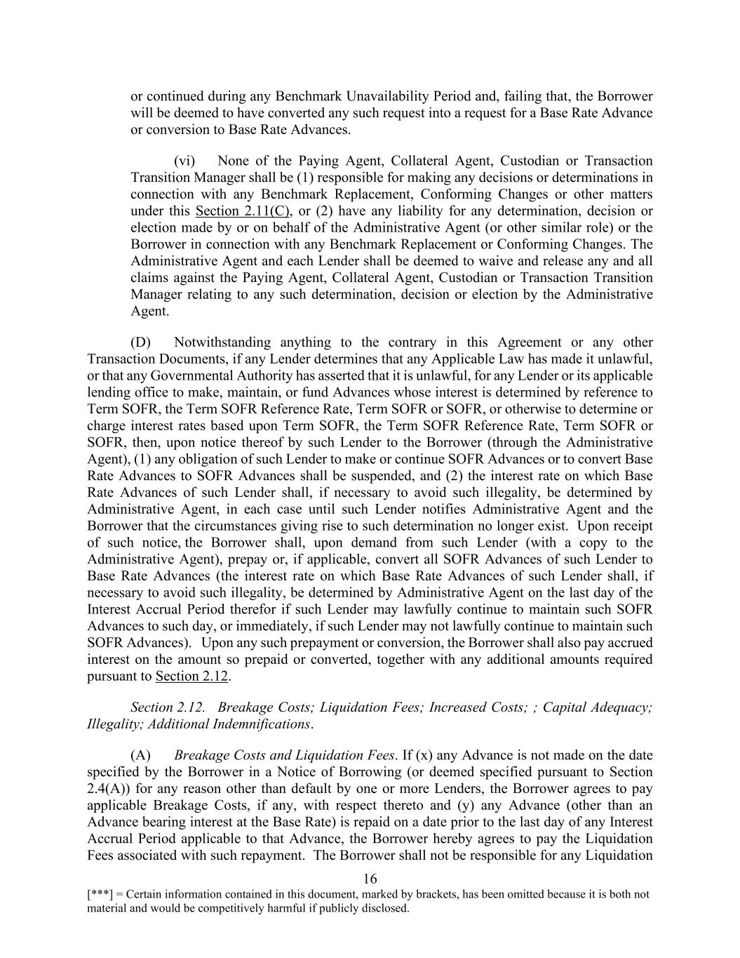 16 [***] = Certain information contained in this document, marked by brackets, has been omitted because it is both not material and would be competitively harmful if publicly disclosed. or continued during any Benchmark Unavailability Period and, failing that, the Borrower will be deemed to have converted any such request into a request for a Base Rate Advance or conversion to Base Rate Advances. (vi) None of the Paying Agent, Collateral Agent, Custodian or Transaction Transition Manager shall be (1) responsible for making any decisions or determinations in connection with any Benchmark Replacement, Conforming Changes or other matters under this Section 2.11(C), or (2) have any liability for any determination, decision or election made by or on behalf of the Administrative Agent (or other similar role) or the Borrower in connection with any Benchmark Replacement or Conforming Changes. The Administrative Agent and each Lender shall be deemed to waive and release any and all claims against the Paying Agent, Collateral Agent, Custodian or Transaction Transition Manager relating to any such determination, decision or election by the Administrative Agent. (D) Notwithstanding anything to the contrary in this Agreement or any other Transaction Documents, if any Lender determines that any Applicable Law has made it unlawful, or that any Governmental Authority has asserted that it is unlawful, for any Lender or its applicable lending office to make, maintain, or fund Advances whose interest is determined by reference to Term SOFR, the Term SOFR Reference Rate, Term SOFR or SOFR, or otherwise to determine or charge interest rates based upon Term SOFR, the Term SOFR Reference Rate, Term SOFR or SOFR, then, upon notice thereof by such Lender to the Borrower (through the Administrative Agent), (1) any obligation of such Lender to make or continue SOFR Advances or to convert Base Rate Advances to SOFR Advances shall be suspended, and (2) the interest rate on which Base Rate Advances of such Lender shall, if necessary to avoid such illegality, be determined by Administrative Agent, in each case until such Lender notifies Administrative Agent and the Borrower that the circumstances giving rise to such determination no longer exist. Upon receipt of such notice, the Borrower shall, upon demand from such Lender (with a copy to the Administrative Agent), prepay or, if applicable, convert all SOFR Advances of such Lender to Base Rate Advances (the interest rate on which Base Rate Advances of such Lender shall, if necessary to avoid such illegality, be determined by Administrative Agent on the last day of the Interest Accrual Period therefor if such Lender may lawfully continue to maintain such SOFR Advances to such day, or immediately, if such Lender may not lawfully continue to maintain such SOFR Advances). Upon any such prepayment or conversion, the Borrower shall also pay accrued interest on the amount so prepaid or converted, together with any additional amounts required pursuant to Section 2.12. Section 2.12. Breakage Costs; Liquidation Fees; Increased Costs; ; Capital Adequacy; Illegality; Additional Indemnifications. (A) Breakage Costs and Liquidation Fees. If (x) any Advance is not made on the date specified by the Borrower in a Notice of Borrowing (or deemed specified pursuant to Section 2.4(A)) for any reason other than default by one or more Lenders, the Borrower agrees to pay applicable Breakage Costs, if any, with respect thereto and (y) any Advance (other than an Advance bearing interest at the Base Rate) is repaid on a date prior to the last day of any Interest Accrual Period applicable to that Advance, the Borrower hereby agrees to pay the Liquidation Fees associated with such repayment. The Borrower shall not be responsible for any Liquidation