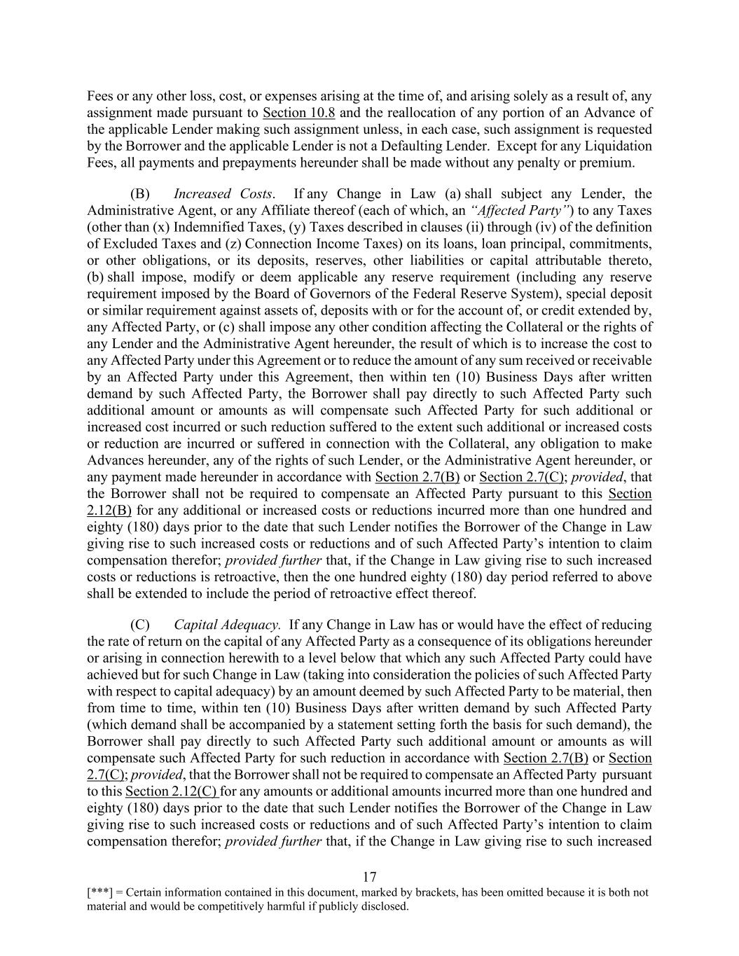 17 [***] = Certain information contained in this document, marked by brackets, has been omitted because it is both not material and would be competitively harmful if publicly disclosed. Fees or any other loss, cost, or expenses arising at the time of, and arising solely as a result of, any assignment made pursuant to Section 10.8 and the reallocation of any portion of an Advance of the applicable Lender making such assignment unless, in each case, such assignment is requested by the Borrower and the applicable Lender is not a Defaulting Lender. Except for any Liquidation Fees, all payments and prepayments hereunder shall be made without any penalty or premium. (B) Increased Costs. If any Change in Law (a) shall subject any Lender, the Administrative Agent, or any Affiliate thereof (each of which, an “Affected Party”) to any Taxes (other than (x) Indemnified Taxes, (y) Taxes described in clauses (ii) through (iv) of the definition of Excluded Taxes and (z) Connection Income Taxes) on its loans, loan principal, commitments, or other obligations, or its deposits, reserves, other liabilities or capital attributable thereto, (b) shall impose, modify or deem applicable any reserve requirement (including any reserve requirement imposed by the Board of Governors of the Federal Reserve System), special deposit or similar requirement against assets of, deposits with or for the account of, or credit extended by, any Affected Party, or (c) shall impose any other condition affecting the Collateral or the rights of any Lender and the Administrative Agent hereunder, the result of which is to increase the cost to any Affected Party under this Agreement or to reduce the amount of any sum received or receivable by an Affected Party under this Agreement, then within ten (10) Business Days after written demand by such Affected Party, the Borrower shall pay directly to such Affected Party such additional amount or amounts as will compensate such Affected Party for such additional or increased cost incurred or such reduction suffered to the extent such additional or increased costs or reduction are incurred or suffered in connection with the Collateral, any obligation to make Advances hereunder, any of the rights of such Lender, or the Administrative Agent hereunder, or any payment made hereunder in accordance with Section 2.7(B) or Section 2.7(C); provided, that the Borrower shall not be required to compensate an Affected Party pursuant to this Section 2.12(B) for any additional or increased costs or reductions incurred more than one hundred and eighty (180) days prior to the date that such Lender notifies the Borrower of the Change in Law giving rise to such increased costs or reductions and of such Affected Party’s intention to claim compensation therefor; provided further that, if the Change in Law giving rise to such increased costs or reductions is retroactive, then the one hundred eighty (180) day period referred to above shall be extended to include the period of retroactive effect thereof. (C) Capital Adequacy. If any Change in Law has or would have the effect of reducing the rate of return on the capital of any Affected Party as a consequence of its obligations hereunder or arising in connection herewith to a level below that which any such Affected Party could have achieved but for such Change in Law (taking into consideration the policies of such Affected Party with respect to capital adequacy) by an amount deemed by such Affected Party to be material, then from time to time, within ten (10) Business Days after written demand by such Affected Party (which demand shall be accompanied by a statement setting forth the basis for such demand), the Borrower shall pay directly to such Affected Party such additional amount or amounts as will compensate such Affected Party for such reduction in accordance with Section 2.7(B) or Section 2.7(C); provided, that the Borrower shall not be required to compensate an Affected Party pursuant to this Section 2.12(C) for any amounts or additional amounts incurred more than one hundred and eighty (180) days prior to the date that such Lender notifies the Borrower of the Change in Law giving rise to such increased costs or reductions and of such Affected Party’s intention to claim compensation therefor; provided further that, if the Change in Law giving rise to such increased
