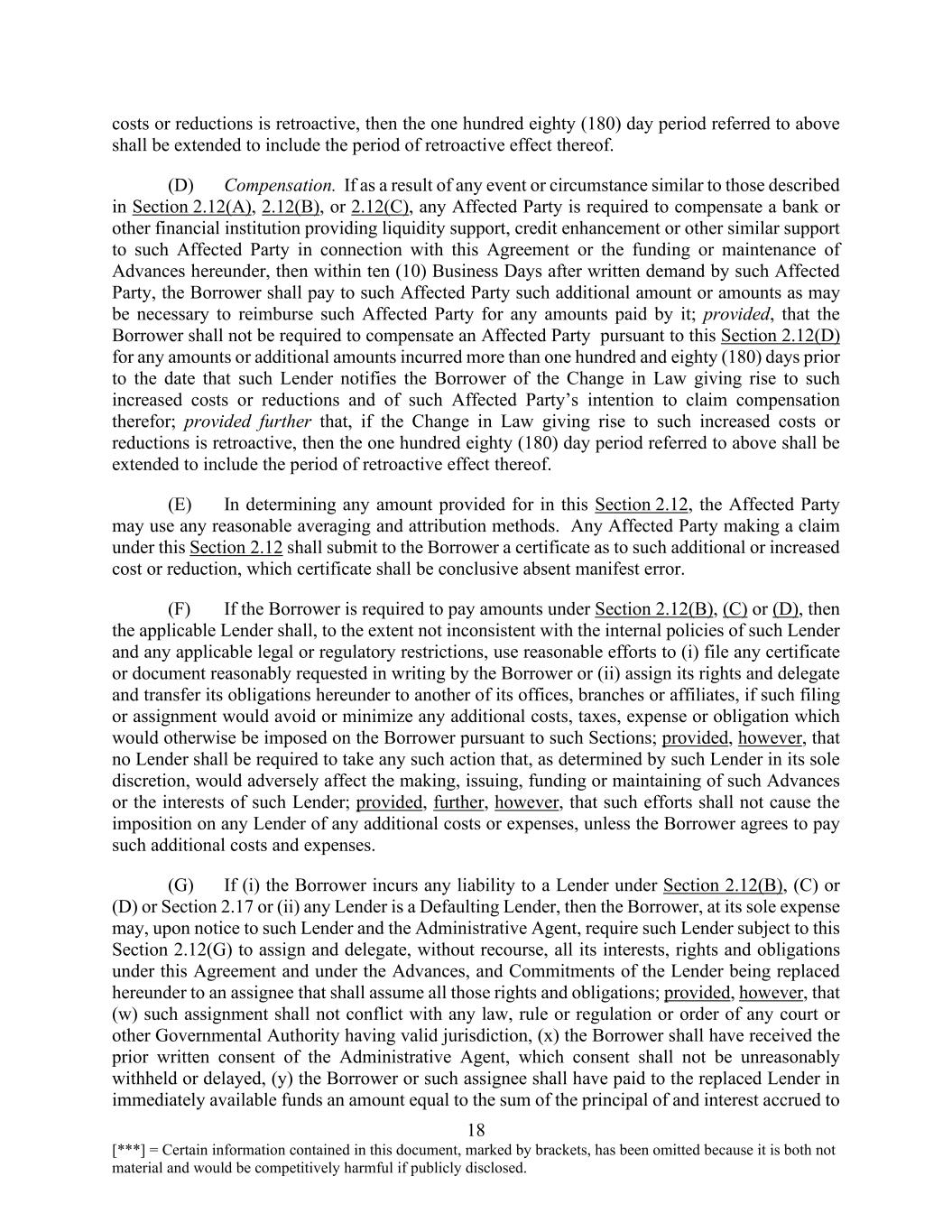18 [***] = Certain information contained in this document, marked by brackets, has been omitted because it is both not material and would be competitively harmful if publicly disclosed. costs or reductions is retroactive, then the one hundred eighty (180) day period referred to above shall be extended to include the period of retroactive effect thereof. (D) Compensation. If as a result of any event or circumstance similar to those described in Section 2.12(A), 2.12(B), or 2.12(C), any Affected Party is required to compensate a bank or other financial institution providing liquidity support, credit enhancement or other similar support to such Affected Party in connection with this Agreement or the funding or maintenance of Advances hereunder, then within ten (10) Business Days after written demand by such Affected Party, the Borrower shall pay to such Affected Party such additional amount or amounts as may be necessary to reimburse such Affected Party for any amounts paid by it; provided, that the Borrower shall not be required to compensate an Affected Party pursuant to this Section 2.12(D) for any amounts or additional amounts incurred more than one hundred and eighty (180) days prior to the date that such Lender notifies the Borrower of the Change in Law giving rise to such increased costs or reductions and of such Affected Party’s intention to claim compensation therefor; provided further that, if the Change in Law giving rise to such increased costs or reductions is retroactive, then the one hundred eighty (180) day period referred to above shall be extended to include the period of retroactive effect thereof. (E) In determining any amount provided for in this Section 2.12, the Affected Party may use any reasonable averaging and attribution methods. Any Affected Party making a claim under this Section 2.12 shall submit to the Borrower a certificate as to such additional or increased cost or reduction, which certificate shall be conclusive absent manifest error. (F) If the Borrower is required to pay amounts under Section 2.12(B), (C) or (D), then the applicable Lender shall, to the extent not inconsistent with the internal policies of such Lender and any applicable legal or regulatory restrictions, use reasonable efforts to (i) file any certificate or document reasonably requested in writing by the Borrower or (ii) assign its rights and delegate and transfer its obligations hereunder to another of its offices, branches or affiliates, if such filing or assignment would avoid or minimize any additional costs, taxes, expense or obligation which would otherwise be imposed on the Borrower pursuant to such Sections; provided, however, that no Lender shall be required to take any such action that, as determined by such Lender in its sole discretion, would adversely affect the making, issuing, funding or maintaining of such Advances or the interests of such Lender; provided, further, however, that such efforts shall not cause the imposition on any Lender of any additional costs or expenses, unless the Borrower agrees to pay such additional costs and expenses. (G) If (i) the Borrower incurs any liability to a Lender under Section 2.12(B), (C) or (D) or Section 2.17 or (ii) any Lender is a Defaulting Lender, then the Borrower, at its sole expense may, upon notice to such Lender and the Administrative Agent, require such Lender subject to this Section 2.12(G) to assign and delegate, without recourse, all its interests, rights and obligations under this Agreement and under the Advances, and Commitments of the Lender being replaced hereunder to an assignee that shall assume all those rights and obligations; provided, however, that (w) such assignment shall not conflict with any law, rule or regulation or order of any court or other Governmental Authority having valid jurisdiction, (x) the Borrower shall have received the prior written consent of the Administrative Agent, which consent shall not be unreasonably withheld or delayed, (y) the Borrower or such assignee shall have paid to the replaced Lender in immediately available funds an amount equal to the sum of the principal of and interest accrued to