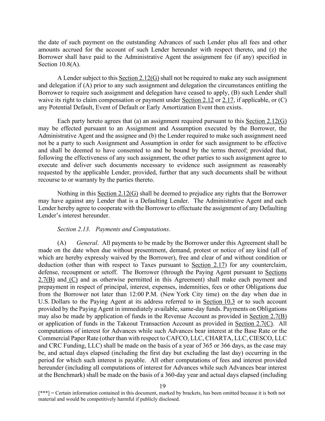 19 [***] = Certain information contained in this document, marked by brackets, has been omitted because it is both not material and would be competitively harmful if publicly disclosed. the date of such payment on the outstanding Advances of such Lender plus all fees and other amounts accrued for the account of such Lender hereunder with respect thereto, and (z) the Borrower shall have paid to the Administrative Agent the assignment fee (if any) specified in Section 10.8(A). A Lender subject to this Section 2.12(G) shall not be required to make any such assignment and delegation if (A) prior to any such assignment and delegation the circumstances entitling the Borrower to require such assignment and delegation have ceased to apply, (B) such Lender shall waive its right to claim compensation or payment under Section 2.12 or 2.17, if applicable, or (C) any Potential Default, Event of Default or Early Amortization Event then exists. Each party hereto agrees that (a) an assignment required pursuant to this Section 2.12(G) may be effected pursuant to an Assignment and Assumption executed by the Borrower, the Administrative Agent and the assignee and (b) the Lender required to make such assignment need not be a party to such Assignment and Assumption in order for such assignment to be effective and shall be deemed to have consented to and be bound by the terms thereof; provided that, following the effectiveness of any such assignment, the other parties to such assignment agree to execute and deliver such documents necessary to evidence such assignment as reasonably requested by the applicable Lender, provided, further that any such documents shall be without recourse to or warranty by the parties thereto. Nothing in this Section 2.12(G) shall be deemed to prejudice any rights that the Borrower may have against any Lender that is a Defaulting Lender. The Administrative Agent and each Lender hereby agree to cooperate with the Borrower to effectuate the assignment of any Defaulting Lender’s interest hereunder. Section 2.13. Payments and Computations. (A) General. All payments to be made by the Borrower under this Agreement shall be made on the date when due without presentment, demand, protest or notice of any kind (all of which are hereby expressly waived by the Borrower), free and clear of and without condition or deduction (other than with respect to Taxes pursuant to Section 2.17) for any counterclaim, defense, recoupment or setoff. The Borrower (through the Paying Agent pursuant to Sections 2.7(B) and (C) and as otherwise permitted in this Agreement) shall make each payment and prepayment in respect of principal, interest, expenses, indemnities, fees or other Obligations due from the Borrower not later than 12:00 P.M. (New York City time) on the day when due in U.S. Dollars to the Paying Agent at its address referred to in Section 10.3 or to such account provided by the Paying Agent in immediately available, same-day funds. Payments on Obligations may also be made by application of funds in the Revenue Account as provided in Section 2.7(B) or application of funds in the Takeout Transaction Account as provided in Section 2.7(C). All computations of interest for Advances while such Advances bear interest at the Base Rate or the Commercial Paper Rate (other than with respect to CAFCO, LLC, CHARTA, LLC, CIESCO, LLC and CRC Funding, LLC) shall be made on the basis of a year of 365 or 366 days, as the case may be, and actual days elapsed (including the first day but excluding the last day) occurring in the period for which such interest is payable. All other computations of fees and interest provided hereunder (including all computations of interest for Advances while such Advances bear interest at the Benchmark) shall be made on the basis of a 360-day year and actual days elapsed (including