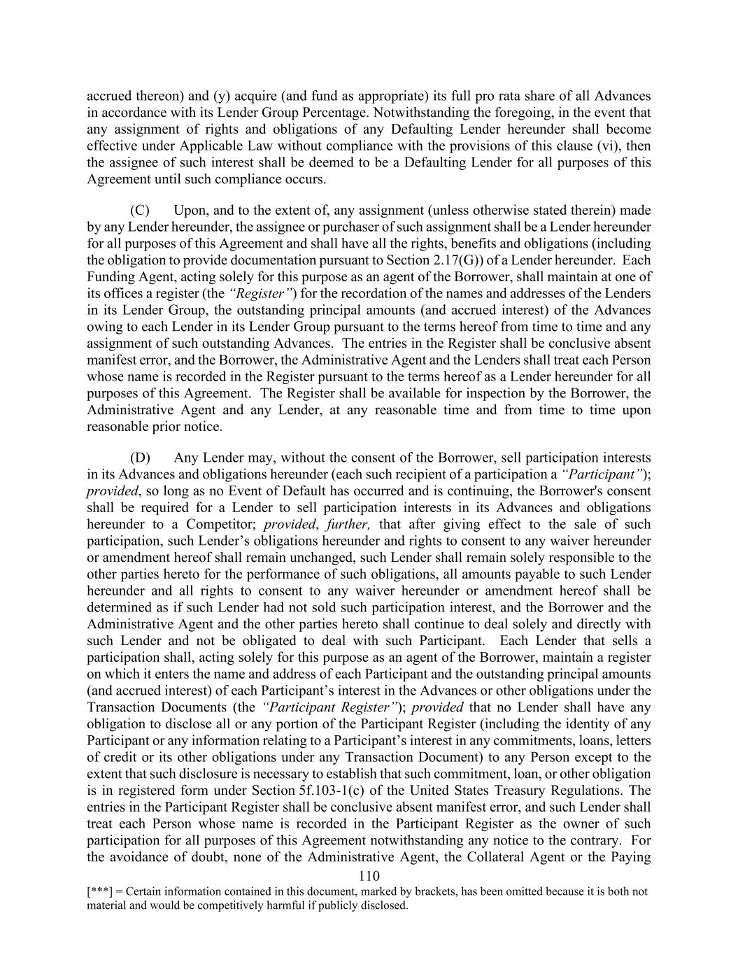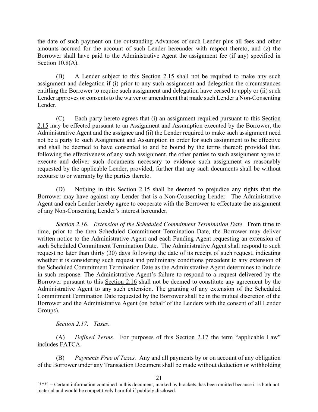 21 [***] = Certain information contained in this document, marked by brackets, has been omitted because it is both not material and would be competitively harmful if publicly disclosed. the date of such payment on the outstanding Advances of such Lender plus all fees and other amounts accrued for the account of such Lender hereunder with respect thereto, and (z) the Borrower shall have paid to the Administrative Agent the assignment fee (if any) specified in Section 10.8(A). (B) A Lender subject to this Section 2.15 shall not be required to make any such assignment and delegation if (i) prior to any such assignment and delegation the circumstances entitling the Borrower to require such assignment and delegation have ceased to apply or (ii) such Lender approves or consents to the waiver or amendment that made such Lender a Non-Consenting Lender. (C) Each party hereto agrees that (i) an assignment required pursuant to this Section 2.15 may be effected pursuant to an Assignment and Assumption executed by the Borrower, the Administrative Agent and the assignee and (ii) the Lender required to make such assignment need not be a party to such Assignment and Assumption in order for such assignment to be effective and shall be deemed to have consented to and be bound by the terms thereof; provided that, following the effectiveness of any such assignment, the other parties to such assignment agree to execute and deliver such documents necessary to evidence such assignment as reasonably requested by the applicable Lender, provided, further that any such documents shall be without recourse to or warranty by the parties thereto. (D) Nothing in this Section 2.15 shall be deemed to prejudice any rights that the Borrower may have against any Lender that is a Non-Consenting Lender. The Administrative Agent and each Lender hereby agree to cooperate with the Borrower to effectuate the assignment of any Non-Consenting Lender’s interest hereunder. Section 2.16. Extension of the Scheduled Commitment Termination Date. From time to time, prior to the then Scheduled Commitment Termination Date, the Borrower may deliver written notice to the Administrative Agent and each Funding Agent requesting an extension of such Scheduled Commitment Termination Date. The Administrative Agent shall respond to such request no later than thirty (30) days following the date of its receipt of such request, indicating whether it is considering such request and preliminary conditions precedent to any extension of the Scheduled Commitment Termination Date as the Administrative Agent determines to include in such response. The Administrative Agent’s failure to respond to a request delivered by the Borrower pursuant to this Section 2.16 shall not be deemed to constitute any agreement by the Administrative Agent to any such extension. The granting of any extension of the Scheduled Commitment Termination Date requested by the Borrower shall be in the mutual discretion of the Borrower and the Administrative Agent (on behalf of the Lenders with the consent of all Lender Groups). Section 2.17. Taxes. (A) Defined Terms. For purposes of this Section 2.17 the term “applicable Law” includes FATCA. (B) Payments Free of Taxes. Any and all payments by or on account of any obligation of the Borrower under any Transaction Document shall be made without deduction or withholding
