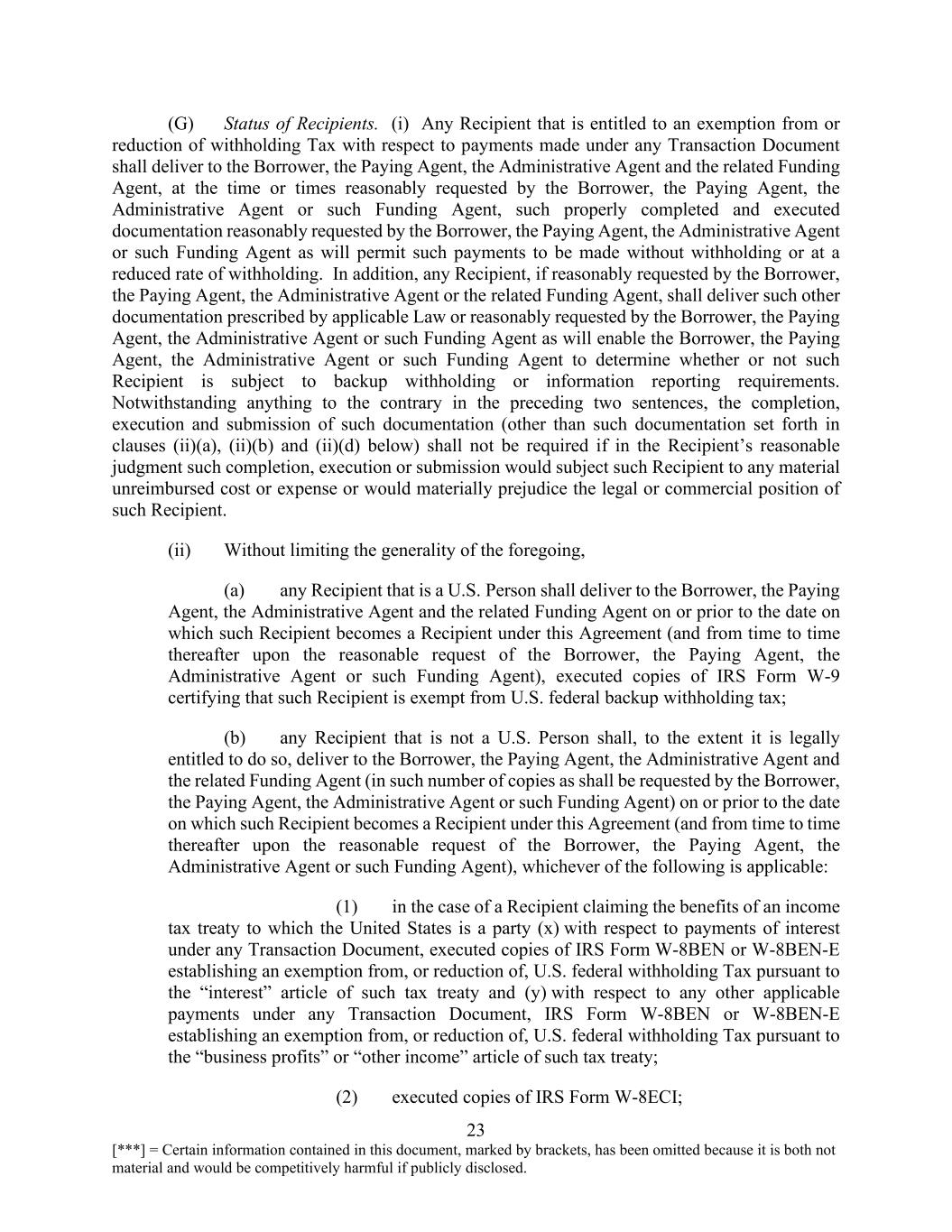 23 [***] = Certain information contained in this document, marked by brackets, has been omitted because it is both not material and would be competitively harmful if publicly disclosed. (G) Status of Recipients. (i) Any Recipient that is entitled to an exemption from or reduction of withholding Tax with respect to payments made under any Transaction Document shall deliver to the Borrower, the Paying Agent, the Administrative Agent and the related Funding Agent, at the time or times reasonably requested by the Borrower, the Paying Agent, the Administrative Agent or such Funding Agent, such properly completed and executed documentation reasonably requested by the Borrower, the Paying Agent, the Administrative Agent or such Funding Agent as will permit such payments to be made without withholding or at a reduced rate of withholding. In addition, any Recipient, if reasonably requested by the Borrower, the Paying Agent, the Administrative Agent or the related Funding Agent, shall deliver such other documentation prescribed by applicable Law or reasonably requested by the Borrower, the Paying Agent, the Administrative Agent or such Funding Agent as will enable the Borrower, the Paying Agent, the Administrative Agent or such Funding Agent to determine whether or not such Recipient is subject to backup withholding or information reporting requirements. Notwithstanding anything to the contrary in the preceding two sentences, the completion, execution and submission of such documentation (other than such documentation set forth in clauses (ii)(a), (ii)(b) and (ii)(d) below) shall not be required if in the Recipient’s reasonable judgment such completion, execution or submission would subject such Recipient to any material unreimbursed cost or expense or would materially prejudice the legal or commercial position of such Recipient. (ii) Without limiting the generality of the foregoing, (a) any Recipient that is a U.S. Person shall deliver to the Borrower, the Paying Agent, the Administrative Agent and the related Funding Agent on or prior to the date on which such Recipient becomes a Recipient under this Agreement (and from time to time thereafter upon the reasonable request of the Borrower, the Paying Agent, the Administrative Agent or such Funding Agent), executed copies of IRS Form W-9 certifying that such Recipient is exempt from U.S. federal backup withholding tax; (b) any Recipient that is not a U.S. Person shall, to the extent it is legally entitled to do so, deliver to the Borrower, the Paying Agent, the Administrative Agent and the related Funding Agent (in such number of copies as shall be requested by the Borrower, the Paying Agent, the Administrative Agent or such Funding Agent) on or prior to the date on which such Recipient becomes a Recipient under this Agreement (and from time to time thereafter upon the reasonable request of the Borrower, the Paying Agent, the Administrative Agent or such Funding Agent), whichever of the following is applicable: (1) in the case of a Recipient claiming the benefits of an income tax treaty to which the United States is a party (x) with respect to payments of interest under any Transaction Document, executed copies of IRS Form W-8BEN or W-8BEN-E establishing an exemption from, or reduction of, U.S. federal withholding Tax pursuant to the “interest” article of such tax treaty and (y) with respect to any other applicable payments under any Transaction Document, IRS Form W-8BEN or W-8BEN-E establishing an exemption from, or reduction of, U.S. federal withholding Tax pursuant to the “business profits” or “other income” article of such tax treaty; (2) executed copies of IRS Form W-8ECI;