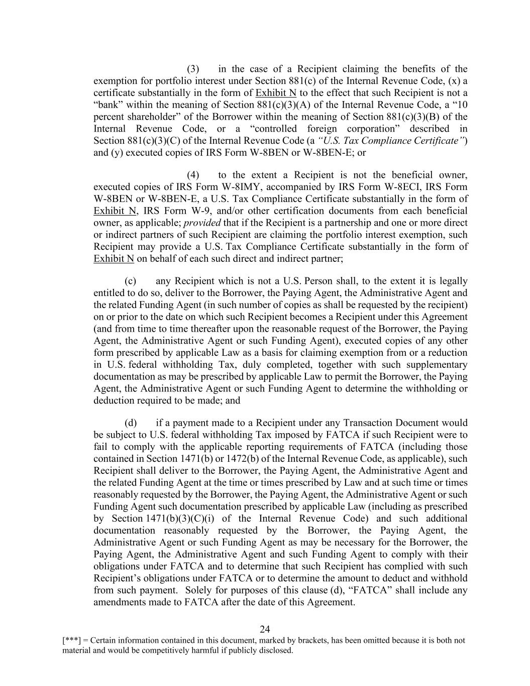 24 [***] = Certain information contained in this document, marked by brackets, has been omitted because it is both not material and would be competitively harmful if publicly disclosed. (3) in the case of a Recipient claiming the benefits of the exemption for portfolio interest under Section 881(c) of the Internal Revenue Code, (x) a certificate substantially in the form of Exhibit N to the effect that such Recipient is not a “bank” within the meaning of Section 881(c)(3)(A) of the Internal Revenue Code, a “10 percent shareholder” of the Borrower within the meaning of Section 881(c)(3)(B) of the Internal Revenue Code, or a “controlled foreign corporation” described in Section 881(c)(3)(C) of the Internal Revenue Code (a “U.S. Tax Compliance Certificate”) and (y) executed copies of IRS Form W-8BEN or W-8BEN-E; or (4) to the extent a Recipient is not the beneficial owner, executed copies of IRS Form W-8IMY, accompanied by IRS Form W-8ECI, IRS Form W-8BEN or W-8BEN-E, a U.S. Tax Compliance Certificate substantially in the form of Exhibit N, IRS Form W-9, and/or other certification documents from each beneficial owner, as applicable; provided that if the Recipient is a partnership and one or more direct or indirect partners of such Recipient are claiming the portfolio interest exemption, such Recipient may provide a U.S. Tax Compliance Certificate substantially in the form of Exhibit N on behalf of each such direct and indirect partner; (c) any Recipient which is not a U.S. Person shall, to the extent it is legally entitled to do so, deliver to the Borrower, the Paying Agent, the Administrative Agent and the related Funding Agent (in such number of copies as shall be requested by the recipient) on or prior to the date on which such Recipient becomes a Recipient under this Agreement (and from time to time thereafter upon the reasonable request of the Borrower, the Paying Agent, the Administrative Agent or such Funding Agent), executed copies of any other form prescribed by applicable Law as a basis for claiming exemption from or a reduction in U.S. federal withholding Tax, duly completed, together with such supplementary documentation as may be prescribed by applicable Law to permit the Borrower, the Paying Agent, the Administrative Agent or such Funding Agent to determine the withholding or deduction required to be made; and (d) if a payment made to a Recipient under any Transaction Document would be subject to U.S. federal withholding Tax imposed by FATCA if such Recipient were to fail to comply with the applicable reporting requirements of FATCA (including those contained in Section 1471(b) or 1472(b) of the Internal Revenue Code, as applicable), such Recipient shall deliver to the Borrower, the Paying Agent, the Administrative Agent and the related Funding Agent at the time or times prescribed by Law and at such time or times reasonably requested by the Borrower, the Paying Agent, the Administrative Agent or such Funding Agent such documentation prescribed by applicable Law (including as prescribed by Section 1471(b)(3)(C)(i) of the Internal Revenue Code) and such additional documentation reasonably requested by the Borrower, the Paying Agent, the Administrative Agent or such Funding Agent as may be necessary for the Borrower, the Paying Agent, the Administrative Agent and such Funding Agent to comply with their obligations under FATCA and to determine that such Recipient has complied with such Recipient’s obligations under FATCA or to determine the amount to deduct and withhold from such payment. Solely for purposes of this clause (d), “FATCA” shall include any amendments made to FATCA after the date of this Agreement.