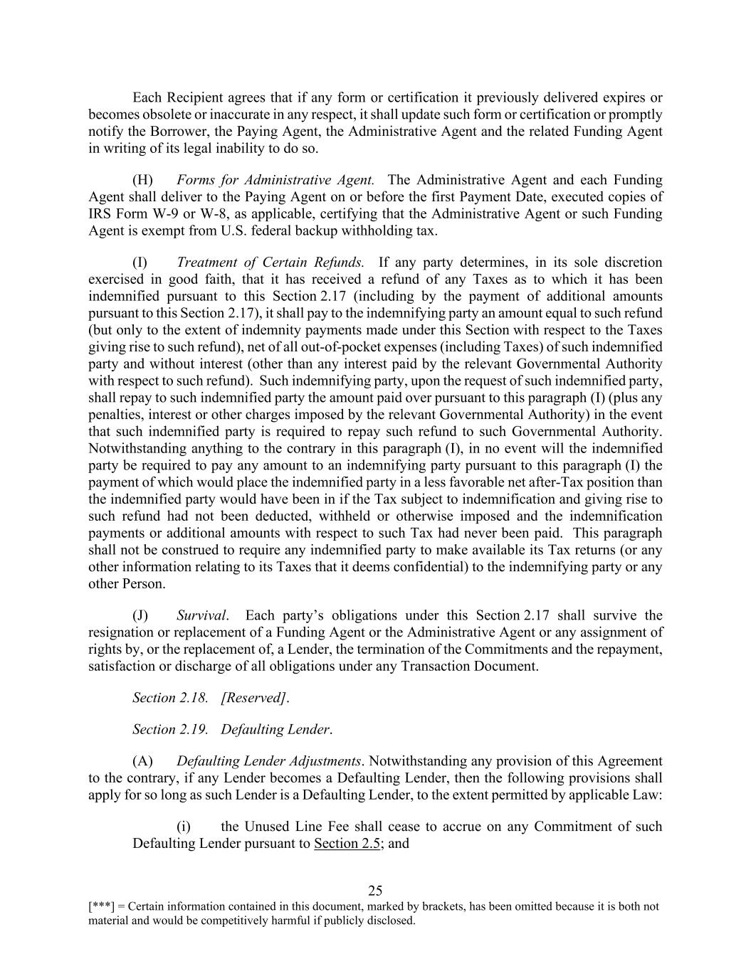 25 [***] = Certain information contained in this document, marked by brackets, has been omitted because it is both not material and would be competitively harmful if publicly disclosed. Each Recipient agrees that if any form or certification it previously delivered expires or becomes obsolete or inaccurate in any respect, it shall update such form or certification or promptly notify the Borrower, the Paying Agent, the Administrative Agent and the related Funding Agent in writing of its legal inability to do so. (H) Forms for Administrative Agent. The Administrative Agent and each Funding Agent shall deliver to the Paying Agent on or before the first Payment Date, executed copies of IRS Form W-9 or W-8, as applicable, certifying that the Administrative Agent or such Funding Agent is exempt from U.S. federal backup withholding tax. (I) Treatment of Certain Refunds. If any party determines, in its sole discretion exercised in good faith, that it has received a refund of any Taxes as to which it has been indemnified pursuant to this Section 2.17 (including by the payment of additional amounts pursuant to this Section 2.17), it shall pay to the indemnifying party an amount equal to such refund (but only to the extent of indemnity payments made under this Section with respect to the Taxes giving rise to such refund), net of all out-of-pocket expenses (including Taxes) of such indemnified party and without interest (other than any interest paid by the relevant Governmental Authority with respect to such refund). Such indemnifying party, upon the request of such indemnified party, shall repay to such indemnified party the amount paid over pursuant to this paragraph (I) (plus any penalties, interest or other charges imposed by the relevant Governmental Authority) in the event that such indemnified party is required to repay such refund to such Governmental Authority. Notwithstanding anything to the contrary in this paragraph (I), in no event will the indemnified party be required to pay any amount to an indemnifying party pursuant to this paragraph (I) the payment of which would place the indemnified party in a less favorable net after-Tax position than the indemnified party would have been in if the Tax subject to indemnification and giving rise to such refund had not been deducted, withheld or otherwise imposed and the indemnification payments or additional amounts with respect to such Tax had never been paid. This paragraph shall not be construed to require any indemnified party to make available its Tax returns (or any other information relating to its Taxes that it deems confidential) to the indemnifying party or any other Person. (J) Survival. Each party’s obligations under this Section 2.17 shall survive the resignation or replacement of a Funding Agent or the Administrative Agent or any assignment of rights by, or the replacement of, a Lender, the termination of the Commitments and the repayment, satisfaction or discharge of all obligations under any Transaction Document. Section 2.18. [Reserved]. Section 2.19. Defaulting Lender. (A) Defaulting Lender Adjustments. Notwithstanding any provision of this Agreement to the contrary, if any Lender becomes a Defaulting Lender, then the following provisions shall apply for so long as such Lender is a Defaulting Lender, to the extent permitted by applicable Law: (i) the Unused Line Fee shall cease to accrue on any Commitment of such Defaulting Lender pursuant to Section 2.5; and