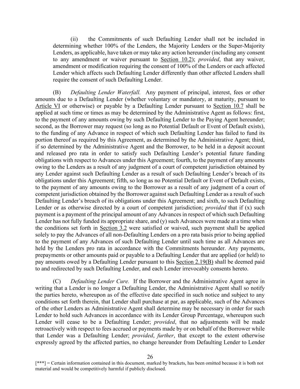 26 [***] = Certain information contained in this document, marked by brackets, has been omitted because it is both not material and would be competitively harmful if publicly disclosed. (ii) the Commitments of such Defaulting Lender shall not be included in determining whether 100% of the Lenders, the Majority Lenders or the Super-Majority Lenders, as applicable, have taken or may take any action hereunder (including any consent to any amendment or waiver pursuant to Section 10.2); provided, that any waiver, amendment or modification requiring the consent of 100% of the Lenders or each affected Lender which affects such Defaulting Lender differently than other affected Lenders shall require the consent of such Defaulting Lender. (B) Defaulting Lender Waterfall. Any payment of principal, interest, fees or other amounts due to a Defaulting Lender (whether voluntary or mandatory, at maturity, pursuant to Article VI or otherwise) or payable by a Defaulting Lender pursuant to Section 10.7 shall be applied at such time or times as may be determined by the Administrative Agent as follows: first, to the payment of any amounts owing by such Defaulting Lender to the Paying Agent hereunder; second, as the Borrower may request (so long as no Potential Default or Event of Default exists), to the funding of any Advance in respect of which such Defaulting Lender has failed to fund its portion thereof as required by this Agreement, as determined by the Administrative Agent; third, if so determined by the Administrative Agent and the Borrower, to be held in a deposit account and released pro rata in order to satisfy such Defaulting Lender’s potential future funding obligations with respect to Advances under this Agreement; fourth, to the payment of any amounts owing to the Lenders as a result of any judgment of a court of competent jurisdiction obtained by any Lender against such Defaulting Lender as a result of such Defaulting Lender’s breach of its obligations under this Agreement; fifth, so long as no Potential Default or Event of Default exists, to the payment of any amounts owing to the Borrower as a result of any judgment of a court of competent jurisdiction obtained by the Borrower against such Defaulting Lender as a result of such Defaulting Lender’s breach of its obligations under this Agreement; and sixth, to such Defaulting Lender or as otherwise directed by a court of competent jurisdiction; provided that if (x) such payment is a payment of the principal amount of any Advances in respect of which such Defaulting Lender has not fully funded its appropriate share, and (y) such Advances were made at a time when the conditions set forth in Section 3.2 were satisfied or waived, such payment shall be applied solely to pay the Advances of all non-Defaulting Lenders on a pro rata basis prior to being applied to the payment of any Advances of such Defaulting Lender until such time as all Advances are held by the Lenders pro rata in accordance with the Commitments hereunder. Any payments, prepayments or other amounts paid or payable to a Defaulting Lender that are applied (or held) to pay amounts owed by a Defaulting Lender pursuant to this Section 2.19(B) shall be deemed paid to and redirected by such Defaulting Lender, and each Lender irrevocably consents hereto. (C) Defaulting Lender Cure. If the Borrower and the Administrative Agent agree in writing that a Lender is no longer a Defaulting Lender, the Administrative Agent shall so notify the parties hereto, whereupon as of the effective date specified in such notice and subject to any conditions set forth therein, that Lender shall purchase at par, as applicable, such of the Advances of the other Lenders as Administrative Agent shall determine may be necessary in order for such Lender to hold such Advances in accordance with its Lender Group Percentage, whereupon such Lender will cease to be a Defaulting Lender; provided, that no adjustments will be made retroactively with respect to fees accrued or payments made by or on behalf of the Borrower while that Lender was a Defaulting Lender; provided, further, that except to the extent otherwise expressly agreed by the affected parties, no change hereunder from Defaulting Lender to Lender