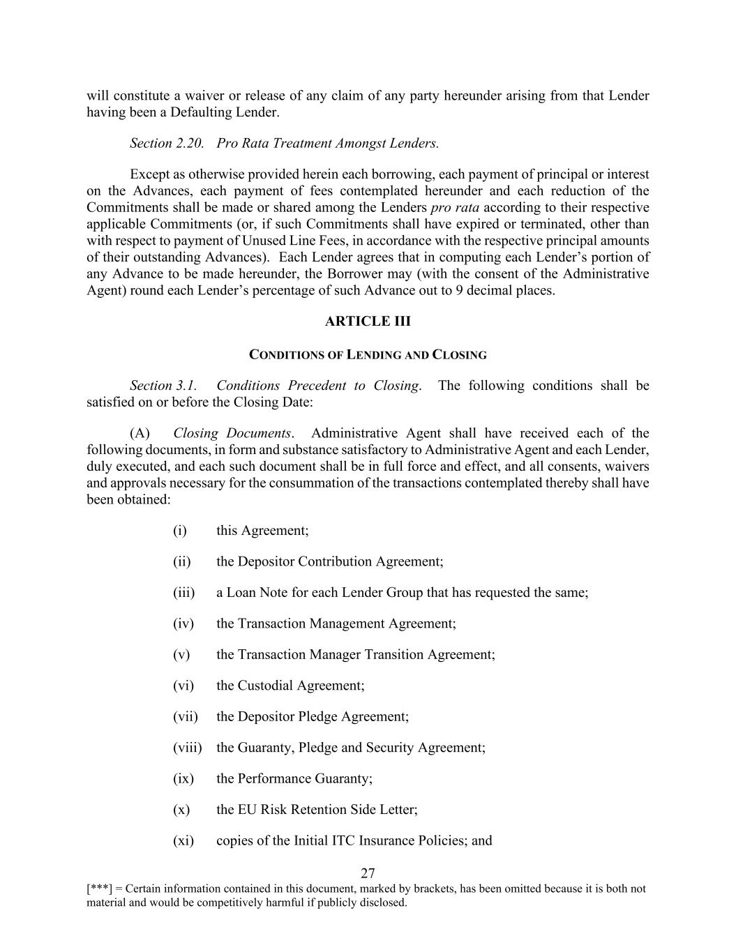 27 [***] = Certain information contained in this document, marked by brackets, has been omitted because it is both not material and would be competitively harmful if publicly disclosed. will constitute a waiver or release of any claim of any party hereunder arising from that Lender having been a Defaulting Lender. Section 2.20. Pro Rata Treatment Amongst Lenders. Except as otherwise provided herein each borrowing, each payment of principal or interest on the Advances, each payment of fees contemplated hereunder and each reduction of the Commitments shall be made or shared among the Lenders pro rata according to their respective applicable Commitments (or, if such Commitments shall have expired or terminated, other than with respect to payment of Unused Line Fees, in accordance with the respective principal amounts of their outstanding Advances). Each Lender agrees that in computing each Lender’s portion of any Advance to be made hereunder, the Borrower may (with the consent of the Administrative Agent) round each Lender’s percentage of such Advance out to 9 decimal places. ARTICLE III CONDITIONS OF LENDING AND CLOSING Section 3.1. Conditions Precedent to Closing. The following conditions shall be satisfied on or before the Closing Date: (A) Closing Documents. Administrative Agent shall have received each of the following documents, in form and substance satisfactory to Administrative Agent and each Lender, duly executed, and each such document shall be in full force and effect, and all consents, waivers and approvals necessary for the consummation of the transactions contemplated thereby shall have been obtained: (i) this Agreement; (ii) the Depositor Contribution Agreement; (iii) a Loan Note for each Lender Group that has requested the same; (iv) the Transaction Management Agreement; (v) the Transaction Manager Transition Agreement; (vi) the Custodial Agreement; (vii) the Depositor Pledge Agreement; (viii) the Guaranty, Pledge and Security Agreement; (ix) the Performance Guaranty; (x) the EU Risk Retention Side Letter; (xi) copies of the Initial ITC Insurance Policies; and