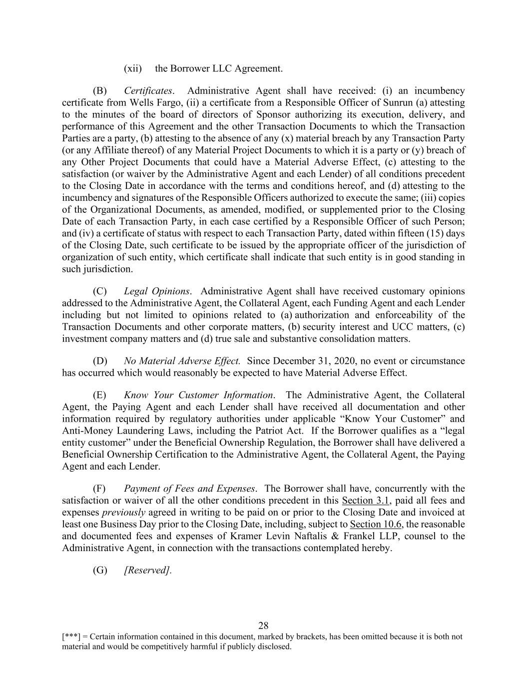 28 [***] = Certain information contained in this document, marked by brackets, has been omitted because it is both not material and would be competitively harmful if publicly disclosed. (xii) the Borrower LLC Agreement. (B) Certificates. Administrative Agent shall have received: (i) an incumbency certificate from Wells Fargo, (ii) a certificate from a Responsible Officer of Sunrun (a) attesting to the minutes of the board of directors of Sponsor authorizing its execution, delivery, and performance of this Agreement and the other Transaction Documents to which the Transaction Parties are a party, (b) attesting to the absence of any (x) material breach by any Transaction Party (or any Affiliate thereof) of any Material Project Documents to which it is a party or (y) breach of any Other Project Documents that could have a Material Adverse Effect, (c) attesting to the satisfaction (or waiver by the Administrative Agent and each Lender) of all conditions precedent to the Closing Date in accordance with the terms and conditions hereof, and (d) attesting to the incumbency and signatures of the Responsible Officers authorized to execute the same; (iii) copies of the Organizational Documents, as amended, modified, or supplemented prior to the Closing Date of each Transaction Party, in each case certified by a Responsible Officer of such Person; and (iv) a certificate of status with respect to each Transaction Party, dated within fifteen (15) days of the Closing Date, such certificate to be issued by the appropriate officer of the jurisdiction of organization of such entity, which certificate shall indicate that such entity is in good standing in such jurisdiction. (C) Legal Opinions. Administrative Agent shall have received customary opinions addressed to the Administrative Agent, the Collateral Agent, each Funding Agent and each Lender including but not limited to opinions related to (a) authorization and enforceability of the Transaction Documents and other corporate matters, (b) security interest and UCC matters, (c) investment company matters and (d) true sale and substantive consolidation matters. (D) No Material Adverse Effect. Since December 31, 2020, no event or circumstance has occurred which would reasonably be expected to have Material Adverse Effect. (E) Know Your Customer Information. The Administrative Agent, the Collateral Agent, the Paying Agent and each Lender shall have received all documentation and other information required by regulatory authorities under applicable “Know Your Customer” and Anti-Money Laundering Laws, including the Patriot Act. If the Borrower qualifies as a “legal entity customer” under the Beneficial Ownership Regulation, the Borrower shall have delivered a Beneficial Ownership Certification to the Administrative Agent, the Collateral Agent, the Paying Agent and each Lender. (F) Payment of Fees and Expenses. The Borrower shall have, concurrently with the satisfaction or waiver of all the other conditions precedent in this Section 3.1, paid all fees and expenses previously agreed in writing to be paid on or prior to the Closing Date and invoiced at least one Business Day prior to the Closing Date, including, subject to Section 10.6, the reasonable and documented fees and expenses of Kramer Levin Naftalis & Frankel LLP, counsel to the Administrative Agent, in connection with the transactions contemplated hereby. (G) [Reserved].