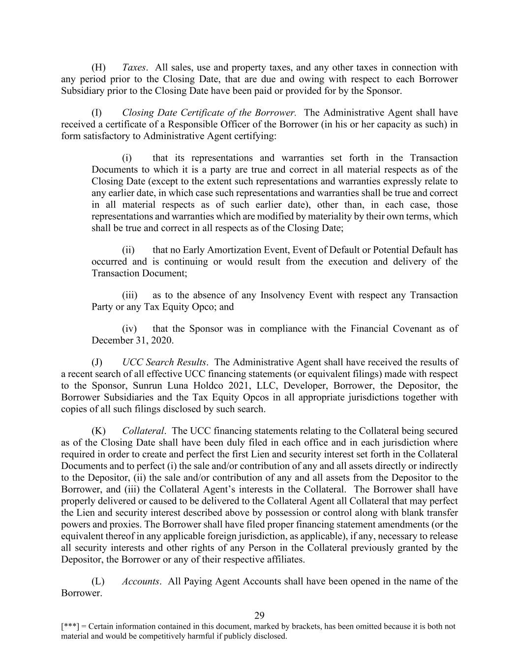 29 [***] = Certain information contained in this document, marked by brackets, has been omitted because it is both not material and would be competitively harmful if publicly disclosed. (H) Taxes. All sales, use and property taxes, and any other taxes in connection with any period prior to the Closing Date, that are due and owing with respect to each Borrower Subsidiary prior to the Closing Date have been paid or provided for by the Sponsor. (I) Closing Date Certificate of the Borrower. The Administrative Agent shall have received a certificate of a Responsible Officer of the Borrower (in his or her capacity as such) in form satisfactory to Administrative Agent certifying: (i) that its representations and warranties set forth in the Transaction Documents to which it is a party are true and correct in all material respects as of the Closing Date (except to the extent such representations and warranties expressly relate to any earlier date, in which case such representations and warranties shall be true and correct in all material respects as of such earlier date), other than, in each case, those representations and warranties which are modified by materiality by their own terms, which shall be true and correct in all respects as of the Closing Date; (ii) that no Early Amortization Event, Event of Default or Potential Default has occurred and is continuing or would result from the execution and delivery of the Transaction Document; (iii) as to the absence of any Insolvency Event with respect any Transaction Party or any Tax Equity Opco; and (iv) that the Sponsor was in compliance with the Financial Covenant as of December 31, 2020. (J) UCC Search Results. The Administrative Agent shall have received the results of a recent search of all effective UCC financing statements (or equivalent filings) made with respect to the Sponsor, Sunrun Luna Holdco 2021, LLC, Developer, Borrower, the Depositor, the Borrower Subsidiaries and the Tax Equity Opcos in all appropriate jurisdictions together with copies of all such filings disclosed by such search. (K) Collateral. The UCC financing statements relating to the Collateral being secured as of the Closing Date shall have been duly filed in each office and in each jurisdiction where required in order to create and perfect the first Lien and security interest set forth in the Collateral Documents and to perfect (i) the sale and/or contribution of any and all assets directly or indirectly to the Depositor, (ii) the sale and/or contribution of any and all assets from the Depositor to the Borrower, and (iii) the Collateral Agent’s interests in the Collateral. The Borrower shall have properly delivered or caused to be delivered to the Collateral Agent all Collateral that may perfect the Lien and security interest described above by possession or control along with blank transfer powers and proxies. The Borrower shall have filed proper financing statement amendments (or the equivalent thereof in any applicable foreign jurisdiction, as applicable), if any, necessary to release all security interests and other rights of any Person in the Collateral previously granted by the Depositor, the Borrower or any of their respective affiliates. (L) Accounts. All Paying Agent Accounts shall have been opened in the name of the Borrower.