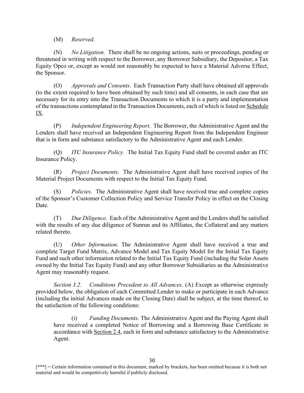 30 [***] = Certain information contained in this document, marked by brackets, has been omitted because it is both not material and would be competitively harmful if publicly disclosed. (M) Reserved. (N) No Litigation. There shall be no ongoing actions, suits or proceedings, pending or threatened in writing with respect to the Borrower, any Borrower Subsidiary, the Depositor, a Tax Equity Opco or, except as would not reasonably be expected to have a Material Adverse Effect, the Sponsor. (O) Approvals and Consents. Each Transaction Party shall have obtained all approvals (to the extent required to have been obtained by such time) and all consents, in each case that are necessary for its entry into the Transaction Documents to which it is a party and implementation of the transactions contemplated in the Transaction Documents, each of which is listed on Schedule IX. (P) Independent Engineering Report. The Borrower, the Administrative Agent and the Lenders shall have received an Independent Engineering Report from the Independent Engineer that is in form and substance satisfactory to the Administrative Agent and each Lender. (Q) ITC Insurance Policy. The Initial Tax Equity Fund shall be covered under an ITC Insurance Policy. (R) Project Documents. The Administrative Agent shall have received copies of the Material Project Documents with respect to the Initial Tax Equity Fund. (S) Policies. The Administrative Agent shall have received true and complete copies of the Sponsor’s Customer Collection Policy and Service Transfer Policy in effect on the Closing Date. (T) Due Diligence. Each of the Administrative Agent and the Lenders shall be satisfied with the results of any due diligence of Sunrun and its Affiliates, the Collateral and any matters related thereto. (U) Other Information. The Administrative Agent shall have received a true and complete Target Fund Matrix, Advance Model and Tax Equity Model for the Initial Tax Equity Fund and such other information related to the Initial Tax Equity Fund (including the Solar Assets owned by the Initial Tax Equity Fund) and any other Borrower Subsidiaries as the Administrative Agent may reasonably request. Section 3.2. Conditions Precedent to All Advances. (A) Except as otherwise expressly provided below, the obligation of each Committed Lender to make or participate in each Advance (including the initial Advances made on the Closing Date) shall be subject, at the time thereof, to the satisfaction of the following conditions: (i) Funding Documents. The Administrative Agent and the Paying Agent shall have received a completed Notice of Borrowing and a Borrowing Base Certificate in accordance with Section 2.4, each in form and substance satisfactory to the Administrative Agent.