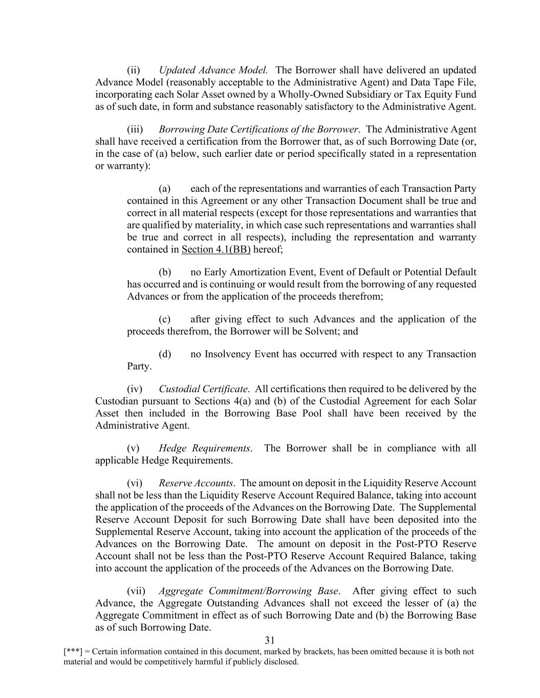 31 [***] = Certain information contained in this document, marked by brackets, has been omitted because it is both not material and would be competitively harmful if publicly disclosed. (ii) Updated Advance Model. The Borrower shall have delivered an updated Advance Model (reasonably acceptable to the Administrative Agent) and Data Tape File, incorporating each Solar Asset owned by a Wholly-Owned Subsidiary or Tax Equity Fund as of such date, in form and substance reasonably satisfactory to the Administrative Agent. (iii) Borrowing Date Certifications of the Borrower. The Administrative Agent shall have received a certification from the Borrower that, as of such Borrowing Date (or, in the case of (a) below, such earlier date or period specifically stated in a representation or warranty): (a) each of the representations and warranties of each Transaction Party contained in this Agreement or any other Transaction Document shall be true and correct in all material respects (except for those representations and warranties that are qualified by materiality, in which case such representations and warranties shall be true and correct in all respects), including the representation and warranty contained in Section 4.1(BB) hereof; (b) no Early Amortization Event, Event of Default or Potential Default has occurred and is continuing or would result from the borrowing of any requested Advances or from the application of the proceeds therefrom; (c) after giving effect to such Advances and the application of the proceeds therefrom, the Borrower will be Solvent; and (d) no Insolvency Event has occurred with respect to any Transaction Party. (iv) Custodial Certificate. All certifications then required to be delivered by the Custodian pursuant to Sections 4(a) and (b) of the Custodial Agreement for each Solar Asset then included in the Borrowing Base Pool shall have been received by the Administrative Agent. (v) Hedge Requirements. The Borrower shall be in compliance with all applicable Hedge Requirements. (vi) Reserve Accounts. The amount on deposit in the Liquidity Reserve Account shall not be less than the Liquidity Reserve Account Required Balance, taking into account the application of the proceeds of the Advances on the Borrowing Date. The Supplemental Reserve Account Deposit for such Borrowing Date shall have been deposited into the Supplemental Reserve Account, taking into account the application of the proceeds of the Advances on the Borrowing Date. The amount on deposit in the Post-PTO Reserve Account shall not be less than the Post-PTO Reserve Account Required Balance, taking into account the application of the proceeds of the Advances on the Borrowing Date. (vii) Aggregate Commitment/Borrowing Base. After giving effect to such Advance, the Aggregate Outstanding Advances shall not exceed the lesser of (a) the Aggregate Commitment in effect as of such Borrowing Date and (b) the Borrowing Base as of such Borrowing Date.
