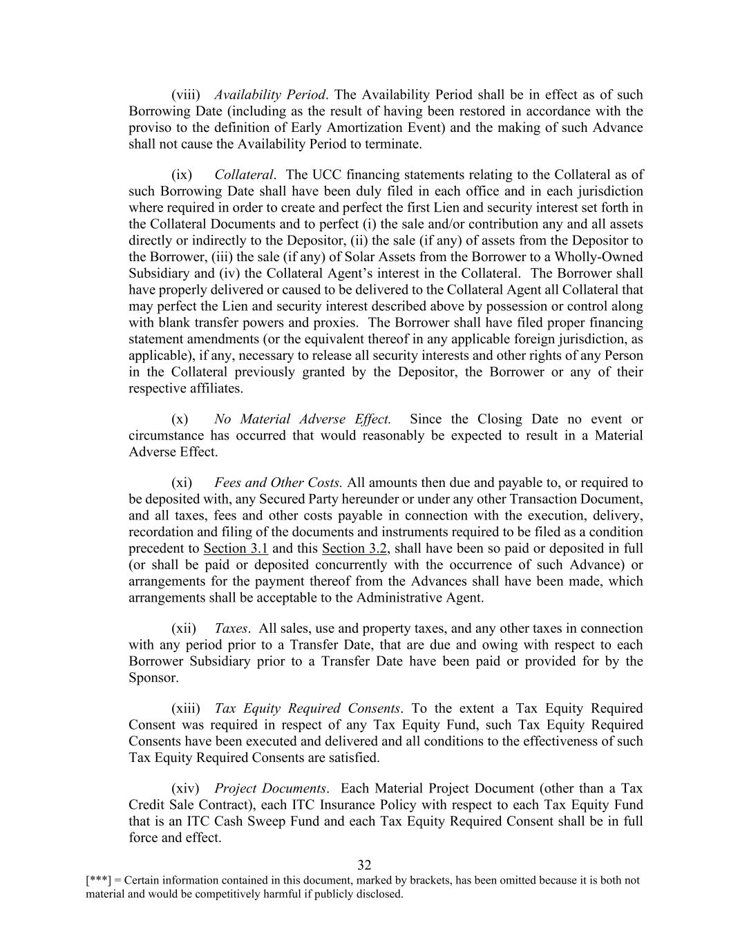 32 [***] = Certain information contained in this document, marked by brackets, has been omitted because it is both not material and would be competitively harmful if publicly disclosed. (viii) Availability Period. The Availability Period shall be in effect as of such Borrowing Date (including as the result of having been restored in accordance with the proviso to the definition of Early Amortization Event) and the making of such Advance shall not cause the Availability Period to terminate. (ix) Collateral. The UCC financing statements relating to the Collateral as of such Borrowing Date shall have been duly filed in each office and in each jurisdiction where required in order to create and perfect the first Lien and security interest set forth in the Collateral Documents and to perfect (i) the sale and/or contribution any and all assets directly or indirectly to the Depositor, (ii) the sale (if any) of assets from the Depositor to the Borrower, (iii) the sale (if any) of Solar Assets from the Borrower to a Wholly-Owned Subsidiary and (iv) the Collateral Agent’s interest in the Collateral. The Borrower shall have properly delivered or caused to be delivered to the Collateral Agent all Collateral that may perfect the Lien and security interest described above by possession or control along with blank transfer powers and proxies. The Borrower shall have filed proper financing statement amendments (or the equivalent thereof in any applicable foreign jurisdiction, as applicable), if any, necessary to release all security interests and other rights of any Person in the Collateral previously granted by the Depositor, the Borrower or any of their respective affiliates. (x) No Material Adverse Effect. Since the Closing Date no event or circumstance has occurred that would reasonably be expected to result in a Material Adverse Effect. (xi) Fees and Other Costs. All amounts then due and payable to, or required to be deposited with, any Secured Party hereunder or under any other Transaction Document, and all taxes, fees and other costs payable in connection with the execution, delivery, recordation and filing of the documents and instruments required to be filed as a condition precedent to Section 3.1 and this Section 3.2, shall have been so paid or deposited in full (or shall be paid or deposited concurrently with the occurrence of such Advance) or arrangements for the payment thereof from the Advances shall have been made, which arrangements shall be acceptable to the Administrative Agent. (xii) Taxes. All sales, use and property taxes, and any other taxes in connection with any period prior to a Transfer Date, that are due and owing with respect to each Borrower Subsidiary prior to a Transfer Date have been paid or provided for by the Sponsor. (xiii) Tax Equity Required Consents. To the extent a Tax Equity Required Consent was required in respect of any Tax Equity Fund, such Tax Equity Required Consents have been executed and delivered and all conditions to the effectiveness of such Tax Equity Required Consents are satisfied. (xiv) Project Documents. Each Material Project Document (other than a Tax Credit Sale Contract), each ITC Insurance Policy with respect to each Tax Equity Fund that is an ITC Cash Sweep Fund and each Tax Equity Required Consent shall be in full force and effect.
