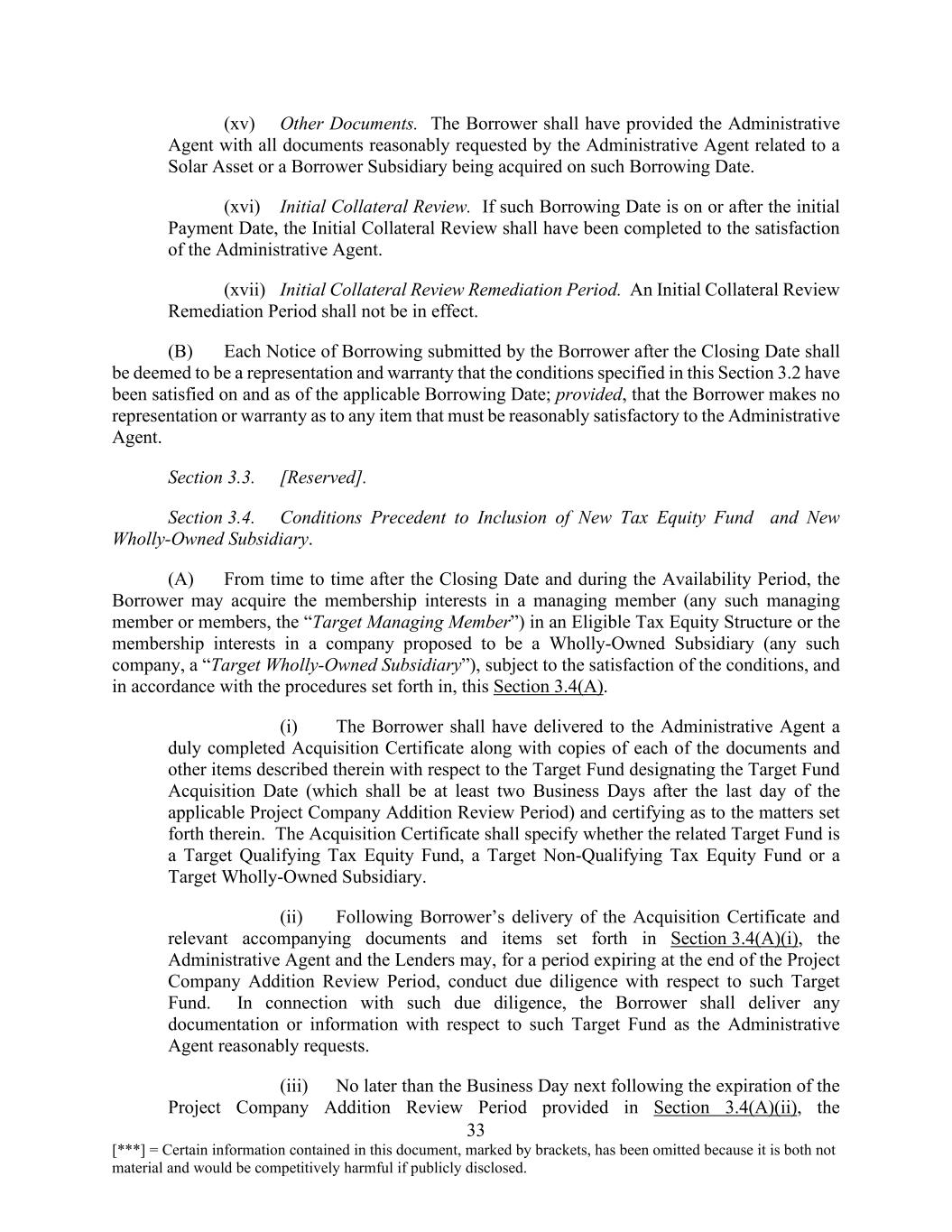 33 [***] = Certain information contained in this document, marked by brackets, has been omitted because it is both not material and would be competitively harmful if publicly disclosed. (xv) Other Documents. The Borrower shall have provided the Administrative Agent with all documents reasonably requested by the Administrative Agent related to a Solar Asset or a Borrower Subsidiary being acquired on such Borrowing Date. (xvi) Initial Collateral Review. If such Borrowing Date is on or after the initial Payment Date, the Initial Collateral Review shall have been completed to the satisfaction of the Administrative Agent. (xvii) Initial Collateral Review Remediation Period. An Initial Collateral Review Remediation Period shall not be in effect. (B) Each Notice of Borrowing submitted by the Borrower after the Closing Date shall be deemed to be a representation and warranty that the conditions specified in this Section 3.2 have been satisfied on and as of the applicable Borrowing Date; provided, that the Borrower makes no representation or warranty as to any item that must be reasonably satisfactory to the Administrative Agent. Section 3.3. [Reserved]. Section 3.4. Conditions Precedent to Inclusion of New Tax Equity Fund and New Wholly-Owned Subsidiary. (A) From time to time after the Closing Date and during the Availability Period, the Borrower may acquire the membership interests in a managing member (any such managing member or members, the “Target Managing Member”) in an Eligible Tax Equity Structure or the membership interests in a company proposed to be a Wholly-Owned Subsidiary (any such company, a “Target Wholly-Owned Subsidiary”), subject to the satisfaction of the conditions, and in accordance with the procedures set forth in, this Section 3.4(A). (i) The Borrower shall have delivered to the Administrative Agent a duly completed Acquisition Certificate along with copies of each of the documents and other items described therein with respect to the Target Fund designating the Target Fund Acquisition Date (which shall be at least two Business Days after the last day of the applicable Project Company Addition Review Period) and certifying as to the matters set forth therein. The Acquisition Certificate shall specify whether the related Target Fund is a Target Qualifying Tax Equity Fund, a Target Non-Qualifying Tax Equity Fund or a Target Wholly-Owned Subsidiary. (ii) Following Borrower’s delivery of the Acquisition Certificate and relevant accompanying documents and items set forth in Section 3.4(A)(i), the Administrative Agent and the Lenders may, for a period expiring at the end of the Project Company Addition Review Period, conduct due diligence with respect to such Target Fund. In connection with such due diligence, the Borrower shall deliver any documentation or information with respect to such Target Fund as the Administrative Agent reasonably requests. (iii) No later than the Business Day next following the expiration of the Project Company Addition Review Period provided in Section 3.4(A)(ii), the