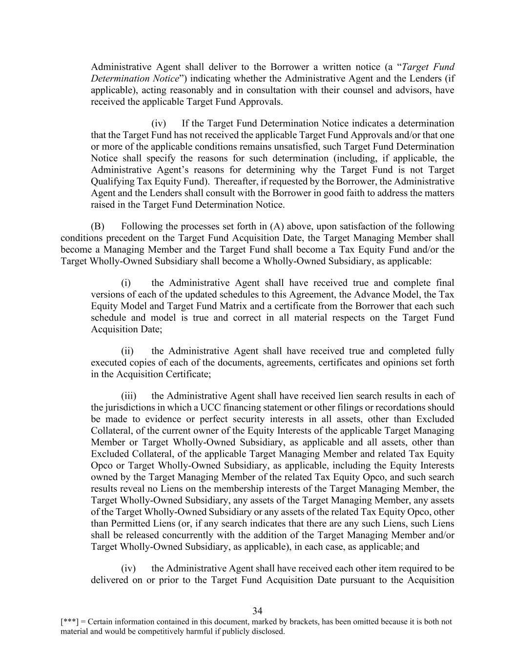 34 [***] = Certain information contained in this document, marked by brackets, has been omitted because it is both not material and would be competitively harmful if publicly disclosed. Administrative Agent shall deliver to the Borrower a written notice (a “Target Fund Determination Notice”) indicating whether the Administrative Agent and the Lenders (if applicable), acting reasonably and in consultation with their counsel and advisors, have received the applicable Target Fund Approvals. (iv) If the Target Fund Determination Notice indicates a determination that the Target Fund has not received the applicable Target Fund Approvals and/or that one or more of the applicable conditions remains unsatisfied, such Target Fund Determination Notice shall specify the reasons for such determination (including, if applicable, the Administrative Agent’s reasons for determining why the Target Fund is not Target Qualifying Tax Equity Fund). Thereafter, if requested by the Borrower, the Administrative Agent and the Lenders shall consult with the Borrower in good faith to address the matters raised in the Target Fund Determination Notice. (B) Following the processes set forth in (A) above, upon satisfaction of the following conditions precedent on the Target Fund Acquisition Date, the Target Managing Member shall become a Managing Member and the Target Fund shall become a Tax Equity Fund and/or the Target Wholly-Owned Subsidiary shall become a Wholly-Owned Subsidiary, as applicable: (i) the Administrative Agent shall have received true and complete final versions of each of the updated schedules to this Agreement, the Advance Model, the Tax Equity Model and Target Fund Matrix and a certificate from the Borrower that each such schedule and model is true and correct in all material respects on the Target Fund Acquisition Date; (ii) the Administrative Agent shall have received true and completed fully executed copies of each of the documents, agreements, certificates and opinions set forth in the Acquisition Certificate; (iii) the Administrative Agent shall have received lien search results in each of the jurisdictions in which a UCC financing statement or other filings or recordations should be made to evidence or perfect security interests in all assets, other than Excluded Collateral, of the current owner of the Equity Interests of the applicable Target Managing Member or Target Wholly-Owned Subsidiary, as applicable and all assets, other than Excluded Collateral, of the applicable Target Managing Member and related Tax Equity Opco or Target Wholly-Owned Subsidiary, as applicable, including the Equity Interests owned by the Target Managing Member of the related Tax Equity Opco, and such search results reveal no Liens on the membership interests of the Target Managing Member, the Target Wholly-Owned Subsidiary, any assets of the Target Managing Member, any assets of the Target Wholly-Owned Subsidiary or any assets of the related Tax Equity Opco, other than Permitted Liens (or, if any search indicates that there are any such Liens, such Liens shall be released concurrently with the addition of the Target Managing Member and/or Target Wholly-Owned Subsidiary, as applicable), in each case, as applicable; and (iv) the Administrative Agent shall have received each other item required to be delivered on or prior to the Target Fund Acquisition Date pursuant to the Acquisition