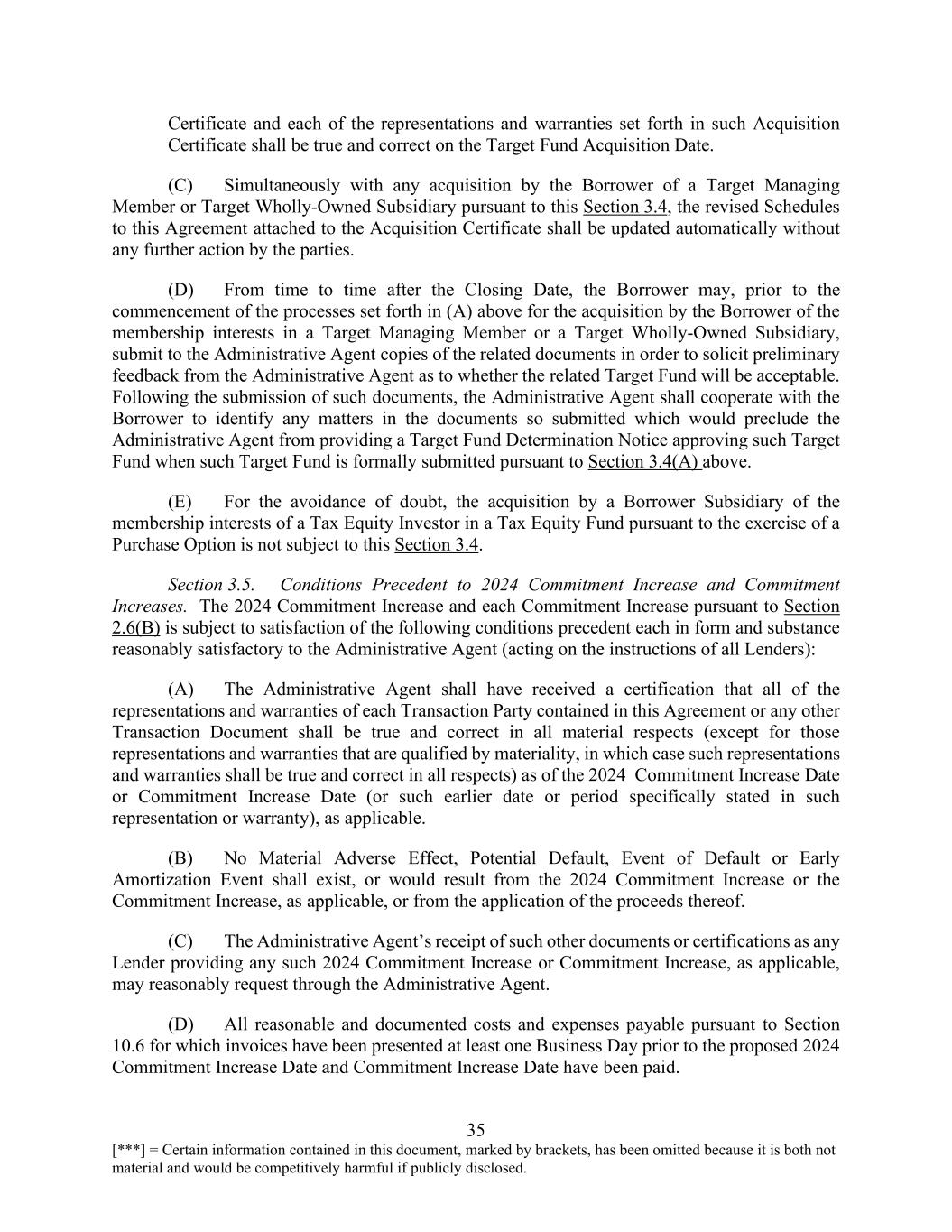 35 [***] = Certain information contained in this document, marked by brackets, has been omitted because it is both not material and would be competitively harmful if publicly disclosed. Certificate and each of the representations and warranties set forth in such Acquisition Certificate shall be true and correct on the Target Fund Acquisition Date. (C) Simultaneously with any acquisition by the Borrower of a Target Managing Member or Target Wholly-Owned Subsidiary pursuant to this Section 3.4, the revised Schedules to this Agreement attached to the Acquisition Certificate shall be updated automatically without any further action by the parties. (D) From time to time after the Closing Date, the Borrower may, prior to the commencement of the processes set forth in (A) above for the acquisition by the Borrower of the membership interests in a Target Managing Member or a Target Wholly-Owned Subsidiary, submit to the Administrative Agent copies of the related documents in order to solicit preliminary feedback from the Administrative Agent as to whether the related Target Fund will be acceptable. Following the submission of such documents, the Administrative Agent shall cooperate with the Borrower to identify any matters in the documents so submitted which would preclude the Administrative Agent from providing a Target Fund Determination Notice approving such Target Fund when such Target Fund is formally submitted pursuant to Section 3.4(A) above. (E) For the avoidance of doubt, the acquisition by a Borrower Subsidiary of the membership interests of a Tax Equity Investor in a Tax Equity Fund pursuant to the exercise of a Purchase Option is not subject to this Section 3.4. Section 3.5. Conditions Precedent to 2024 Commitment Increase and Commitment Increases. The 2024 Commitment Increase and each Commitment Increase pursuant to Section 2.6(B) is subject to satisfaction of the following conditions precedent each in form and substance reasonably satisfactory to the Administrative Agent (acting on the instructions of all Lenders): (A) The Administrative Agent shall have received a certification that all of the representations and warranties of each Transaction Party contained in this Agreement or any other Transaction Document shall be true and correct in all material respects (except for those representations and warranties that are qualified by materiality, in which case such representations and warranties shall be true and correct in all respects) as of the 2024 Commitment Increase Date or Commitment Increase Date (or such earlier date or period specifically stated in such representation or warranty), as applicable. (B) No Material Adverse Effect, Potential Default, Event of Default or Early Amortization Event shall exist, or would result from the 2024 Commitment Increase or the Commitment Increase, as applicable, or from the application of the proceeds thereof. (C) The Administrative Agent’s receipt of such other documents or certifications as any Lender providing any such 2024 Commitment Increase or Commitment Increase, as applicable, may reasonably request through the Administrative Agent. (D) All reasonable and documented costs and expenses payable pursuant to Section 10.6 for which invoices have been presented at least one Business Day prior to the proposed 2024 Commitment Increase Date and Commitment Increase Date have been paid.