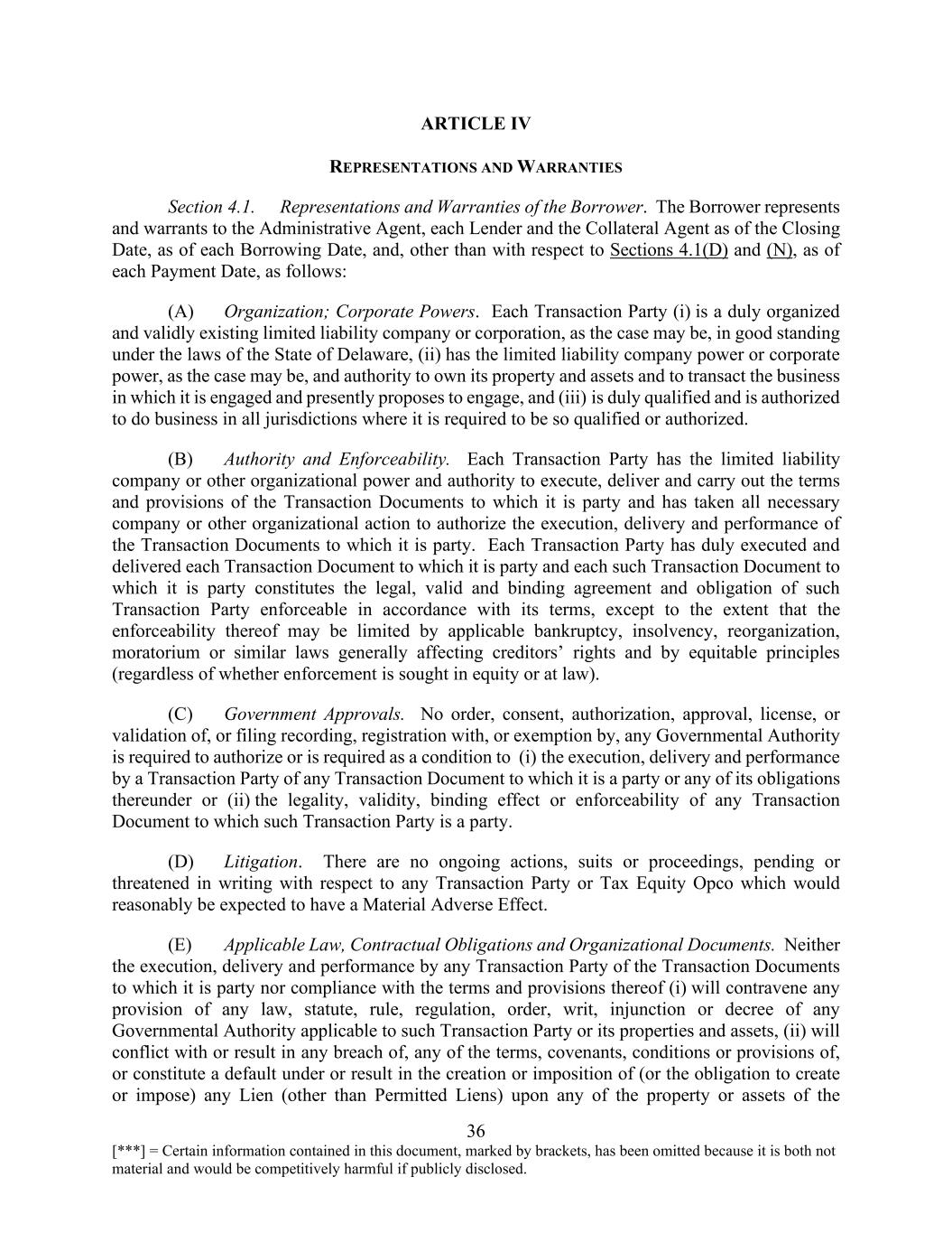 36 [***] = Certain information contained in this document, marked by brackets, has been omitted because it is both not material and would be competitively harmful if publicly disclosed. ARTICLE IV REPRESENTATIONS AND WARRANTIES Section 4.1. Representations and Warranties of the Borrower. The Borrower represents and warrants to the Administrative Agent, each Lender and the Collateral Agent as of the Closing Date, as of each Borrowing Date, and, other than with respect to Sections 4.1(D) and (N), as of each Payment Date, as follows: (A) Organization; Corporate Powers. Each Transaction Party (i) is a duly organized and validly existing limited liability company or corporation, as the case may be, in good standing under the laws of the State of Delaware, (ii) has the limited liability company power or corporate power, as the case may be, and authority to own its property and assets and to transact the business in which it is engaged and presently proposes to engage, and (iii) is duly qualified and is authorized to do business in all jurisdictions where it is required to be so qualified or authorized. (B) Authority and Enforceability. Each Transaction Party has the limited liability company or other organizational power and authority to execute, deliver and carry out the terms and provisions of the Transaction Documents to which it is party and has taken all necessary company or other organizational action to authorize the execution, delivery and performance of the Transaction Documents to which it is party. Each Transaction Party has duly executed and delivered each Transaction Document to which it is party and each such Transaction Document to which it is party constitutes the legal, valid and binding agreement and obligation of such Transaction Party enforceable in accordance with its terms, except to the extent that the enforceability thereof may be limited by applicable bankruptcy, insolvency, reorganization, moratorium or similar laws generally affecting creditors’ rights and by equitable principles (regardless of whether enforcement is sought in equity or at law). (C) Government Approvals. No order, consent, authorization, approval, license, or validation of, or filing recording, registration with, or exemption by, any Governmental Authority is required to authorize or is required as a condition to (i) the execution, delivery and performance by a Transaction Party of any Transaction Document to which it is a party or any of its obligations thereunder or (ii) the legality, validity, binding effect or enforceability of any Transaction Document to which such Transaction Party is a party. (D) Litigation. There are no ongoing actions, suits or proceedings, pending or threatened in writing with respect to any Transaction Party or Tax Equity Opco which would reasonably be expected to have a Material Adverse Effect. (E) Applicable Law, Contractual Obligations and Organizational Documents. Neither the execution, delivery and performance by any Transaction Party of the Transaction Documents to which it is party nor compliance with the terms and provisions thereof (i) will contravene any provision of any law, statute, rule, regulation, order, writ, injunction or decree of any Governmental Authority applicable to such Transaction Party or its properties and assets, (ii) will conflict with or result in any breach of, any of the terms, covenants, conditions or provisions of, or constitute a default under or result in the creation or imposition of (or the obligation to create or impose) any Lien (other than Permitted Liens) upon any of the property or assets of the