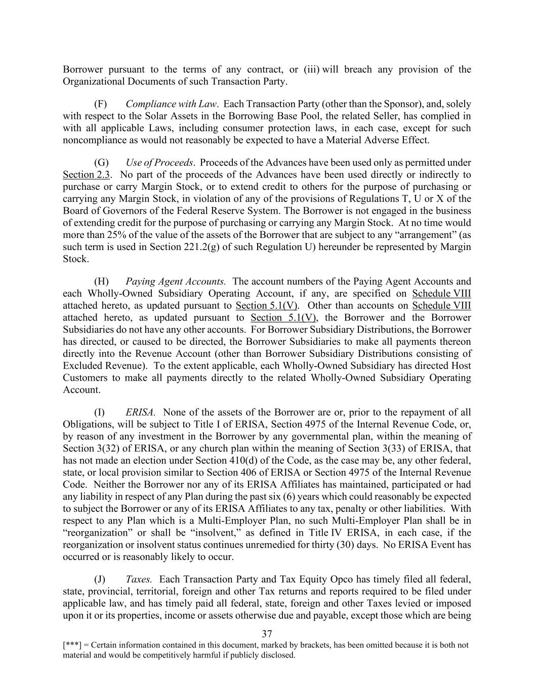 37 [***] = Certain information contained in this document, marked by brackets, has been omitted because it is both not material and would be competitively harmful if publicly disclosed. Borrower pursuant to the terms of any contract, or (iii) will breach any provision of the Organizational Documents of such Transaction Party. (F) Compliance with Law. Each Transaction Party (other than the Sponsor), and, solely with respect to the Solar Assets in the Borrowing Base Pool, the related Seller, has complied in with all applicable Laws, including consumer protection laws, in each case, except for such noncompliance as would not reasonably be expected to have a Material Adverse Effect. (G) Use of Proceeds. Proceeds of the Advances have been used only as permitted under Section 2.3. No part of the proceeds of the Advances have been used directly or indirectly to purchase or carry Margin Stock, or to extend credit to others for the purpose of purchasing or carrying any Margin Stock, in violation of any of the provisions of Regulations T, U or X of the Board of Governors of the Federal Reserve System. The Borrower is not engaged in the business of extending credit for the purpose of purchasing or carrying any Margin Stock. At no time would more than 25% of the value of the assets of the Borrower that are subject to any “arrangement” (as such term is used in Section 221.2(g) of such Regulation U) hereunder be represented by Margin Stock. (H) Paying Agent Accounts. The account numbers of the Paying Agent Accounts and each Wholly-Owned Subsidiary Operating Account, if any, are specified on Schedule VIII attached hereto, as updated pursuant to Section 5.1(V). Other than accounts on Schedule VIII attached hereto, as updated pursuant to Section 5.1(V), the Borrower and the Borrower Subsidiaries do not have any other accounts. For Borrower Subsidiary Distributions, the Borrower has directed, or caused to be directed, the Borrower Subsidiaries to make all payments thereon directly into the Revenue Account (other than Borrower Subsidiary Distributions consisting of Excluded Revenue). To the extent applicable, each Wholly-Owned Subsidiary has directed Host Customers to make all payments directly to the related Wholly-Owned Subsidiary Operating Account. (I) ERISA. None of the assets of the Borrower are or, prior to the repayment of all Obligations, will be subject to Title I of ERISA, Section 4975 of the Internal Revenue Code, or, by reason of any investment in the Borrower by any governmental plan, within the meaning of Section 3(32) of ERISA, or any church plan within the meaning of Section 3(33) of ERISA, that has not made an election under Section 410(d) of the Code, as the case may be, any other federal, state, or local provision similar to Section 406 of ERISA or Section 4975 of the Internal Revenue Code. Neither the Borrower nor any of its ERISA Affiliates has maintained, participated or had any liability in respect of any Plan during the past six (6) years which could reasonably be expected to subject the Borrower or any of its ERISA Affiliates to any tax, penalty or other liabilities. With respect to any Plan which is a Multi-Employer Plan, no such Multi-Employer Plan shall be in “reorganization” or shall be “insolvent,” as defined in Title IV ERISA, in each case, if the reorganization or insolvent status continues unremedied for thirty (30) days. No ERISA Event has occurred or is reasonably likely to occur. (J) Taxes. Each Transaction Party and Tax Equity Opco has timely filed all federal, state, provincial, territorial, foreign and other Tax returns and reports required to be filed under applicable law, and has timely paid all federal, state, foreign and other Taxes levied or imposed upon it or its properties, income or assets otherwise due and payable, except those which are being