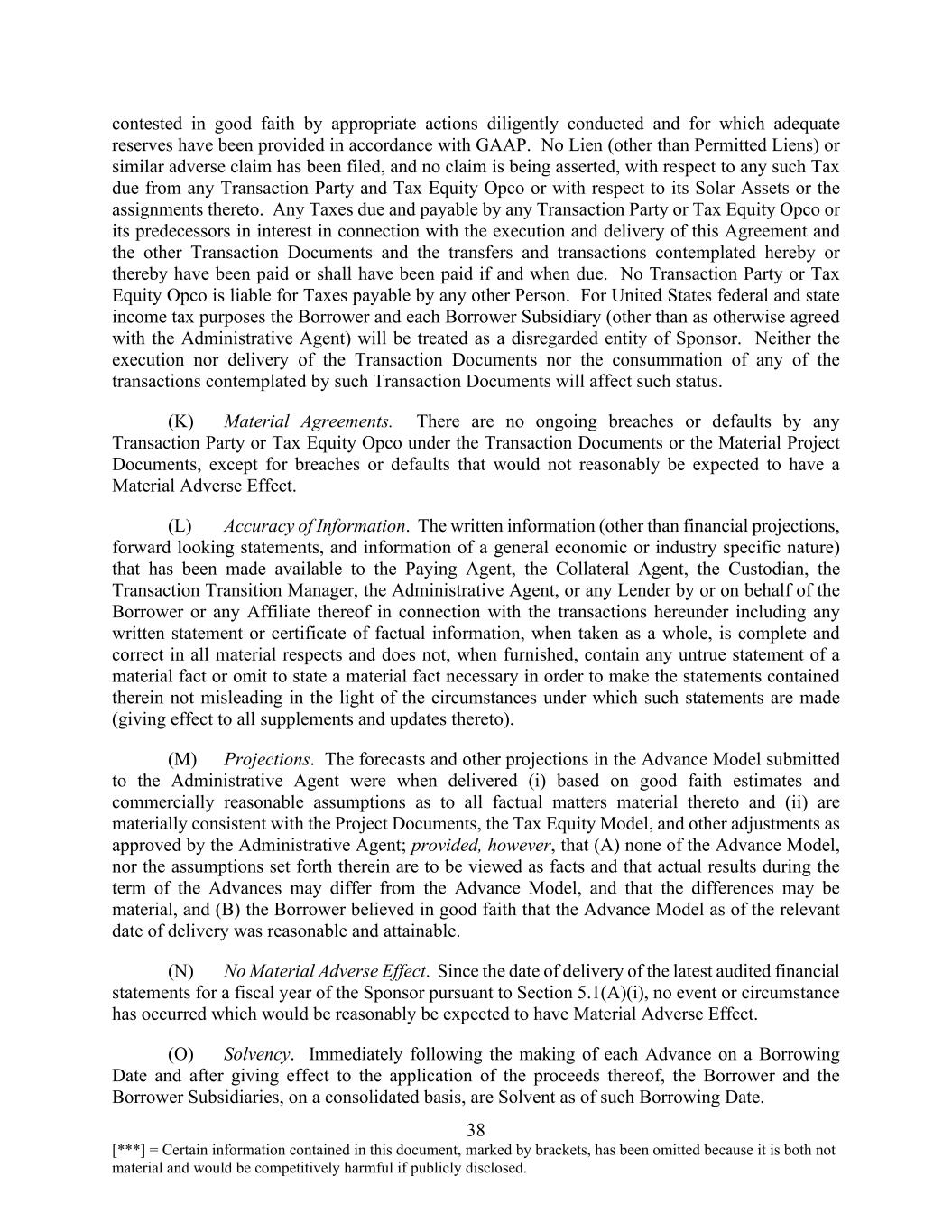 38 [***] = Certain information contained in this document, marked by brackets, has been omitted because it is both not material and would be competitively harmful if publicly disclosed. contested in good faith by appropriate actions diligently conducted and for which adequate reserves have been provided in accordance with GAAP. No Lien (other than Permitted Liens) or similar adverse claim has been filed, and no claim is being asserted, with respect to any such Tax due from any Transaction Party and Tax Equity Opco or with respect to its Solar Assets or the assignments thereto. Any Taxes due and payable by any Transaction Party or Tax Equity Opco or its predecessors in interest in connection with the execution and delivery of this Agreement and the other Transaction Documents and the transfers and transactions contemplated hereby or thereby have been paid or shall have been paid if and when due. No Transaction Party or Tax Equity Opco is liable for Taxes payable by any other Person. For United States federal and state income tax purposes the Borrower and each Borrower Subsidiary (other than as otherwise agreed with the Administrative Agent) will be treated as a disregarded entity of Sponsor. Neither the execution nor delivery of the Transaction Documents nor the consummation of any of the transactions contemplated by such Transaction Documents will affect such status. (K) Material Agreements. There are no ongoing breaches or defaults by any Transaction Party or Tax Equity Opco under the Transaction Documents or the Material Project Documents, except for breaches or defaults that would not reasonably be expected to have a Material Adverse Effect. (L) Accuracy of Information. The written information (other than financial projections, forward looking statements, and information of a general economic or industry specific nature) that has been made available to the Paying Agent, the Collateral Agent, the Custodian, the Transaction Transition Manager, the Administrative Agent, or any Lender by or on behalf of the Borrower or any Affiliate thereof in connection with the transactions hereunder including any written statement or certificate of factual information, when taken as a whole, is complete and correct in all material respects and does not, when furnished, contain any untrue statement of a material fact or omit to state a material fact necessary in order to make the statements contained therein not misleading in the light of the circumstances under which such statements are made (giving effect to all supplements and updates thereto). (M) Projections. The forecasts and other projections in the Advance Model submitted to the Administrative Agent were when delivered (i) based on good faith estimates and commercially reasonable assumptions as to all factual matters material thereto and (ii) are materially consistent with the Project Documents, the Tax Equity Model, and other adjustments as approved by the Administrative Agent; provided, however, that (A) none of the Advance Model, nor the assumptions set forth therein are to be viewed as facts and that actual results during the term of the Advances may differ from the Advance Model, and that the differences may be material, and (B) the Borrower believed in good faith that the Advance Model as of the relevant date of delivery was reasonable and attainable. (N) No Material Adverse Effect. Since the date of delivery of the latest audited financial statements for a fiscal year of the Sponsor pursuant to Section 5.1(A)(i), no event or circumstance has occurred which would be reasonably be expected to have Material Adverse Effect. (O) Solvency. Immediately following the making of each Advance on a Borrowing Date and after giving effect to the application of the proceeds thereof, the Borrower and the Borrower Subsidiaries, on a consolidated basis, are Solvent as of such Borrowing Date.