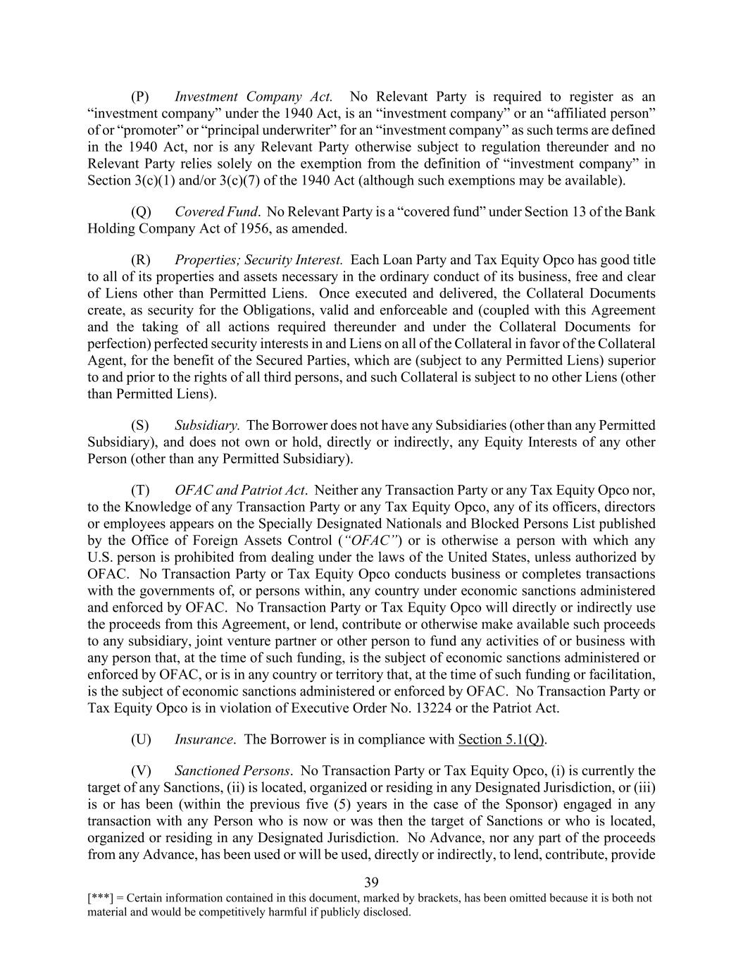 39 [***] = Certain information contained in this document, marked by brackets, has been omitted because it is both not material and would be competitively harmful if publicly disclosed. (P) Investment Company Act. No Relevant Party is required to register as an “investment company” under the 1940 Act, is an “investment company” or an “affiliated person” of or “promoter” or “principal underwriter” for an “investment company” as such terms are defined in the 1940 Act, nor is any Relevant Party otherwise subject to regulation thereunder and no Relevant Party relies solely on the exemption from the definition of “investment company” in Section 3(c)(1) and/or 3(c)(7) of the 1940 Act (although such exemptions may be available). (Q) Covered Fund. No Relevant Party is a “covered fund” under Section 13 of the Bank Holding Company Act of 1956, as amended. (R) Properties; Security Interest. Each Loan Party and Tax Equity Opco has good title to all of its properties and assets necessary in the ordinary conduct of its business, free and clear of Liens other than Permitted Liens. Once executed and delivered, the Collateral Documents create, as security for the Obligations, valid and enforceable and (coupled with this Agreement and the taking of all actions required thereunder and under the Collateral Documents for perfection) perfected security interests in and Liens on all of the Collateral in favor of the Collateral Agent, for the benefit of the Secured Parties, which are (subject to any Permitted Liens) superior to and prior to the rights of all third persons, and such Collateral is subject to no other Liens (other than Permitted Liens). (S) Subsidiary. The Borrower does not have any Subsidiaries (other than any Permitted Subsidiary), and does not own or hold, directly or indirectly, any Equity Interests of any other Person (other than any Permitted Subsidiary). (T) OFAC and Patriot Act. Neither any Transaction Party or any Tax Equity Opco nor, to the Knowledge of any Transaction Party or any Tax Equity Opco, any of its officers, directors or employees appears on the Specially Designated Nationals and Blocked Persons List published by the Office of Foreign Assets Control (“OFAC”) or is otherwise a person with which any U.S. person is prohibited from dealing under the laws of the United States, unless authorized by OFAC. No Transaction Party or Tax Equity Opco conducts business or completes transactions with the governments of, or persons within, any country under economic sanctions administered and enforced by OFAC. No Transaction Party or Tax Equity Opco will directly or indirectly use the proceeds from this Agreement, or lend, contribute or otherwise make available such proceeds to any subsidiary, joint venture partner or other person to fund any activities of or business with any person that, at the time of such funding, is the subject of economic sanctions administered or enforced by OFAC, or is in any country or territory that, at the time of such funding or facilitation, is the subject of economic sanctions administered or enforced by OFAC. No Transaction Party or Tax Equity Opco is in violation of Executive Order No. 13224 or the Patriot Act. (U) Insurance. The Borrower is in compliance with Section 5.1(Q). (V) Sanctioned Persons. No Transaction Party or Tax Equity Opco, (i) is currently the target of any Sanctions, (ii) is located, organized or residing in any Designated Jurisdiction, or (iii) is or has been (within the previous five (5) years in the case of the Sponsor) engaged in any transaction with any Person who is now or was then the target of Sanctions or who is located, organized or residing in any Designated Jurisdiction. No Advance, nor any part of the proceeds from any Advance, has been used or will be used, directly or indirectly, to lend, contribute, provide