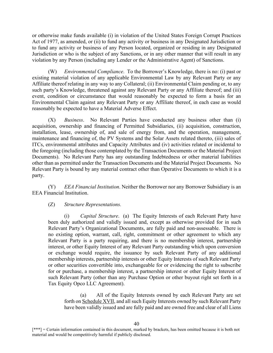 40 [***] = Certain information contained in this document, marked by brackets, has been omitted because it is both not material and would be competitively harmful if publicly disclosed. or otherwise make funds available (i) in violation of the United States Foreign Corrupt Practices Act of 1977, as amended, or (ii) to fund any activity or business in any Designated Jurisdiction or to fund any activity or business of any Person located, organized or residing in any Designated Jurisdiction or who is the subject of any Sanctions, or in any other manner that will result in any violation by any Person (including any Lender or the Administrative Agent) of Sanctions. (W) Environmental Compliance. To the Borrower’s Knowledge, there is no: (i) past or existing material violation of any applicable Environmental Law by any Relevant Party or any Affiliate thereof relating in any way to any Collateral; (ii) Environmental Claim pending or, to any such party’s Knowledge, threatened against any Relevant Party or any Affiliate thereof; and (iii) event, condition or circumstance that would reasonably be expected to form a basis for an Environmental Claim against any Relevant Party or any Affiliate thereof, in each case as would reasonably be expected to have a Material Adverse Effect. (X) Business. No Relevant Parties have conducted any business other than (i) acquisition, ownership and financing of Permitted Subsidiaries, (ii) acquisition, construction, installation, lease, ownership of, and sale of energy from, and the operation, management, maintenance and financing of, the PV Systems and the Solar Assets related thereto, (iii) sales of ITCs, environmental attributes and Capacity Attributes and (iv) activities related or incidental to the foregoing (including those contemplated by the Transaction Documents or the Material Project Documents). No Relevant Party has any outstanding Indebtedness or other material liabilities other than as permitted under the Transaction Documents and the Material Project Documents. No Relevant Party is bound by any material contract other than Operative Documents to which it is a party. (Y) EEA Financial Institution. Neither the Borrower nor any Borrower Subsidiary is an EEA Financial Institution. (Z) Structure Representations. (i) Capital Structure. (a) The Equity Interests of each Relevant Party have been duly authorized and validly issued and, except as otherwise provided for in such Relevant Party’s Organizational Documents, are fully paid and non-assessable. There is no existing option, warrant, call, right, commitment or other agreement to which any Relevant Party is a party requiring, and there is no membership interest, partnership interest, or other Equity Interest of any Relevant Party outstanding which upon conversion or exchange would require, the issuance by such Relevant Party of any additional membership interests, partnership interests or other Equity Interests of such Relevant Party or other securities convertible into, exchangeable for or evidencing the right to subscribe for or purchase, a membership interest, a partnership interest or other Equity Interest of such Relevant Party (other than any Purchase Option or other buyout right set forth in a Tax Equity Opco LLC Agreement). (a) All of the Equity Interests owned by each Relevant Party are set forth on Schedule XVII, and all such Equity Interests owned by such Relevant Party have been validly issued and are fully paid and are owned free and clear of all Liens
