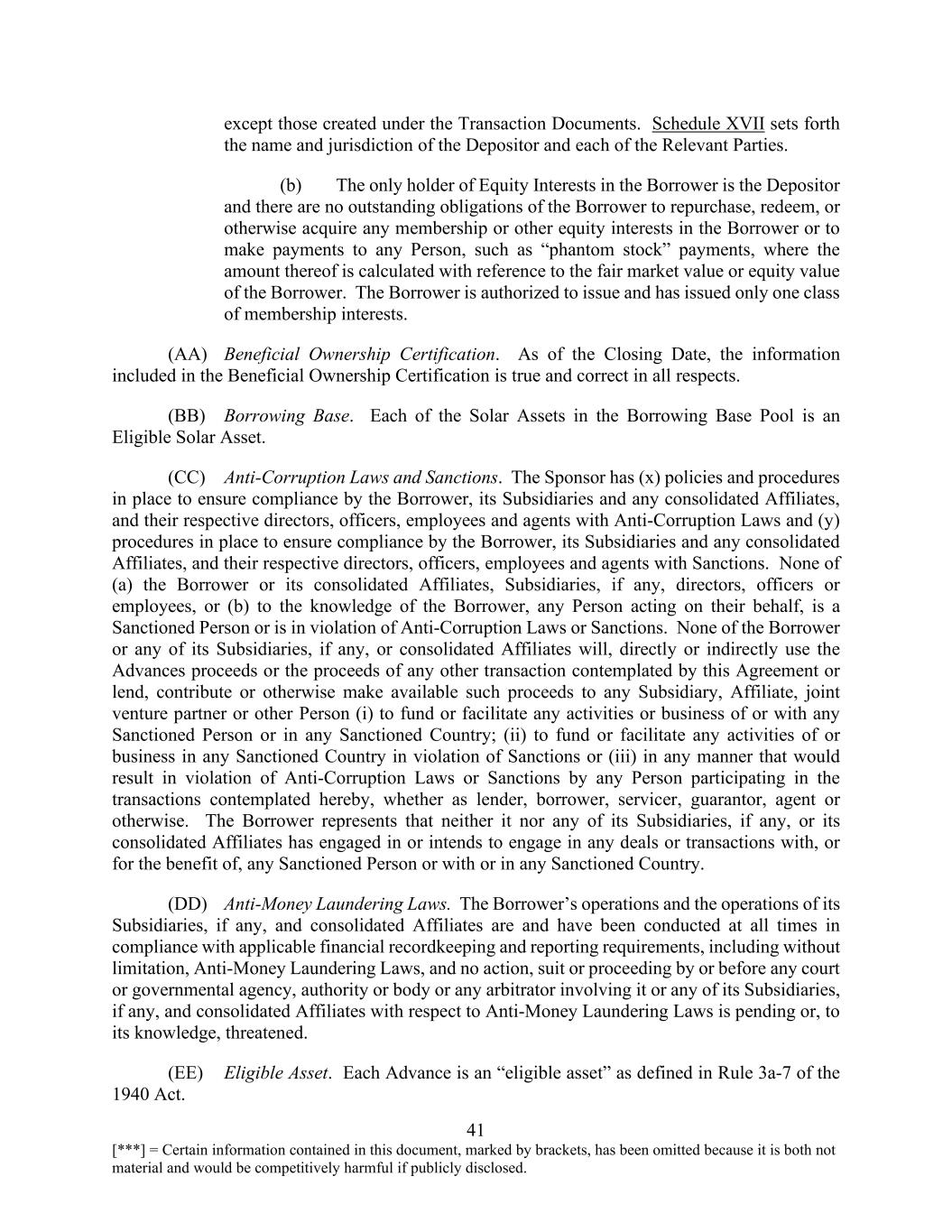 41 [***] = Certain information contained in this document, marked by brackets, has been omitted because it is both not material and would be competitively harmful if publicly disclosed. except those created under the Transaction Documents. Schedule XVII sets forth the name and jurisdiction of the Depositor and each of the Relevant Parties. (b) The only holder of Equity Interests in the Borrower is the Depositor and there are no outstanding obligations of the Borrower to repurchase, redeem, or otherwise acquire any membership or other equity interests in the Borrower or to make payments to any Person, such as “phantom stock” payments, where the amount thereof is calculated with reference to the fair market value or equity value of the Borrower. The Borrower is authorized to issue and has issued only one class of membership interests. (AA) Beneficial Ownership Certification. As of the Closing Date, the information included in the Beneficial Ownership Certification is true and correct in all respects. (BB) Borrowing Base. Each of the Solar Assets in the Borrowing Base Pool is an Eligible Solar Asset. (CC) Anti-Corruption Laws and Sanctions. The Sponsor has (x) policies and procedures in place to ensure compliance by the Borrower, its Subsidiaries and any consolidated Affiliates, and their respective directors, officers, employees and agents with Anti-Corruption Laws and (y) procedures in place to ensure compliance by the Borrower, its Subsidiaries and any consolidated Affiliates, and their respective directors, officers, employees and agents with Sanctions. None of (a) the Borrower or its consolidated Affiliates, Subsidiaries, if any, directors, officers or employees, or (b) to the knowledge of the Borrower, any Person acting on their behalf, is a Sanctioned Person or is in violation of Anti-Corruption Laws or Sanctions. None of the Borrower or any of its Subsidiaries, if any, or consolidated Affiliates will, directly or indirectly use the Advances proceeds or the proceeds of any other transaction contemplated by this Agreement or lend, contribute or otherwise make available such proceeds to any Subsidiary, Affiliate, joint venture partner or other Person (i) to fund or facilitate any activities or business of or with any Sanctioned Person or in any Sanctioned Country; (ii) to fund or facilitate any activities of or business in any Sanctioned Country in violation of Sanctions or (iii) in any manner that would result in violation of Anti-Corruption Laws or Sanctions by any Person participating in the transactions contemplated hereby, whether as lender, borrower, servicer, guarantor, agent or otherwise. The Borrower represents that neither it nor any of its Subsidiaries, if any, or its consolidated Affiliates has engaged in or intends to engage in any deals or transactions with, or for the benefit of, any Sanctioned Person or with or in any Sanctioned Country. (DD) Anti-Money Laundering Laws. The Borrower’s operations and the operations of its Subsidiaries, if any, and consolidated Affiliates are and have been conducted at all times in compliance with applicable financial recordkeeping and reporting requirements, including without limitation, Anti-Money Laundering Laws, and no action, suit or proceeding by or before any court or governmental agency, authority or body or any arbitrator involving it or any of its Subsidiaries, if any, and consolidated Affiliates with respect to Anti-Money Laundering Laws is pending or, to its knowledge, threatened. (EE) Eligible Asset. Each Advance is an “eligible asset” as defined in Rule 3a-7 of the 1940 Act.