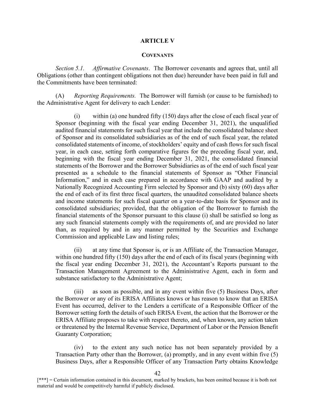 42 [***] = Certain information contained in this document, marked by brackets, has been omitted because it is both not material and would be competitively harmful if publicly disclosed. ARTICLE V COVENANTS Section 5.1. Affirmative Covenants. The Borrower covenants and agrees that, until all Obligations (other than contingent obligations not then due) hereunder have been paid in full and the Commitments have been terminated: (A) Reporting Requirements. The Borrower will furnish (or cause to be furnished) to the Administrative Agent for delivery to each Lender: (i) within (a) one hundred fifty (150) days after the close of each fiscal year of Sponsor (beginning with the fiscal year ending December 31, 2021), the unqualified audited financial statements for such fiscal year that include the consolidated balance sheet of Sponsor and its consolidated subsidiaries as of the end of such fiscal year, the related consolidated statements of income, of stockholders’ equity and of cash flows for such fiscal year, in each case, setting forth comparative figures for the preceding fiscal year, and, beginning with the fiscal year ending December 31, 2021, the consolidated financial statements of the Borrower and the Borrower Subsidiaries as of the end of such fiscal year presented as a schedule to the financial statements of Sponsor as “Other Financial Information,” and in each case prepared in accordance with GAAP and audited by a Nationally Recognized Accounting Firm selected by Sponsor and (b) sixty (60) days after the end of each of its first three fiscal quarters, the unaudited consolidated balance sheets and income statements for such fiscal quarter on a year-to-date basis for Sponsor and its consolidated subsidiaries; provided, that the obligation of the Borrower to furnish the financial statements of the Sponsor pursuant to this clause (i) shall be satisfied so long as any such financial statements comply with the requirements of, and are provided no later than, as required by and in any manner permitted by the Securities and Exchange Commission and applicable Law and listing rules; (ii) at any time that Sponsor is, or is an Affiliate of, the Transaction Manager, within one hundred fifty (150) days after the end of each of its fiscal years (beginning with the fiscal year ending December 31, 2021), the Accountant’s Reports pursuant to the Transaction Management Agreement to the Administrative Agent, each in form and substance satisfactory to the Administrative Agent; (iii) as soon as possible, and in any event within five (5) Business Days, after the Borrower or any of its ERISA Affiliates knows or has reason to know that an ERISA Event has occurred, deliver to the Lenders a certificate of a Responsible Officer of the Borrower setting forth the details of such ERISA Event, the action that the Borrower or the ERISA Affiliate proposes to take with respect thereto, and, when known, any action taken or threatened by the Internal Revenue Service, Department of Labor or the Pension Benefit Guaranty Corporation; (iv) to the extent any such notice has not been separately provided by a Transaction Party other than the Borrower, (a) promptly, and in any event within five (5) Business Days, after a Responsible Officer of any Transaction Party obtains Knowledge