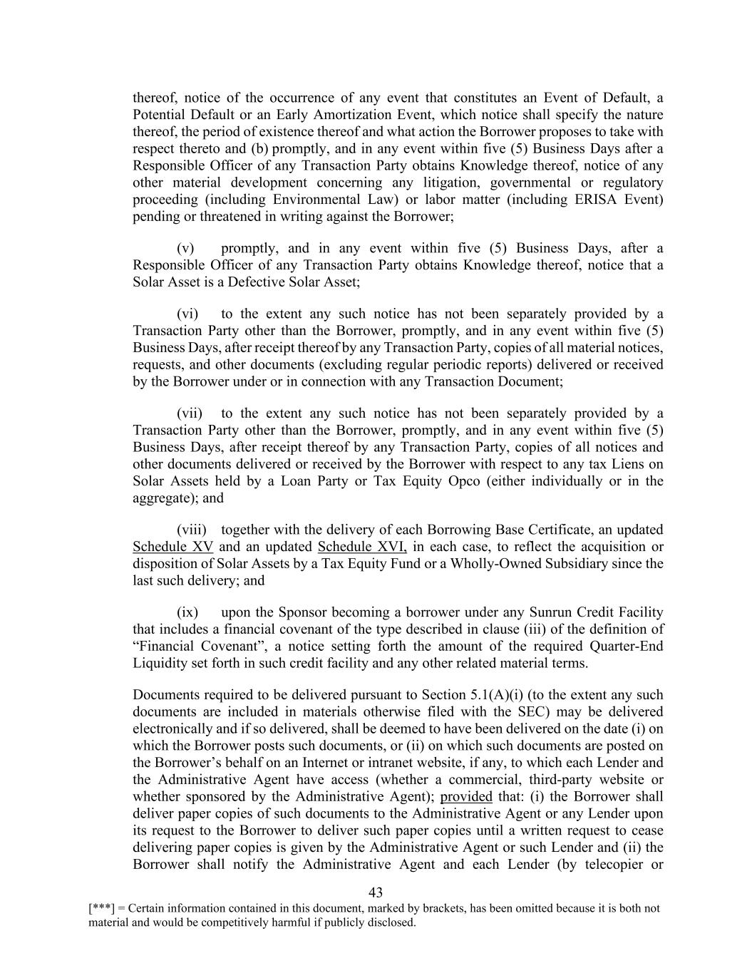 43 [***] = Certain information contained in this document, marked by brackets, has been omitted because it is both not material and would be competitively harmful if publicly disclosed. thereof, notice of the occurrence of any event that constitutes an Event of Default, a Potential Default or an Early Amortization Event, which notice shall specify the nature thereof, the period of existence thereof and what action the Borrower proposes to take with respect thereto and (b) promptly, and in any event within five (5) Business Days after a Responsible Officer of any Transaction Party obtains Knowledge thereof, notice of any other material development concerning any litigation, governmental or regulatory proceeding (including Environmental Law) or labor matter (including ERISA Event) pending or threatened in writing against the Borrower; (v) promptly, and in any event within five (5) Business Days, after a Responsible Officer of any Transaction Party obtains Knowledge thereof, notice that a Solar Asset is a Defective Solar Asset; (vi) to the extent any such notice has not been separately provided by a Transaction Party other than the Borrower, promptly, and in any event within five (5) Business Days, after receipt thereof by any Transaction Party, copies of all material notices, requests, and other documents (excluding regular periodic reports) delivered or received by the Borrower under or in connection with any Transaction Document; (vii) to the extent any such notice has not been separately provided by a Transaction Party other than the Borrower, promptly, and in any event within five (5) Business Days, after receipt thereof by any Transaction Party, copies of all notices and other documents delivered or received by the Borrower with respect to any tax Liens on Solar Assets held by a Loan Party or Tax Equity Opco (either individually or in the aggregate); and (viii) together with the delivery of each Borrowing Base Certificate, an updated Schedule XV and an updated Schedule XVI, in each case, to reflect the acquisition or disposition of Solar Assets by a Tax Equity Fund or a Wholly-Owned Subsidiary since the last such delivery; and (ix) upon the Sponsor becoming a borrower under any Sunrun Credit Facility that includes a financial covenant of the type described in clause (iii) of the definition of “Financial Covenant”, a notice setting forth the amount of the required Quarter-End Liquidity set forth in such credit facility and any other related material terms. Documents required to be delivered pursuant to Section 5.1(A)(i) (to the extent any such documents are included in materials otherwise filed with the SEC) may be delivered electronically and if so delivered, shall be deemed to have been delivered on the date (i) on which the Borrower posts such documents, or (ii) on which such documents are posted on the Borrower’s behalf on an Internet or intranet website, if any, to which each Lender and the Administrative Agent have access (whether a commercial, third-party website or whether sponsored by the Administrative Agent); provided that: (i) the Borrower shall deliver paper copies of such documents to the Administrative Agent or any Lender upon its request to the Borrower to deliver such paper copies until a written request to cease delivering paper copies is given by the Administrative Agent or such Lender and (ii) the Borrower shall notify the Administrative Agent and each Lender (by telecopier or