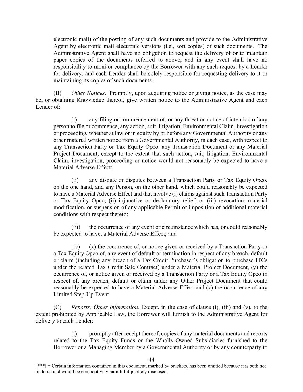 44 [***] = Certain information contained in this document, marked by brackets, has been omitted because it is both not material and would be competitively harmful if publicly disclosed. electronic mail) of the posting of any such documents and provide to the Administrative Agent by electronic mail electronic versions (i.e., soft copies) of such documents. The Administrative Agent shall have no obligation to request the delivery of or to maintain paper copies of the documents referred to above, and in any event shall have no responsibility to monitor compliance by the Borrower with any such request by a Lender for delivery, and each Lender shall be solely responsible for requesting delivery to it or maintaining its copies of such documents. (B) Other Notices. Promptly, upon acquiring notice or giving notice, as the case may be, or obtaining Knowledge thereof, give written notice to the Administrative Agent and each Lender of: (i) any filing or commencement of, or any threat or notice of intention of any person to file or commence, any action, suit, litigation, Environmental Claim, investigation or proceeding, whether at law or in equity by or before any Governmental Authority or any other material written notice from a Governmental Authority, in each case, with respect to any Transaction Party or Tax Equity Opco, any Transaction Document or any Material Project Document, except to the extent that such action, suit, litigation, Environmental Claim, investigation, proceeding or notice would not reasonably be expected to have a Material Adverse Effect; (ii) any dispute or disputes between a Transaction Party or Tax Equity Opco, on the one hand, and any Person, on the other hand, which could reasonably be expected to have a Material Adverse Effect and that involve (i) claims against such Transaction Party or Tax Equity Opco, (ii) injunctive or declaratory relief, or (iii) revocation, material modification, or suspension of any applicable Permit or imposition of additional material conditions with respect thereto; (iii) the occurrence of any event or circumstance which has, or could reasonably be expected to have, a Material Adverse Effect; and (iv) (x) the occurrence of, or notice given or received by a Transaction Party or a Tax Equity Opco of, any event of default or termination in respect of any breach, default or claim (including any breach of a Tax Credit Purchaser’s obligation to purchase ITCs under the related Tax Credit Sale Contract) under a Material Project Document, (y) the occurrence of, or notice given or received by a Transaction Party or a Tax Equity Opco in respect of, any breach, default or claim under any Other Project Document that could reasonably be expected to have a Material Adverse Effect and (z) the occurrence of any Limited Step-Up Event. (C) Reports; Other Information. Except, in the case of clause (i), (iii) and (v), to the extent prohibited by Applicable Law, the Borrower will furnish to the Administrative Agent for delivery to each Lender: (i) promptly after receipt thereof, copies of any material documents and reports related to the Tax Equity Funds or the Wholly-Owned Subsidiaries furnished to the Borrower or a Managing Member by a Governmental Authority or by any counterparty to