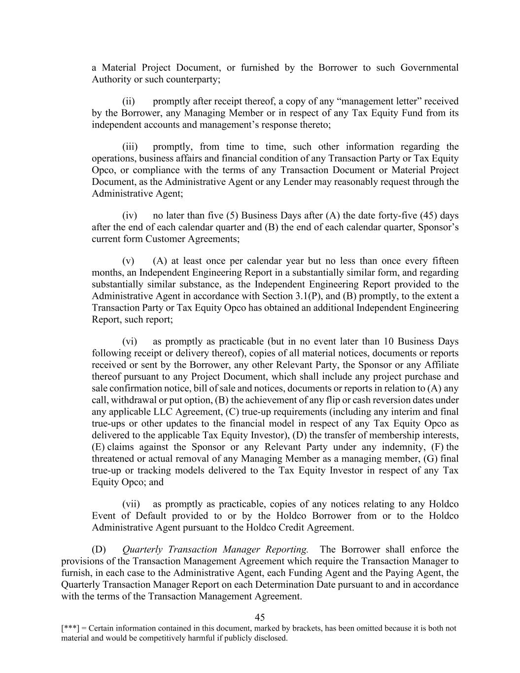 45 [***] = Certain information contained in this document, marked by brackets, has been omitted because it is both not material and would be competitively harmful if publicly disclosed. a Material Project Document, or furnished by the Borrower to such Governmental Authority or such counterparty; (ii) promptly after receipt thereof, a copy of any “management letter” received by the Borrower, any Managing Member or in respect of any Tax Equity Fund from its independent accounts and management’s response thereto; (iii) promptly, from time to time, such other information regarding the operations, business affairs and financial condition of any Transaction Party or Tax Equity Opco, or compliance with the terms of any Transaction Document or Material Project Document, as the Administrative Agent or any Lender may reasonably request through the Administrative Agent; (iv) no later than five (5) Business Days after (A) the date forty-five (45) days after the end of each calendar quarter and (B) the end of each calendar quarter, Sponsor’s current form Customer Agreements; (v) (A) at least once per calendar year but no less than once every fifteen months, an Independent Engineering Report in a substantially similar form, and regarding substantially similar substance, as the Independent Engineering Report provided to the Administrative Agent in accordance with Section 3.1(P), and (B) promptly, to the extent a Transaction Party or Tax Equity Opco has obtained an additional Independent Engineering Report, such report; (vi) as promptly as practicable (but in no event later than 10 Business Days following receipt or delivery thereof), copies of all material notices, documents or reports received or sent by the Borrower, any other Relevant Party, the Sponsor or any Affiliate thereof pursuant to any Project Document, which shall include any project purchase and sale confirmation notice, bill of sale and notices, documents or reports in relation to (A) any call, withdrawal or put option, (B) the achievement of any flip or cash reversion dates under any applicable LLC Agreement, (C) true-up requirements (including any interim and final true-ups or other updates to the financial model in respect of any Tax Equity Opco as delivered to the applicable Tax Equity Investor), (D) the transfer of membership interests, (E) claims against the Sponsor or any Relevant Party under any indemnity, (F) the threatened or actual removal of any Managing Member as a managing member, (G) final true-up or tracking models delivered to the Tax Equity Investor in respect of any Tax Equity Opco; and (vii) as promptly as practicable, copies of any notices relating to any Holdco Event of Default provided to or by the Holdco Borrower from or to the Holdco Administrative Agent pursuant to the Holdco Credit Agreement. (D) Quarterly Transaction Manager Reporting. The Borrower shall enforce the provisions of the Transaction Management Agreement which require the Transaction Manager to furnish, in each case to the Administrative Agent, each Funding Agent and the Paying Agent, the Quarterly Transaction Manager Report on each Determination Date pursuant to and in accordance with the terms of the Transaction Management Agreement.