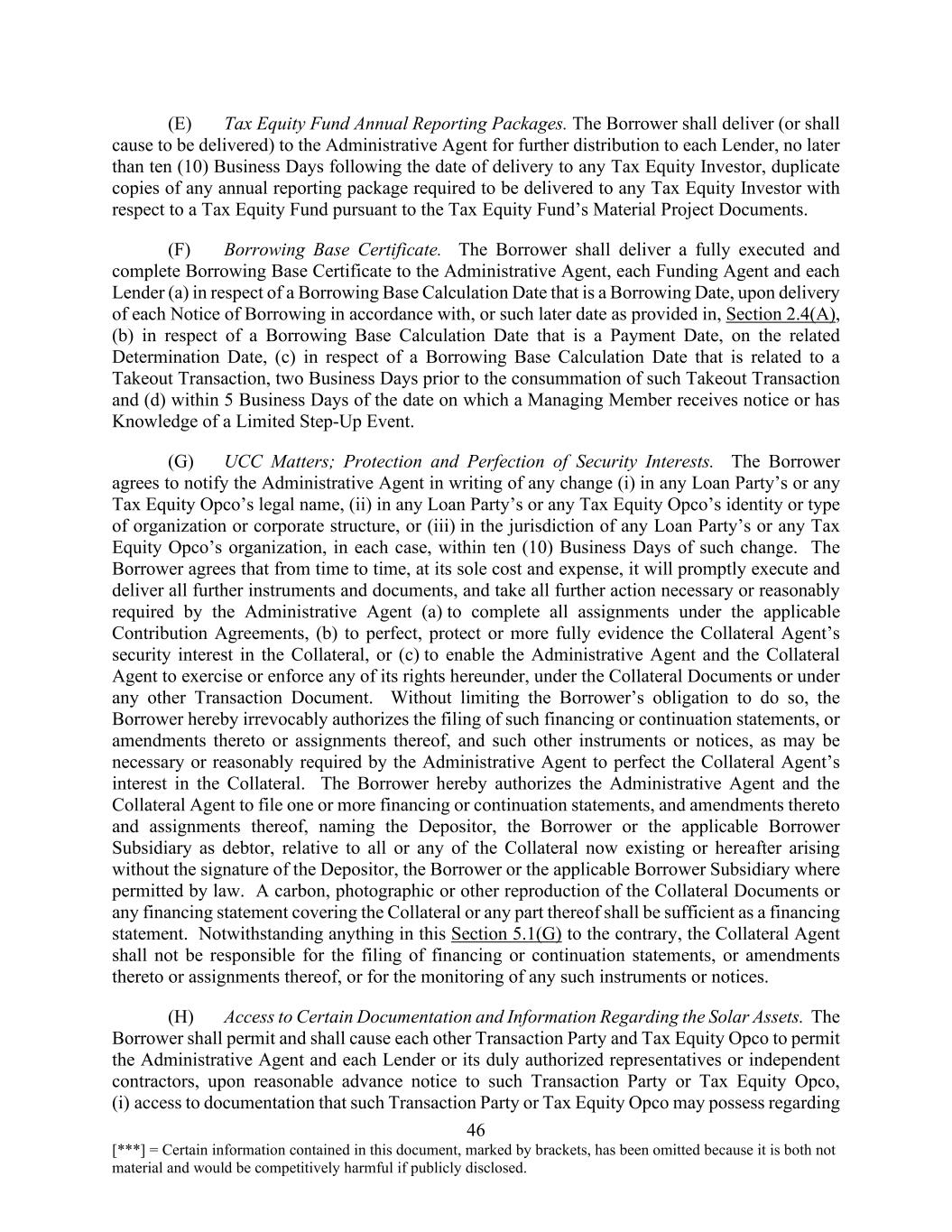 46 [***] = Certain information contained in this document, marked by brackets, has been omitted because it is both not material and would be competitively harmful if publicly disclosed. (E) Tax Equity Fund Annual Reporting Packages. The Borrower shall deliver (or shall cause to be delivered) to the Administrative Agent for further distribution to each Lender, no later than ten (10) Business Days following the date of delivery to any Tax Equity Investor, duplicate copies of any annual reporting package required to be delivered to any Tax Equity Investor with respect to a Tax Equity Fund pursuant to the Tax Equity Fund’s Material Project Documents. (F) Borrowing Base Certificate. The Borrower shall deliver a fully executed and complete Borrowing Base Certificate to the Administrative Agent, each Funding Agent and each Lender (a) in respect of a Borrowing Base Calculation Date that is a Borrowing Date, upon delivery of each Notice of Borrowing in accordance with, or such later date as provided in, Section 2.4(A), (b) in respect of a Borrowing Base Calculation Date that is a Payment Date, on the related Determination Date, (c) in respect of a Borrowing Base Calculation Date that is related to a Takeout Transaction, two Business Days prior to the consummation of such Takeout Transaction and (d) within 5 Business Days of the date on which a Managing Member receives notice or has Knowledge of a Limited Step-Up Event. (G) UCC Matters; Protection and Perfection of Security Interests. The Borrower agrees to notify the Administrative Agent in writing of any change (i) in any Loan Party’s or any Tax Equity Opco’s legal name, (ii) in any Loan Party’s or any Tax Equity Opco’s identity or type of organization or corporate structure, or (iii) in the jurisdiction of any Loan Party’s or any Tax Equity Opco’s organization, in each case, within ten (10) Business Days of such change. The Borrower agrees that from time to time, at its sole cost and expense, it will promptly execute and deliver all further instruments and documents, and take all further action necessary or reasonably required by the Administrative Agent (a) to complete all assignments under the applicable Contribution Agreements, (b) to perfect, protect or more fully evidence the Collateral Agent’s security interest in the Collateral, or (c) to enable the Administrative Agent and the Collateral Agent to exercise or enforce any of its rights hereunder, under the Collateral Documents or under any other Transaction Document. Without limiting the Borrower’s obligation to do so, the Borrower hereby irrevocably authorizes the filing of such financing or continuation statements, or amendments thereto or assignments thereof, and such other instruments or notices, as may be necessary or reasonably required by the Administrative Agent to perfect the Collateral Agent’s interest in the Collateral. The Borrower hereby authorizes the Administrative Agent and the Collateral Agent to file one or more financing or continuation statements, and amendments thereto and assignments thereof, naming the Depositor, the Borrower or the applicable Borrower Subsidiary as debtor, relative to all or any of the Collateral now existing or hereafter arising without the signature of the Depositor, the Borrower or the applicable Borrower Subsidiary where permitted by law. A carbon, photographic or other reproduction of the Collateral Documents or any financing statement covering the Collateral or any part thereof shall be sufficient as a financing statement. Notwithstanding anything in this Section 5.1(G) to the contrary, the Collateral Agent shall not be responsible for the filing of financing or continuation statements, or amendments thereto or assignments thereof, or for the monitoring of any such instruments or notices. (H) Access to Certain Documentation and Information Regarding the Solar Assets. The Borrower shall permit and shall cause each other Transaction Party and Tax Equity Opco to permit the Administrative Agent and each Lender or its duly authorized representatives or independent contractors, upon reasonable advance notice to such Transaction Party or Tax Equity Opco, (i) access to documentation that such Transaction Party or Tax Equity Opco may possess regarding