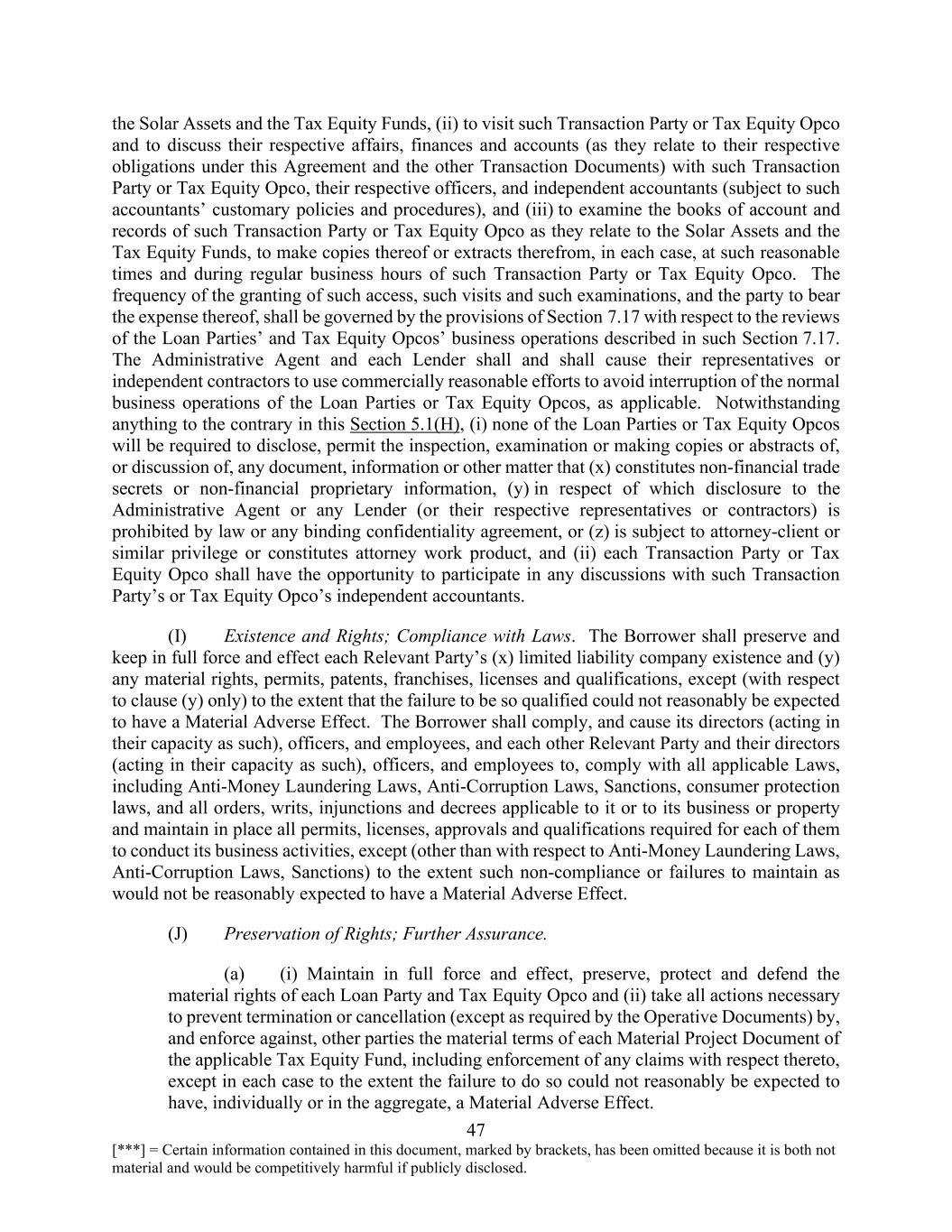 47 [***] = Certain information contained in this document, marked by brackets, has been omitted because it is both not material and would be competitively harmful if publicly disclosed. the Solar Assets and the Tax Equity Funds, (ii) to visit such Transaction Party or Tax Equity Opco and to discuss their respective affairs, finances and accounts (as they relate to their respective obligations under this Agreement and the other Transaction Documents) with such Transaction Party or Tax Equity Opco, their respective officers, and independent accountants (subject to such accountants’ customary policies and procedures), and (iii) to examine the books of account and records of such Transaction Party or Tax Equity Opco as they relate to the Solar Assets and the Tax Equity Funds, to make copies thereof or extracts therefrom, in each case, at such reasonable times and during regular business hours of such Transaction Party or Tax Equity Opco. The frequency of the granting of such access, such visits and such examinations, and the party to bear the expense thereof, shall be governed by the provisions of Section 7.17 with respect to the reviews of the Loan Parties’ and Tax Equity Opcos’ business operations described in such Section 7.17. The Administrative Agent and each Lender shall and shall cause their representatives or independent contractors to use commercially reasonable efforts to avoid interruption of the normal business operations of the Loan Parties or Tax Equity Opcos, as applicable. Notwithstanding anything to the contrary in this Section 5.1(H), (i) none of the Loan Parties or Tax Equity Opcos will be required to disclose, permit the inspection, examination or making copies or abstracts of, or discussion of, any document, information or other matter that (x) constitutes non-financial trade secrets or non-financial proprietary information, (y) in respect of which disclosure to the Administrative Agent or any Lender (or their respective representatives or contractors) is prohibited by law or any binding confidentiality agreement, or (z) is subject to attorney-client or similar privilege or constitutes attorney work product, and (ii) each Transaction Party or Tax Equity Opco shall have the opportunity to participate in any discussions with such Transaction Party’s or Tax Equity Opco’s independent accountants. (I) Existence and Rights; Compliance with Laws. The Borrower shall preserve and keep in full force and effect each Relevant Party’s (x) limited liability company existence and (y) any material rights, permits, patents, franchises, licenses and qualifications, except (with respect to clause (y) only) to the extent that the failure to be so qualified could not reasonably be expected to have a Material Adverse Effect. The Borrower shall comply, and cause its directors (acting in their capacity as such), officers, and employees, and each other Relevant Party and their directors (acting in their capacity as such), officers, and employees to, comply with all applicable Laws, including Anti-Money Laundering Laws, Anti-Corruption Laws, Sanctions, consumer protection laws, and all orders, writs, injunctions and decrees applicable to it or to its business or property and maintain in place all permits, licenses, approvals and qualifications required for each of them to conduct its business activities, except (other than with respect to Anti-Money Laundering Laws, Anti-Corruption Laws, Sanctions) to the extent such non-compliance or failures to maintain as would not be reasonably expected to have a Material Adverse Effect. (J) Preservation of Rights; Further Assurance. (a) (i) Maintain in full force and effect, preserve, protect and defend the material rights of each Loan Party and Tax Equity Opco and (ii) take all actions necessary to prevent termination or cancellation (except as required by the Operative Documents) by, and enforce against, other parties the material terms of each Material Project Document of the applicable Tax Equity Fund, including enforcement of any claims with respect thereto, except in each case to the extent the failure to do so could not reasonably be expected to have, individually or in the aggregate, a Material Adverse Effect.