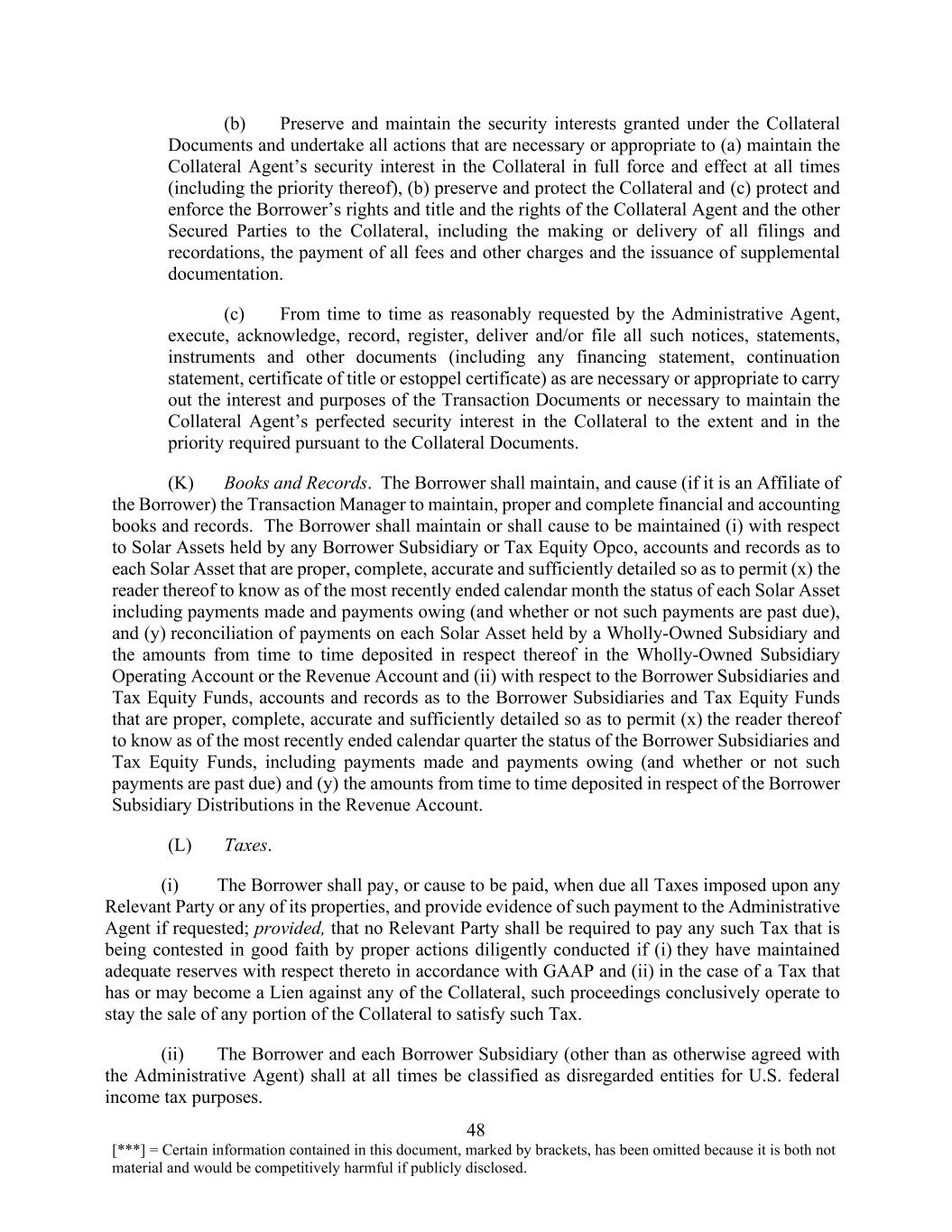 48 [***] = Certain information contained in this document, marked by brackets, has been omitted because it is both not material and would be competitively harmful if publicly disclosed. (b) Preserve and maintain the security interests granted under the Collateral Documents and undertake all actions that are necessary or appropriate to (a) maintain the Collateral Agent’s security interest in the Collateral in full force and effect at all times (including the priority thereof), (b) preserve and protect the Collateral and (c) protect and enforce the Borrower’s rights and title and the rights of the Collateral Agent and the other Secured Parties to the Collateral, including the making or delivery of all filings and recordations, the payment of all fees and other charges and the issuance of supplemental documentation. (c) From time to time as reasonably requested by the Administrative Agent, execute, acknowledge, record, register, deliver and/or file all such notices, statements, instruments and other documents (including any financing statement, continuation statement, certificate of title or estoppel certificate) as are necessary or appropriate to carry out the interest and purposes of the Transaction Documents or necessary to maintain the Collateral Agent’s perfected security interest in the Collateral to the extent and in the priority required pursuant to the Collateral Documents. (K) Books and Records. The Borrower shall maintain, and cause (if it is an Affiliate of the Borrower) the Transaction Manager to maintain, proper and complete financial and accounting books and records. The Borrower shall maintain or shall cause to be maintained (i) with respect to Solar Assets held by any Borrower Subsidiary or Tax Equity Opco, accounts and records as to each Solar Asset that are proper, complete, accurate and sufficiently detailed so as to permit (x) the reader thereof to know as of the most recently ended calendar month the status of each Solar Asset including payments made and payments owing (and whether or not such payments are past due), and (y) reconciliation of payments on each Solar Asset held by a Wholly-Owned Subsidiary and the amounts from time to time deposited in respect thereof in the Wholly-Owned Subsidiary Operating Account or the Revenue Account and (ii) with respect to the Borrower Subsidiaries and Tax Equity Funds, accounts and records as to the Borrower Subsidiaries and Tax Equity Funds that are proper, complete, accurate and sufficiently detailed so as to permit (x) the reader thereof to know as of the most recently ended calendar quarter the status of the Borrower Subsidiaries and Tax Equity Funds, including payments made and payments owing (and whether or not such payments are past due) and (y) the amounts from time to time deposited in respect of the Borrower Subsidiary Distributions in the Revenue Account. (L) Taxes. (i) The Borrower shall pay, or cause to be paid, when due all Taxes imposed upon any Relevant Party or any of its properties, and provide evidence of such payment to the Administrative Agent if requested; provided, that no Relevant Party shall be required to pay any such Tax that is being contested in good faith by proper actions diligently conducted if (i) they have maintained adequate reserves with respect thereto in accordance with GAAP and (ii) in the case of a Tax that has or may become a Lien against any of the Collateral, such proceedings conclusively operate to stay the sale of any portion of the Collateral to satisfy such Tax. (ii) The Borrower and each Borrower Subsidiary (other than as otherwise agreed with the Administrative Agent) shall at all times be classified as disregarded entities for U.S. federal income tax purposes.
