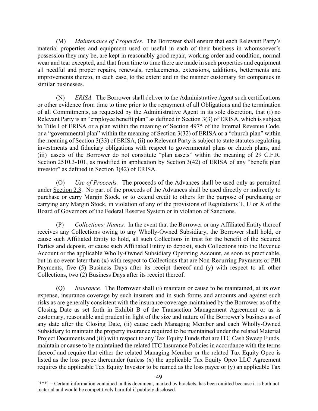 49 [***] = Certain information contained in this document, marked by brackets, has been omitted because it is both not material and would be competitively harmful if publicly disclosed. (M) Maintenance of Properties. The Borrower shall ensure that each Relevant Party’s material properties and equipment used or useful in each of their business in whomsoever’s possession they may be, are kept in reasonably good repair, working order and condition, normal wear and tear excepted, and that from time to time there are made in such properties and equipment all needful and proper repairs, renewals, replacements, extensions, additions, betterments and improvements thereto, in each case, to the extent and in the manner customary for companies in similar businesses. (N) ERISA. The Borrower shall deliver to the Administrative Agent such certifications or other evidence from time to time prior to the repayment of all Obligations and the termination of all Commitments, as requested by the Administrative Agent in its sole discretion, that (i) no Relevant Party is an “employee benefit plan” as defined in Section 3(3) of ERISA, which is subject to Title I of ERISA or a plan within the meaning of Section 4975 of the Internal Revenue Code, or a “governmental plan” within the meaning of Section 3(32) of ERISA or a “church plan” within the meaning of Section 3(33) of ERISA, (ii) no Relevant Party is subject to state statutes regulating investments and fiduciary obligations with respect to governmental plans or church plans, and (iii) assets of the Borrower do not constitute “plan assets” within the meaning of 29 C.F.R. Section 2510.3-101, as modified in application by Section 3(42) of ERISA of any “benefit plan investor” as defined in Section 3(42) of ERISA. (O) Use of Proceeds. The proceeds of the Advances shall be used only as permitted under Section 2.3. No part of the proceeds of the Advances shall be used directly or indirectly to purchase or carry Margin Stock, or to extend credit to others for the purpose of purchasing or carrying any Margin Stock, in violation of any of the provisions of Regulations T, U or X of the Board of Governors of the Federal Reserve System or in violation of Sanctions. (P) Collections; Names. In the event that the Borrower or any Affiliated Entity thereof receives any Collections owing to any Wholly-Owned Subsidiary, the Borrower shall hold, or cause such Affiliated Entity to hold, all such Collections in trust for the benefit of the Secured Parties and deposit, or cause such Affiliated Entity to deposit, such Collections into the Revenue Account or the applicable Wholly-Owned Subsidiary Operating Account, as soon as practicable, but in no event later than (x) with respect to Collections that are Non-Recurring Payments or PBI Payments, five (5) Business Days after its receipt thereof and (y) with respect to all other Collections, two (2) Business Days after its receipt thereof. (Q) Insurance. The Borrower shall (i) maintain or cause to be maintained, at its own expense, insurance coverage by such insurers and in such forms and amounts and against such risks as are generally consistent with the insurance coverage maintained by the Borrower as of the Closing Date as set forth in Exhibit B of the Transaction Management Agreement or as is customary, reasonable and prudent in light of the size and nature of the Borrower’s business as of any date after the Closing Date, (ii) cause each Managing Member and each Wholly-Owned Subsidiary to maintain the property insurance required to be maintained under the related Material Project Documents and (iii) with respect to any Tax Equity Funds that are ITC Cash Sweep Funds, maintain or cause to be maintained the related ITC Insurance Policies in accordance with the terms thereof and require that either the related Managing Member or the related Tax Equity Opco is listed as the loss payee thereunder (unless (x) the applicable Tax Equity Opco LLC Agreement requires the applicable Tax Equity Investor to be named as the loss payee or (y) an applicable Tax